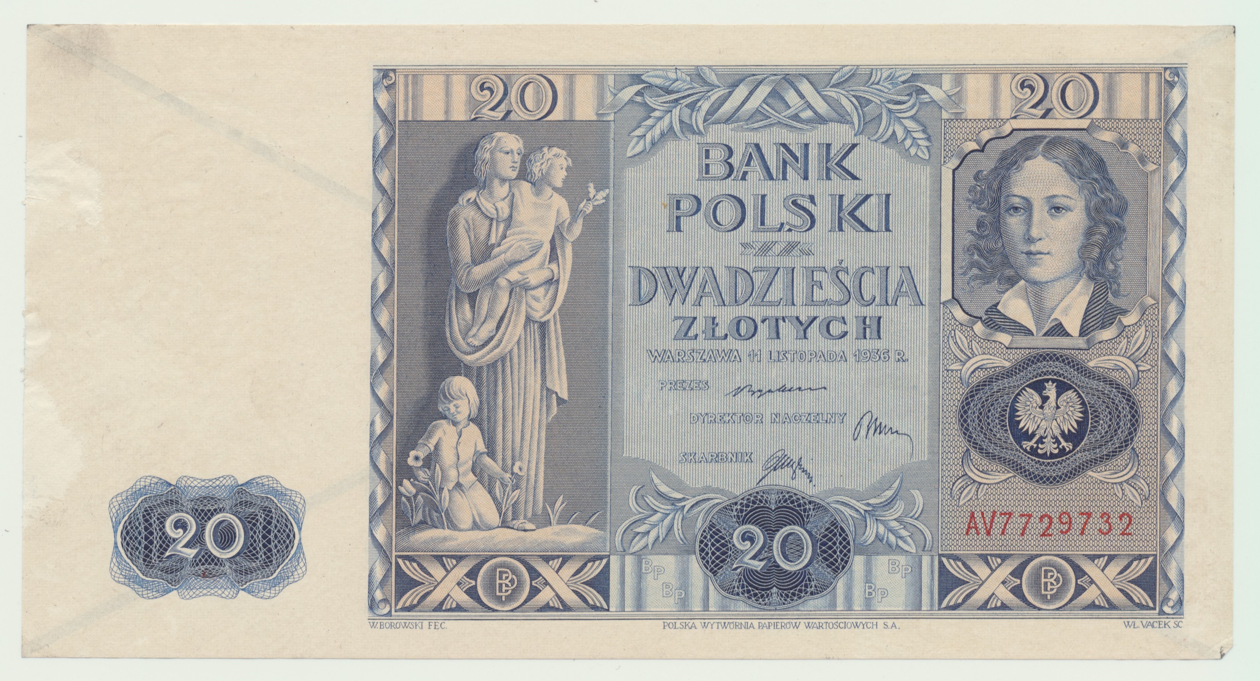 Okupacja, 20 złotych 1936, egzemplarz okazowy, rewers nadruk skreślenie, rzadkość