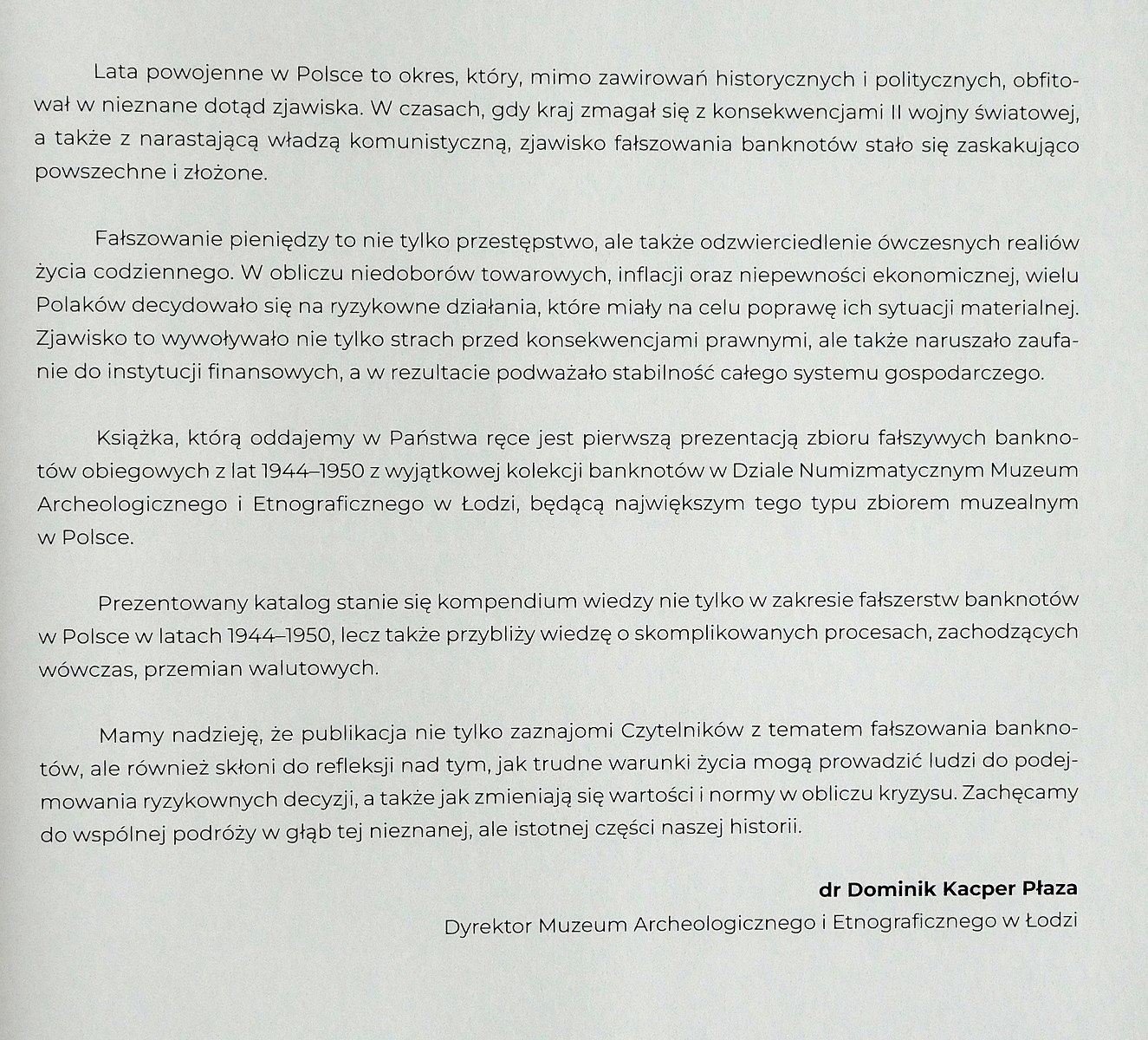 Publikacja w formie katalogu, wydana drukiem, dotycząca najliczniejszego w Polsce muzealnego zbioru fałszerstw banknotów polskich z lat 1944-1950, będących częścią zbiorów pieniądza papierowego Działu Numizmatycznego Muzeum Archeologicznego i Etnograficznego miasta Łodzi.