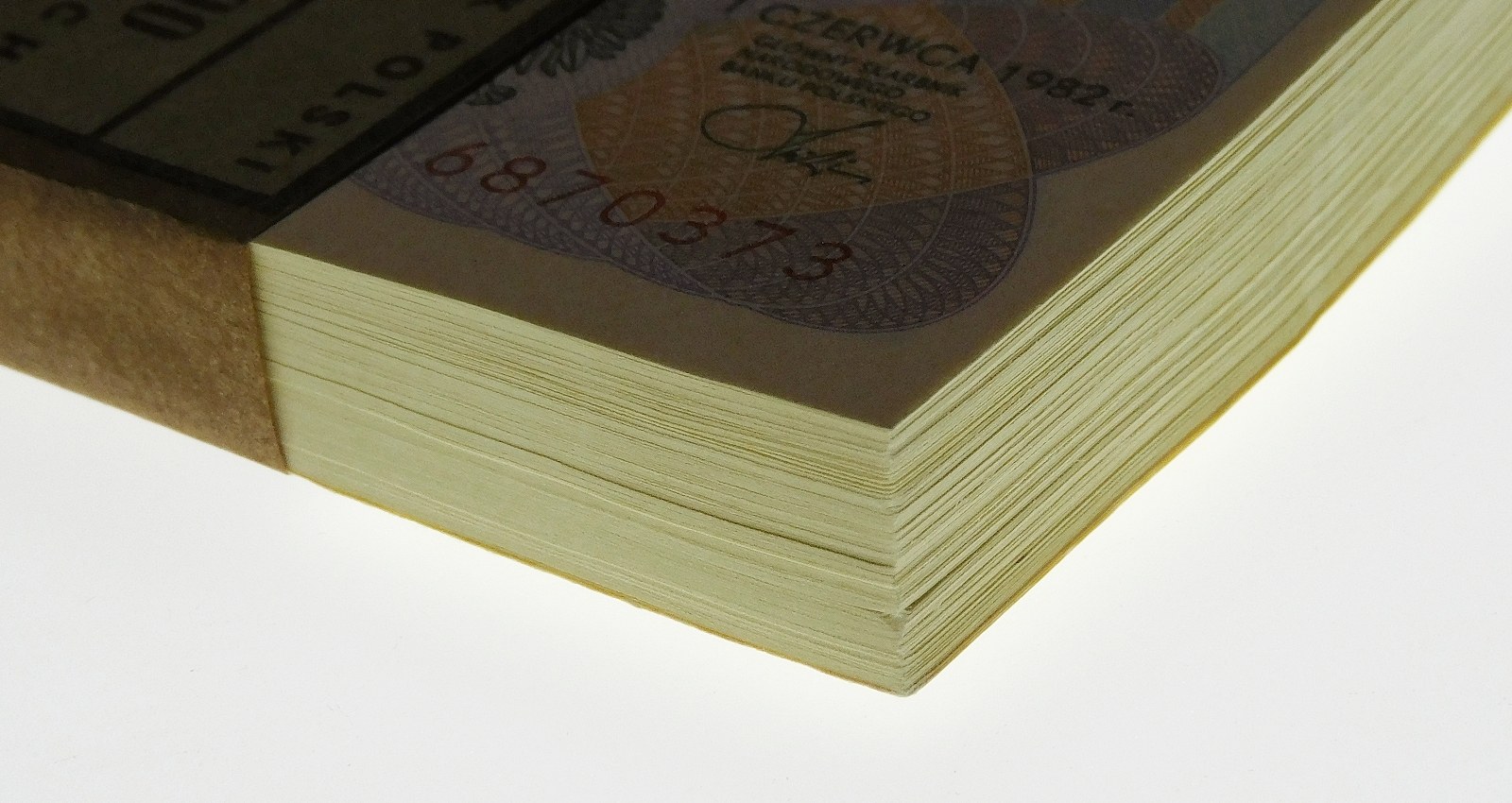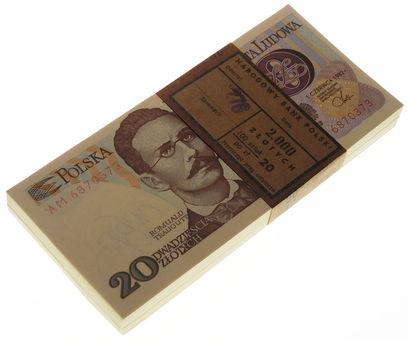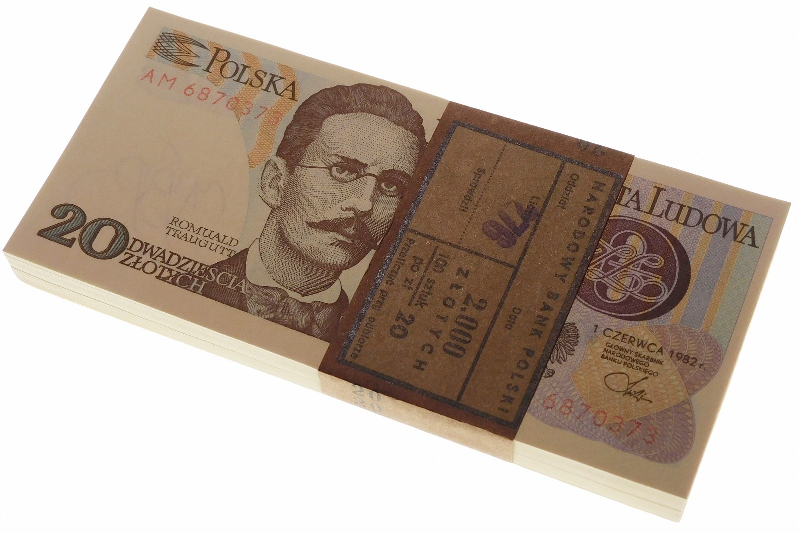 Oryginalna paczka bankowa zawierająca 100 sztuk banknotów 20 złotych 1982, serii AM - numeracja w paczce sekwencjami kolejna.