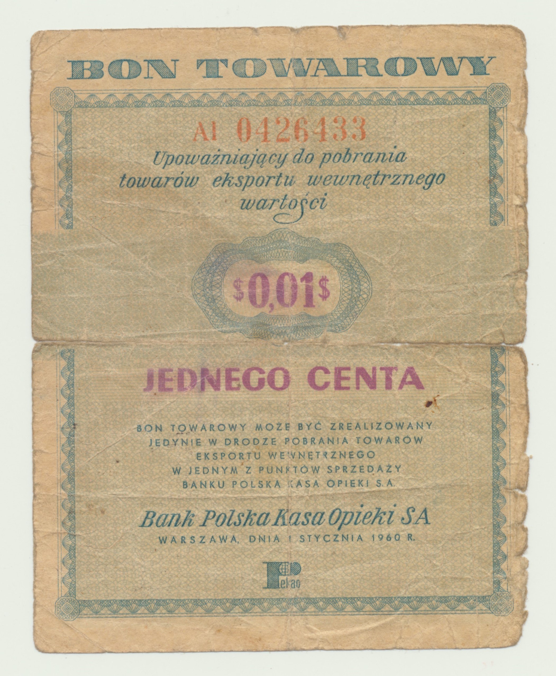 Pewex Bon Towarowy, 1 cent 1960, ser. Al, bez klauzuli