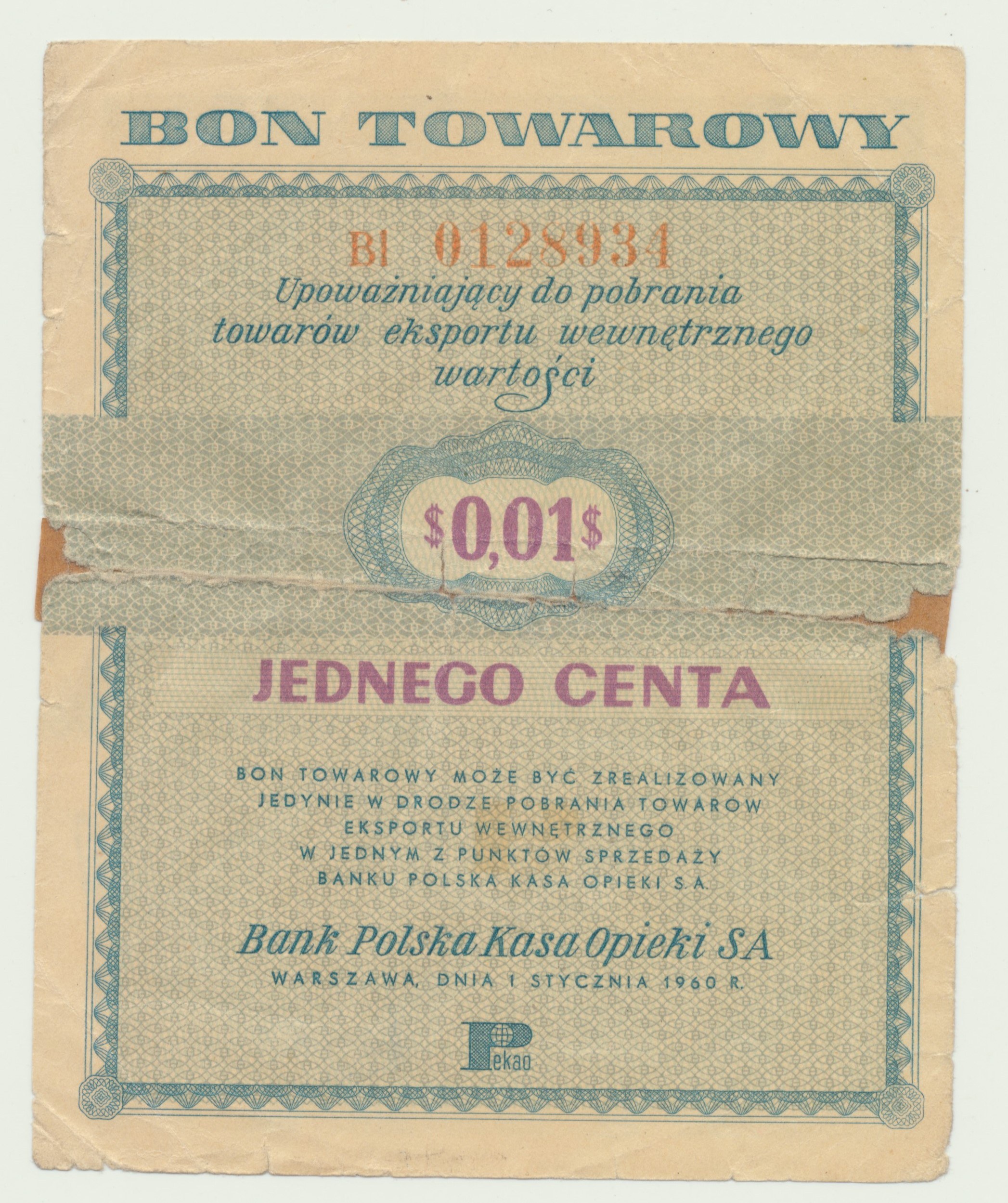 Pewex Bon Towarowy, 1 cent 1960, ser. Bl, bez klauzuli