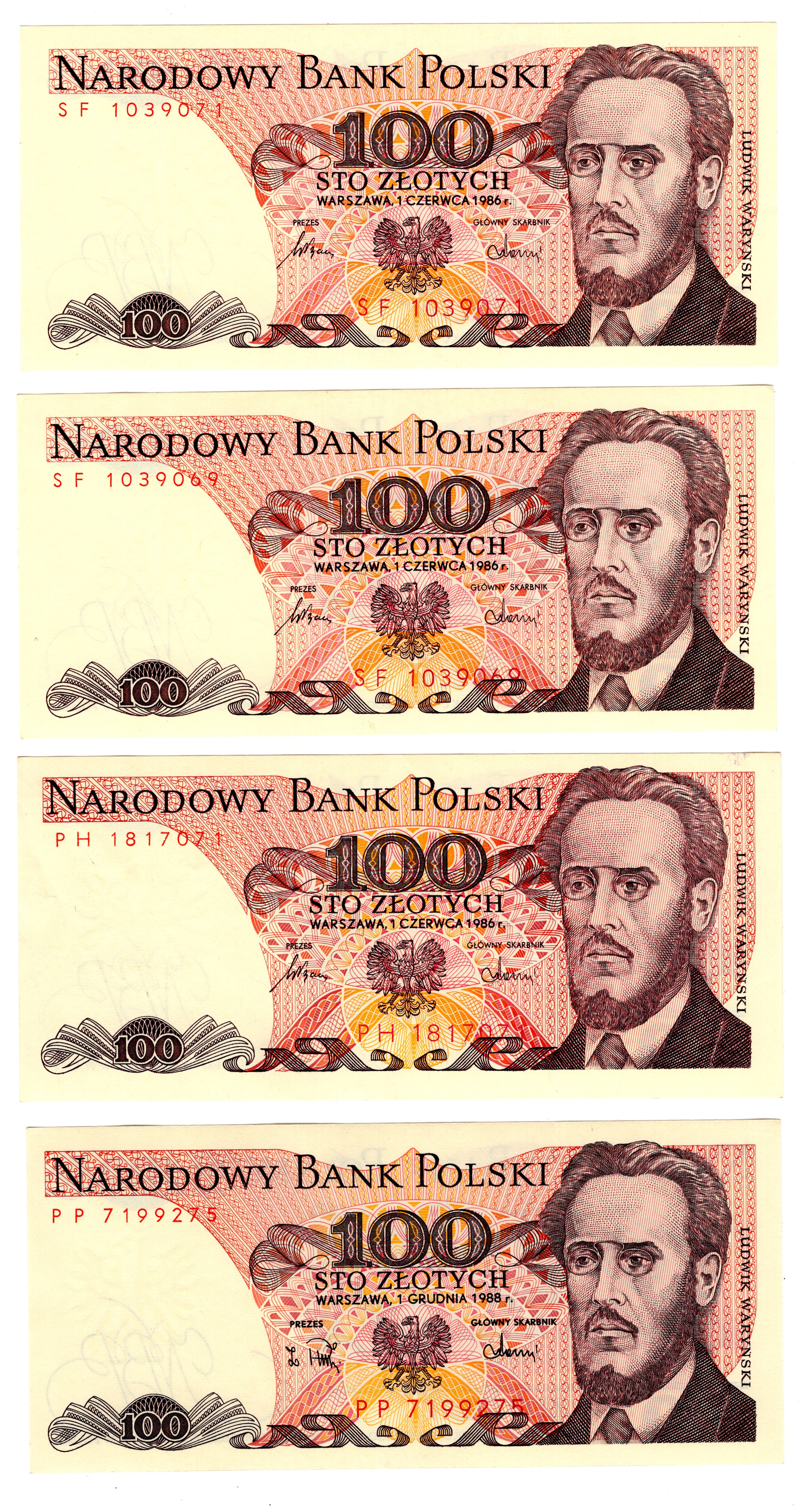 Polska, PRL, 100 złotych 1986,1988, seria SF, SF, PH, PP - zestaw 4 sztuk