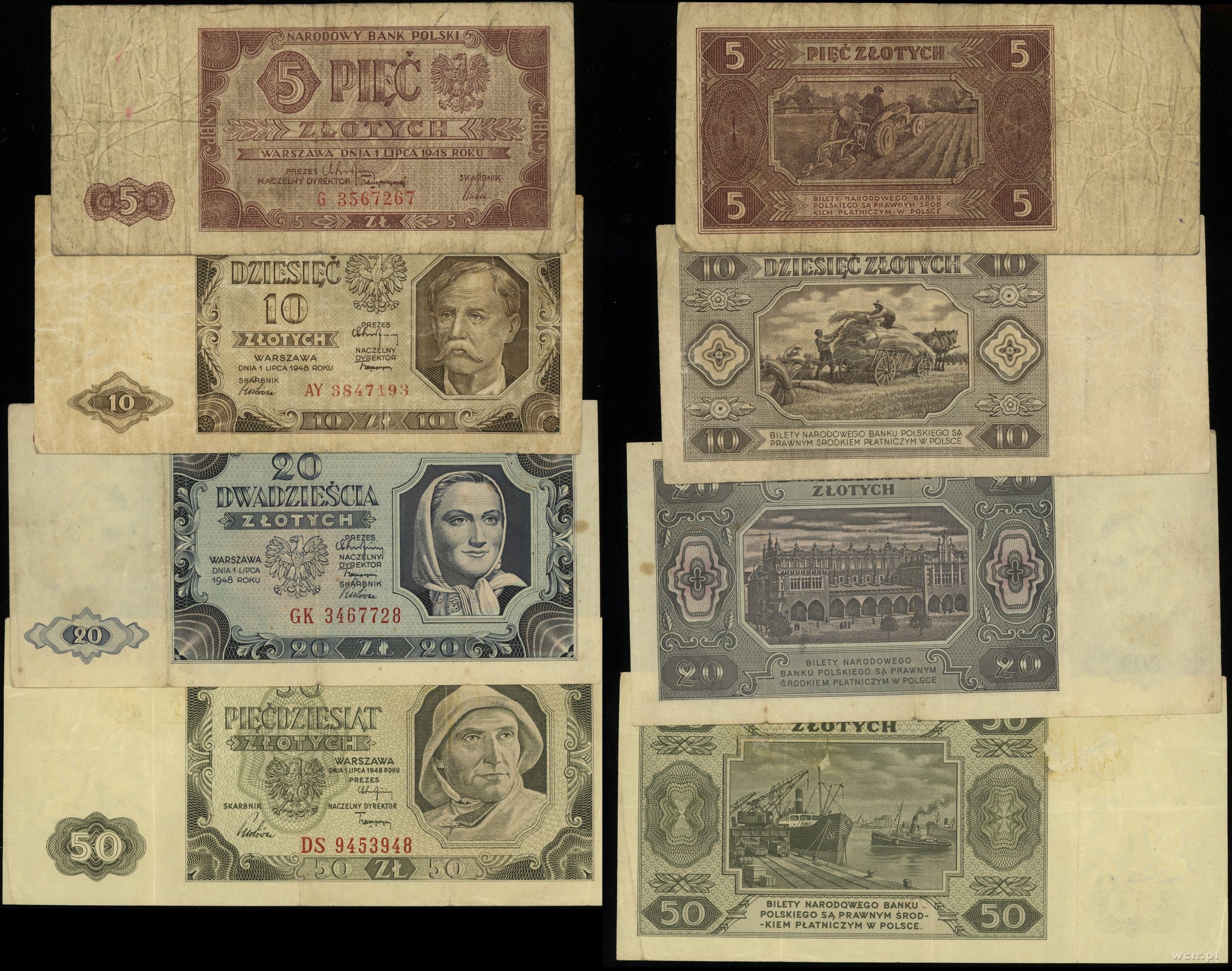 1 x 5 złotych seria G (V), 1 x 10 złotych seria AY (V), 1 x 20 złotych seria GK (IV), 1 x 50 złotych seria DS (IV)