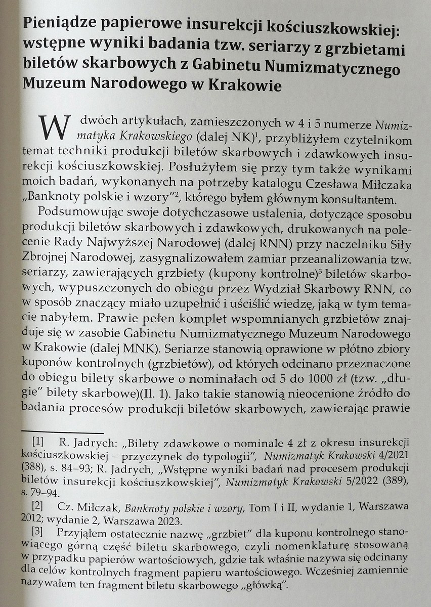- Robert Jadrych: Pieniądze papierowe insurekcji kościuszkowskiej:  wstępne wyniki badań tzw. seriarzy z grzbietami biletów skarbowych z Gabinetu Numizmatycznego Muzeum Narodowego w Krakowie.