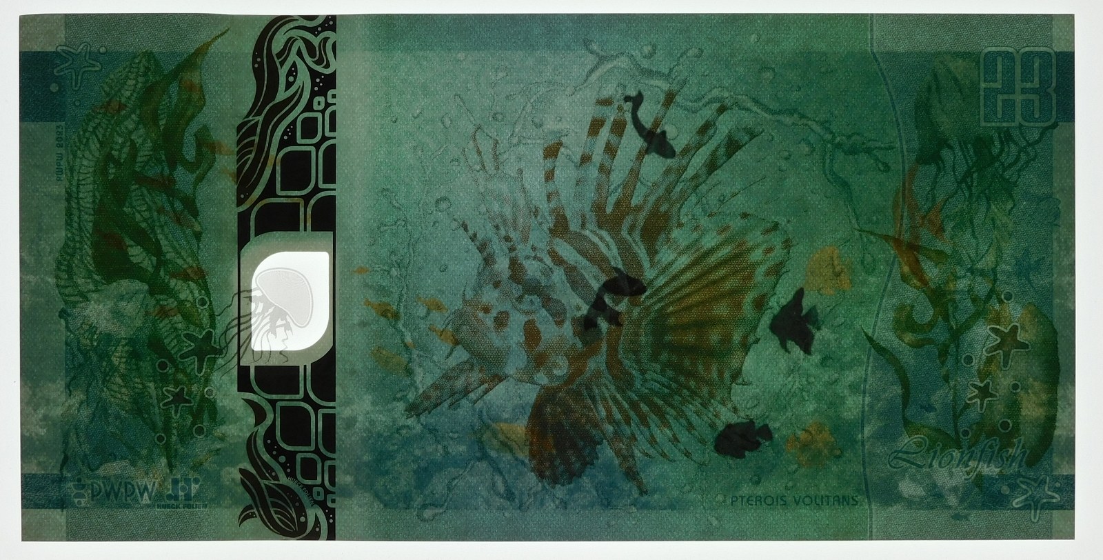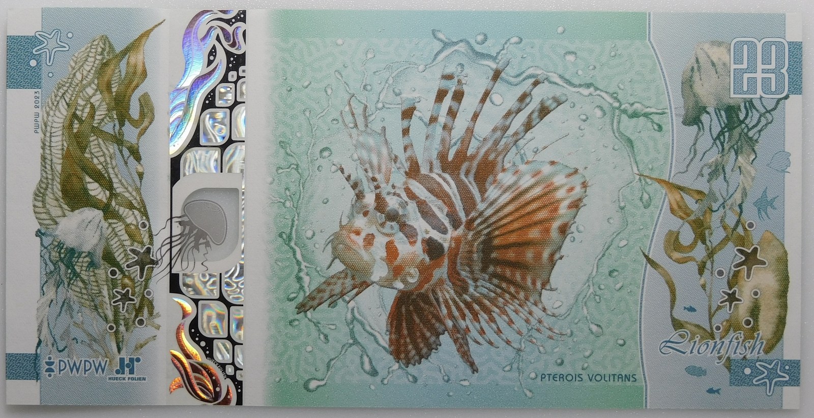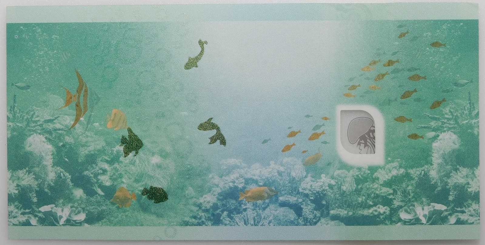 Banknot testowy PWPW - Coral - wyprodukowany we współpracy z Hueck Foilen.