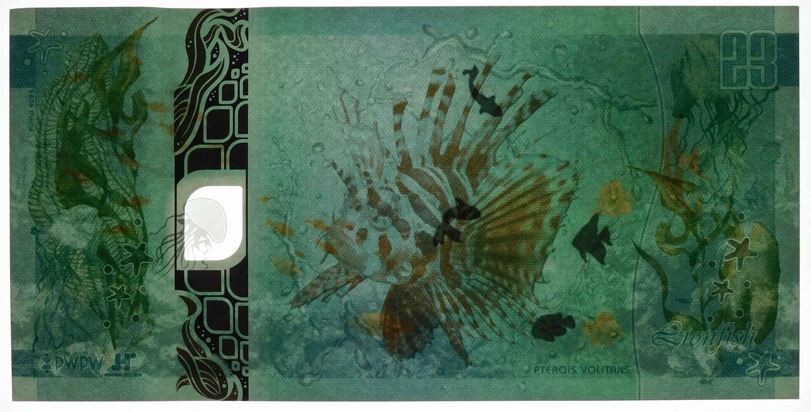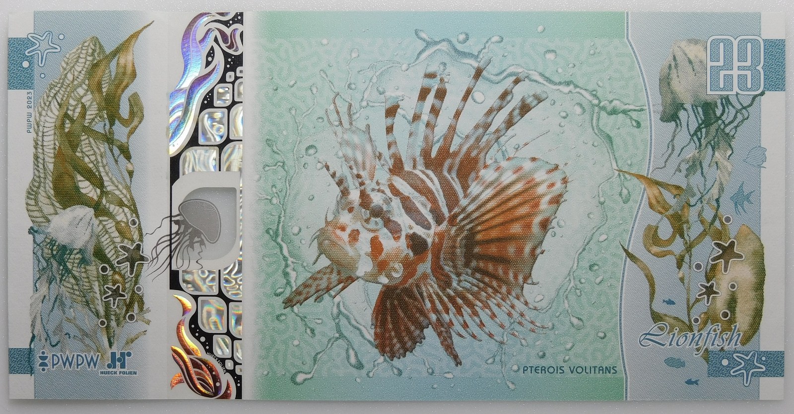 Banknot testowy PWPW - Coral - wyprodukowany we współpracy z Hueck Foilen.