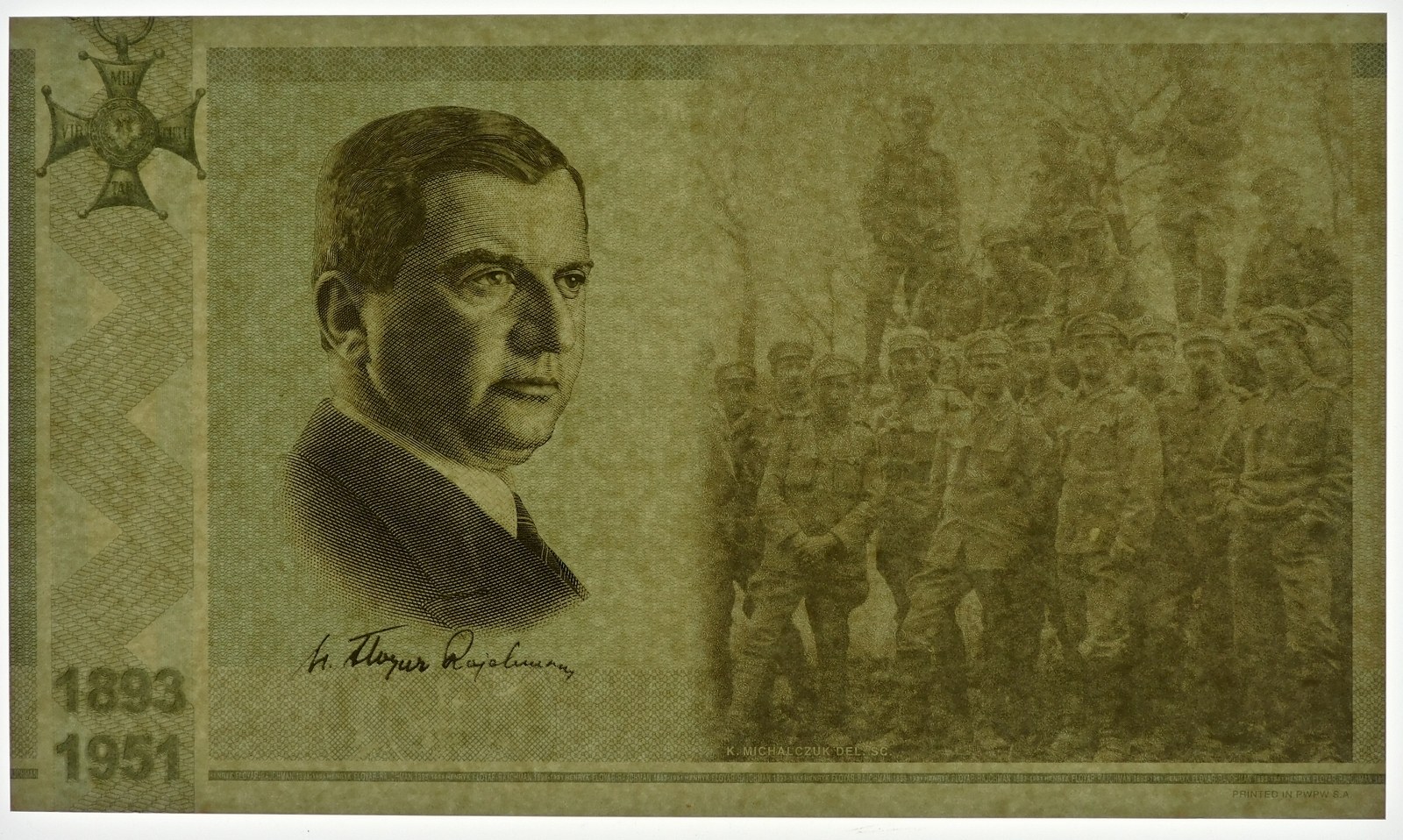 Druk banknotopodobny, jednostronny, dużego formatu 20 x 11,5cm, z zastosowaniem techniku druku wypukłego (staloryt).