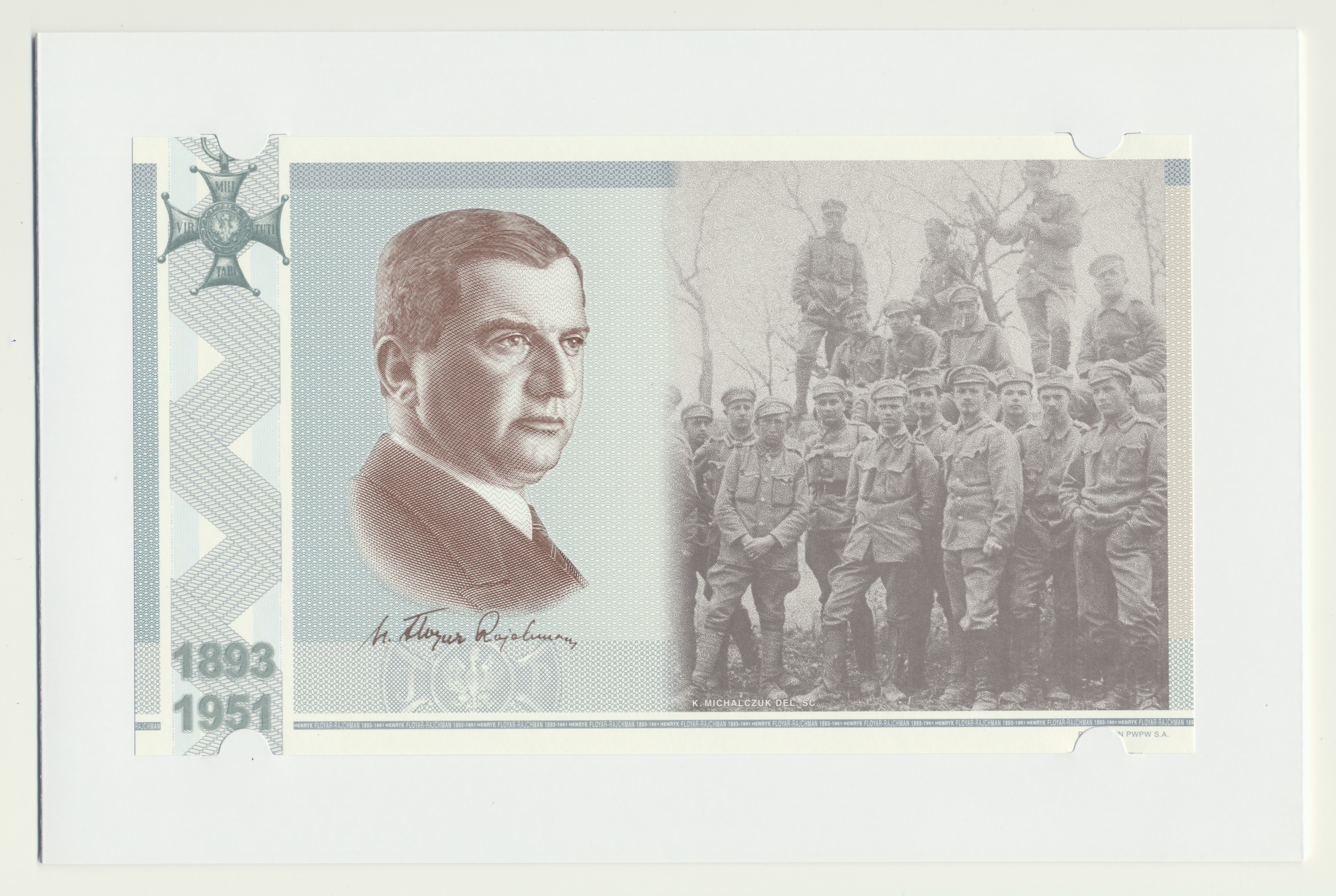 PWPW, mjr. Henryk Floyar-Rajchman. Druk reklamowy dużego formatu, banknotopodobny, jednostronny. Oryginalny folder emisyjny w pergaminowej kopercie. Stan emisyjny