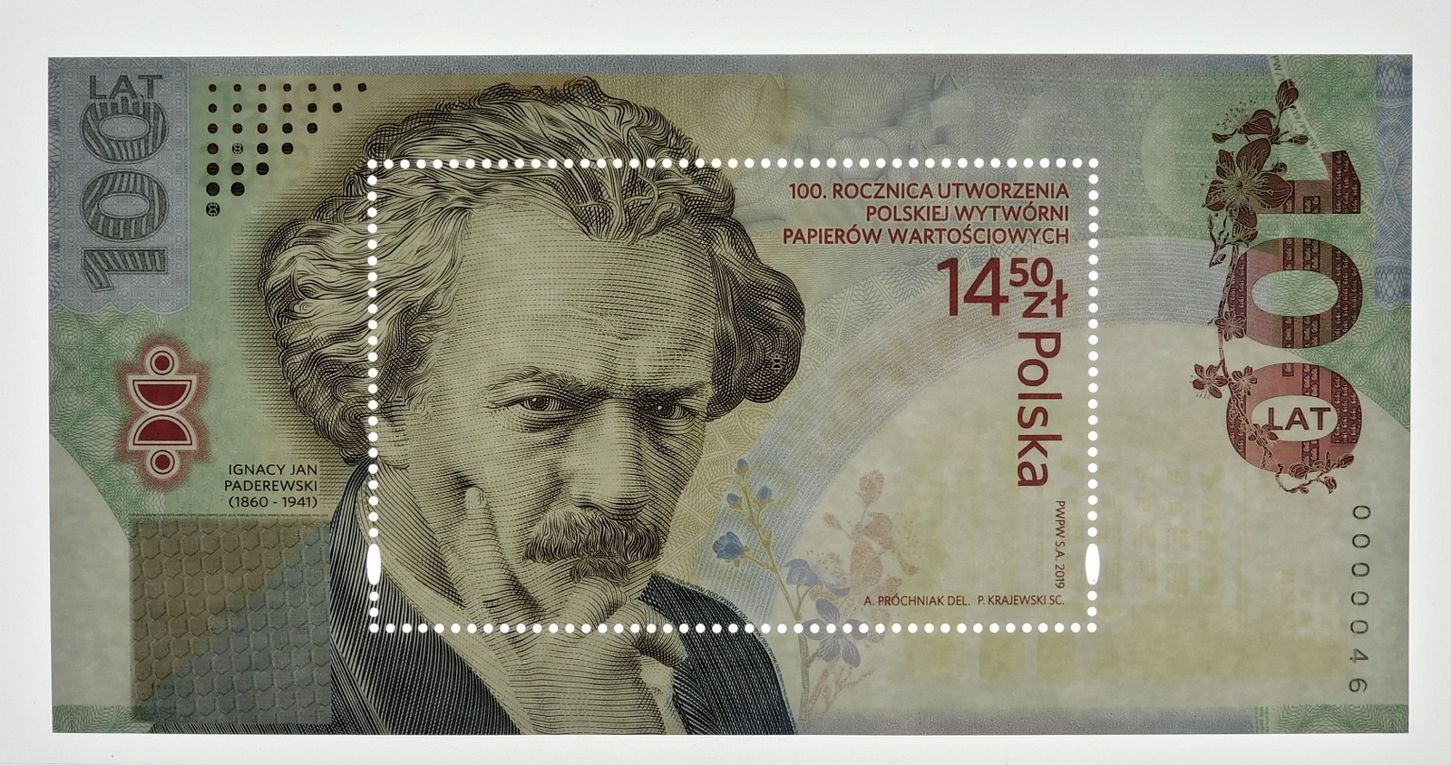 PWPW - Znaczek wydany z okazji 100. rocznicy utworzenia PWPW z Ignacym Paderewskim, niski nr 0000046