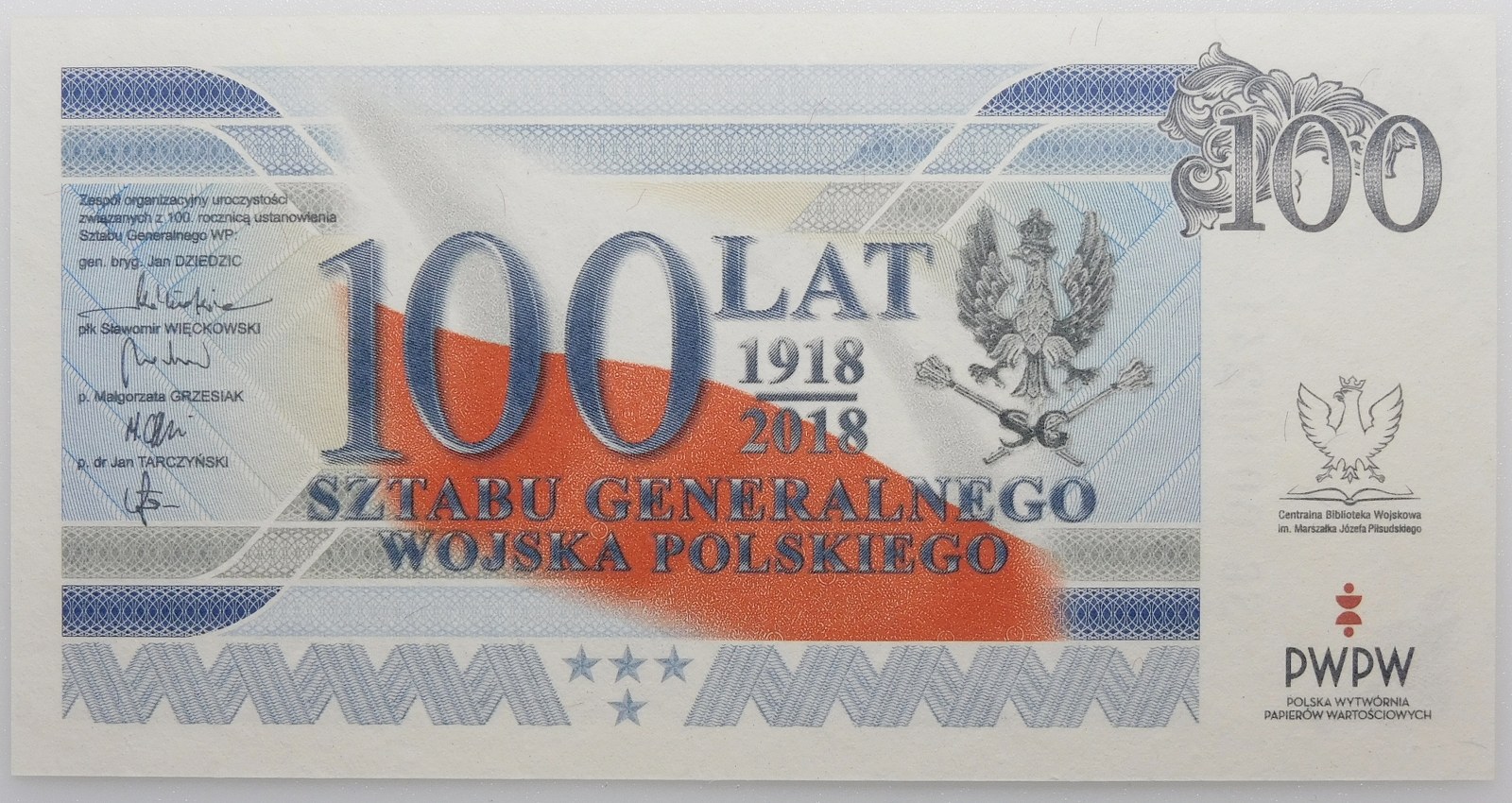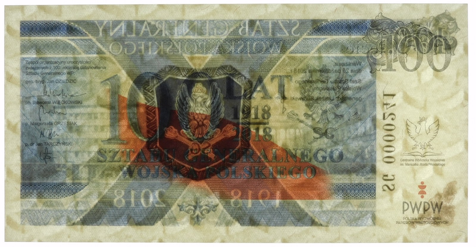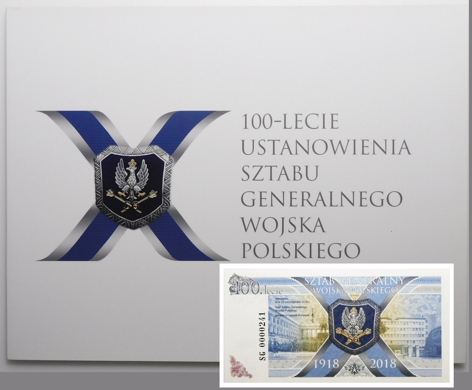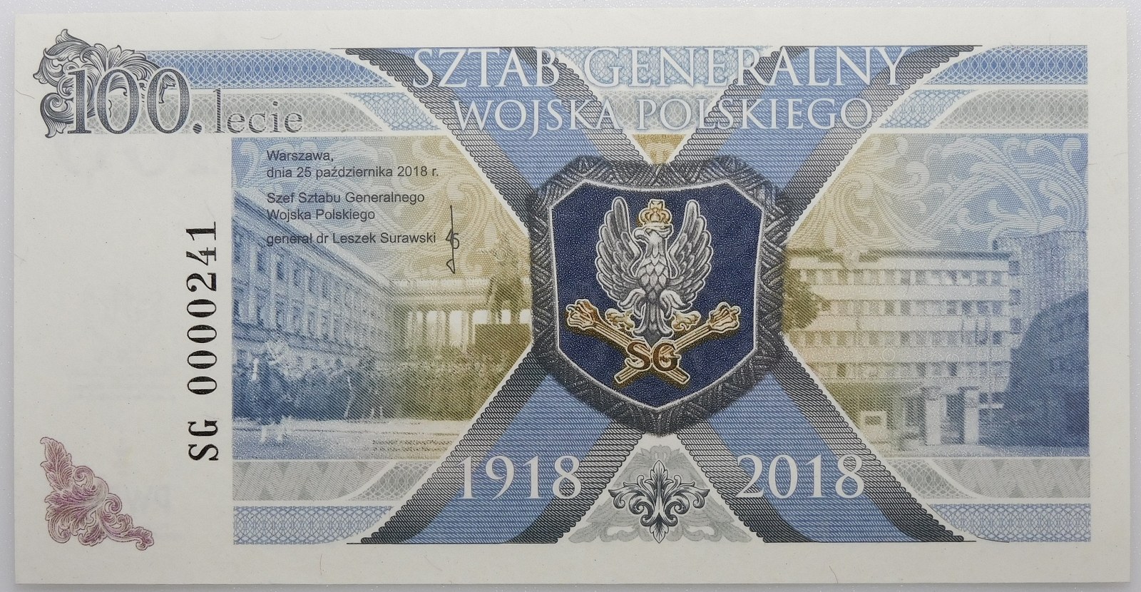Banknot testowy PWPW - 100 lat Sztabu Generalnego Wojska Polskiego - ser. SG 0000241 - wraz z folderem emisyjnym