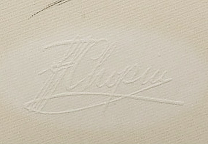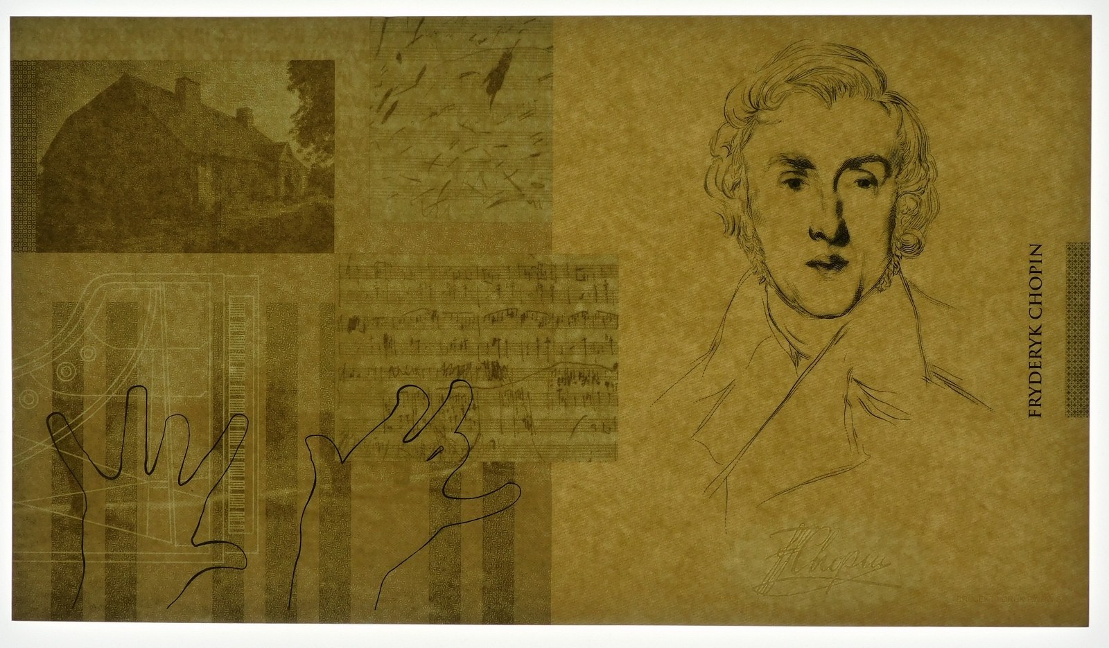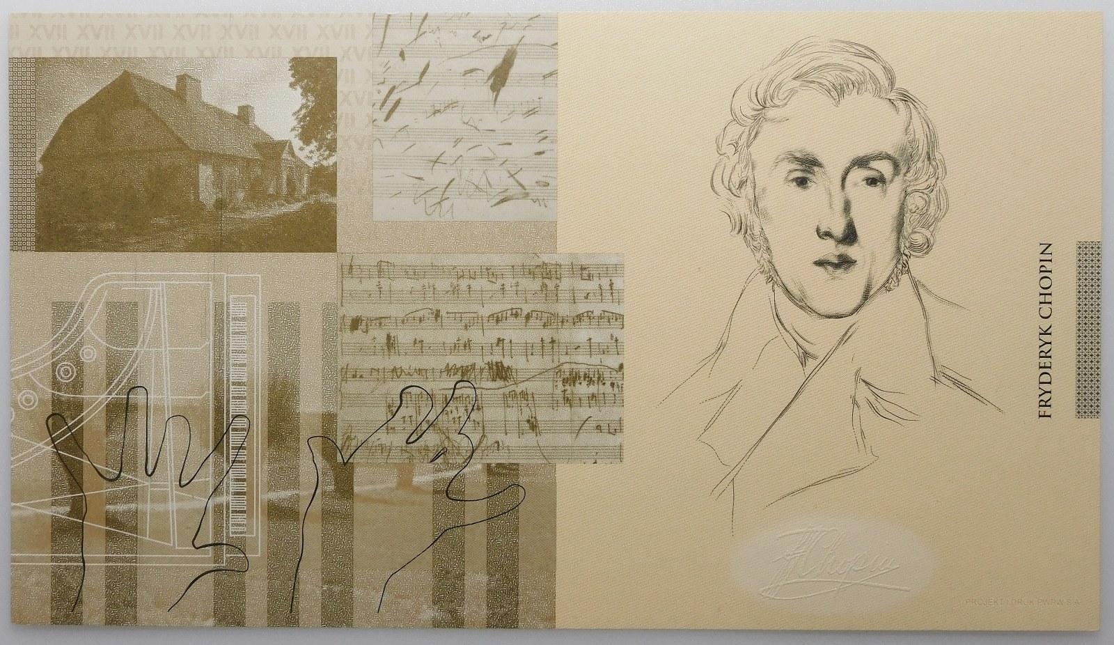 Na druku sucha pieczęć (podpis Fryderyka Chopina), obrys dłoni grających na klawiaturze - wypukły druk stalorytniczy.
