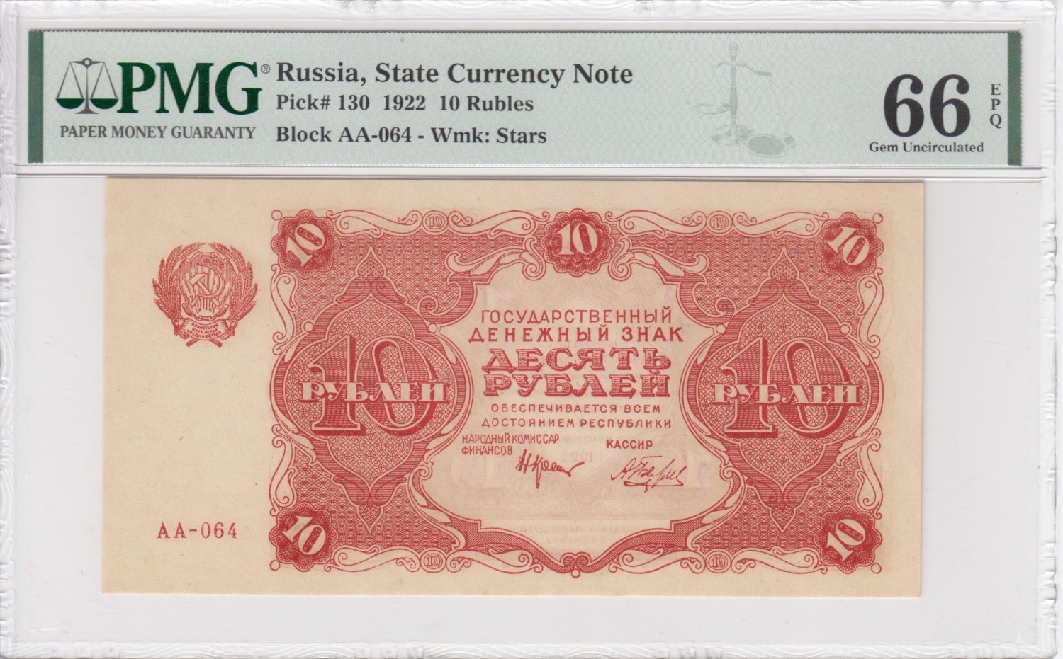 Russia (Currency Note) 10 Rubles 1922 - PMG 66 EPQ Gem Uncirculated