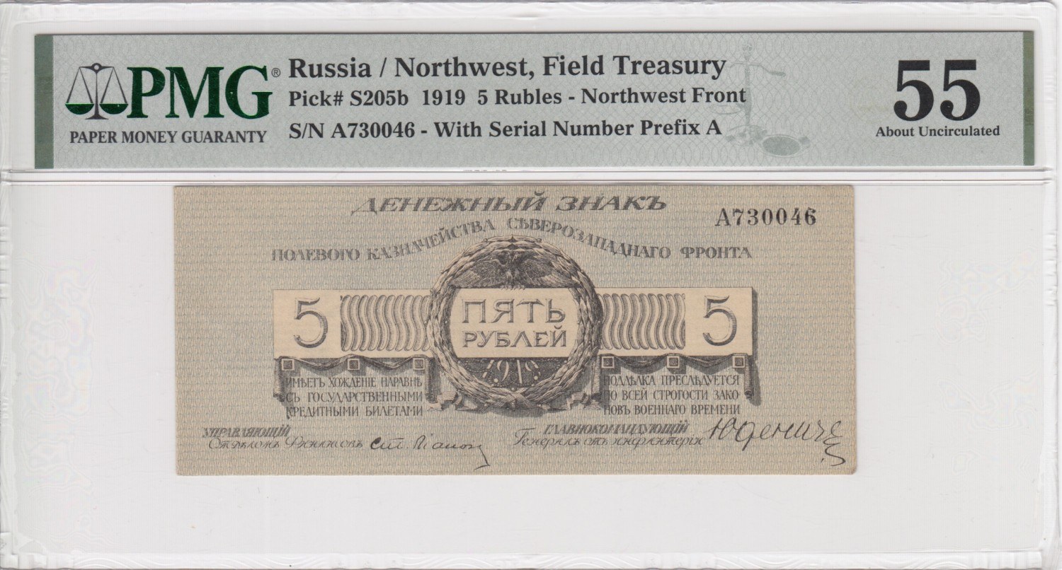 Russia (Northwest Russia) 5 Roubles 1919 - PMG 55 About Uncirculated