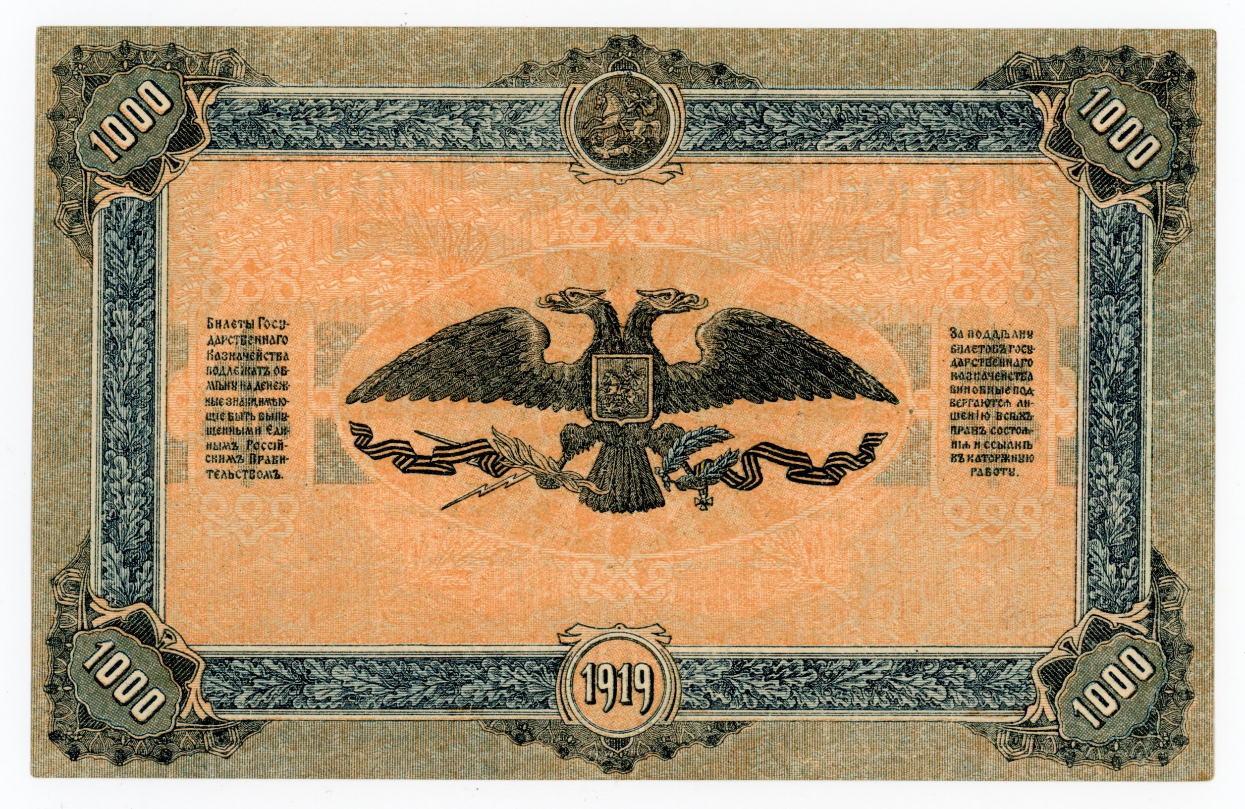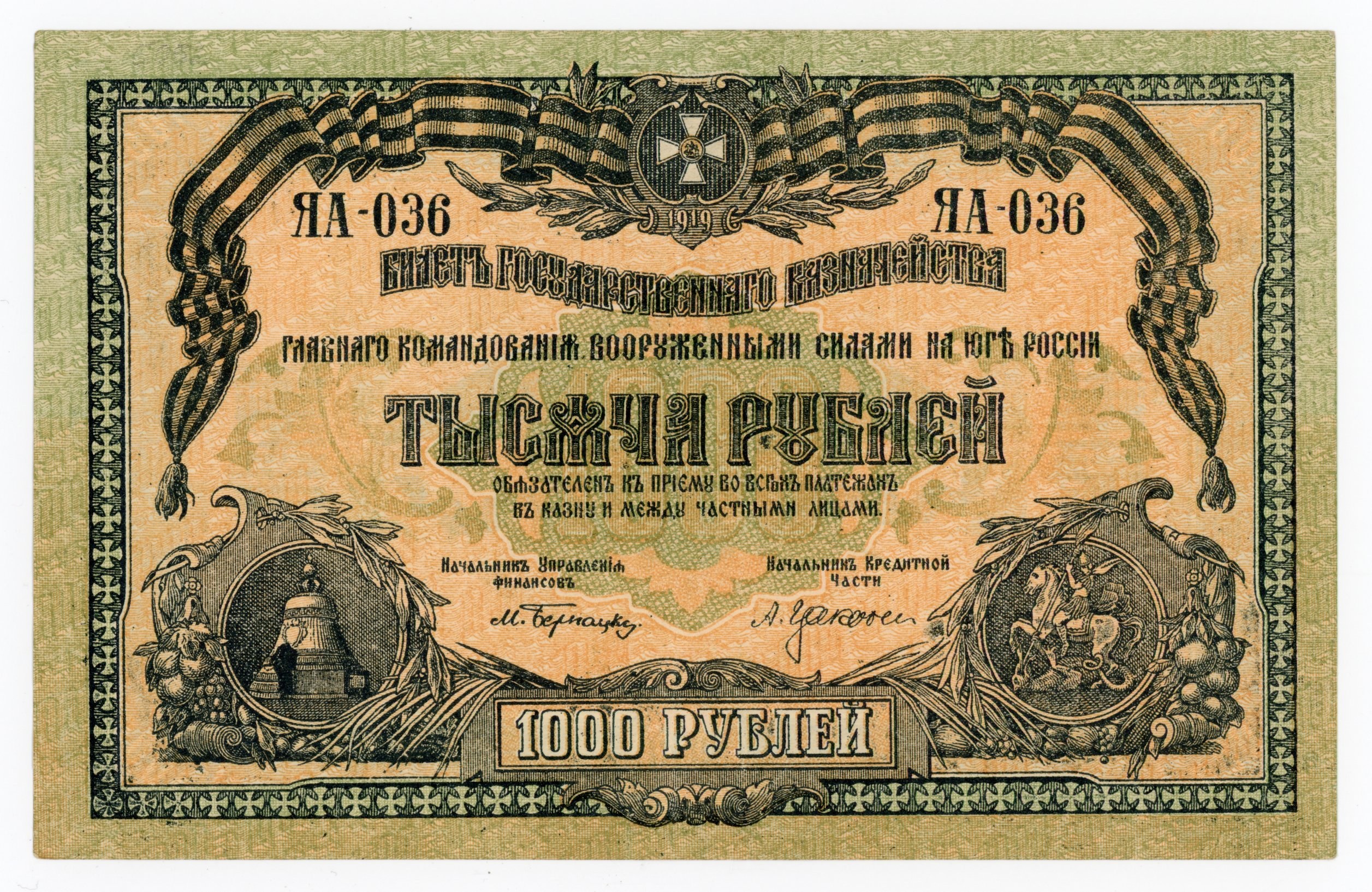 Rosja, Rosja Południowa, 1.000 rubli 1919. Stan zachowania: 2. Jedno pionowe złamanie. Literatura: Pick S424 b
