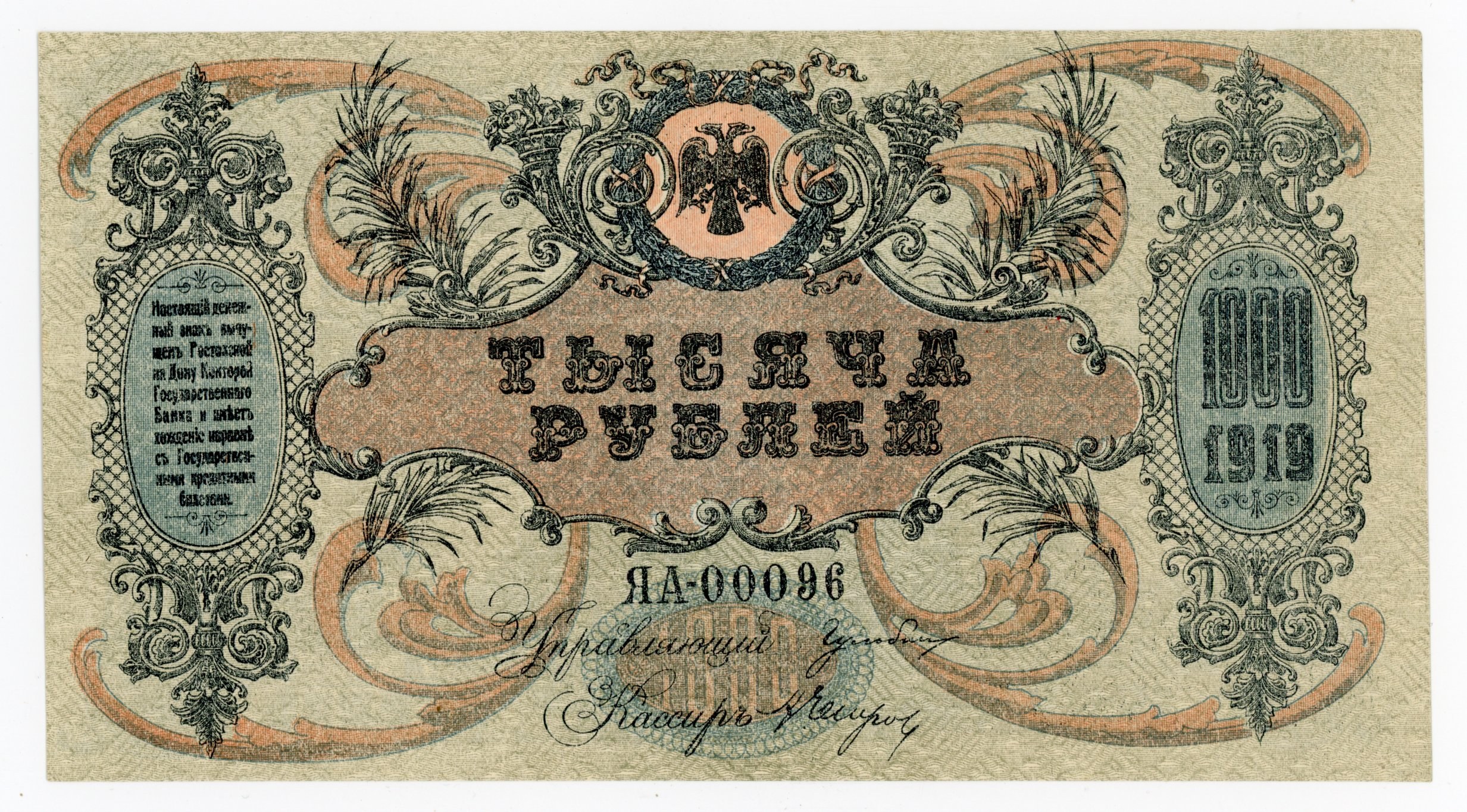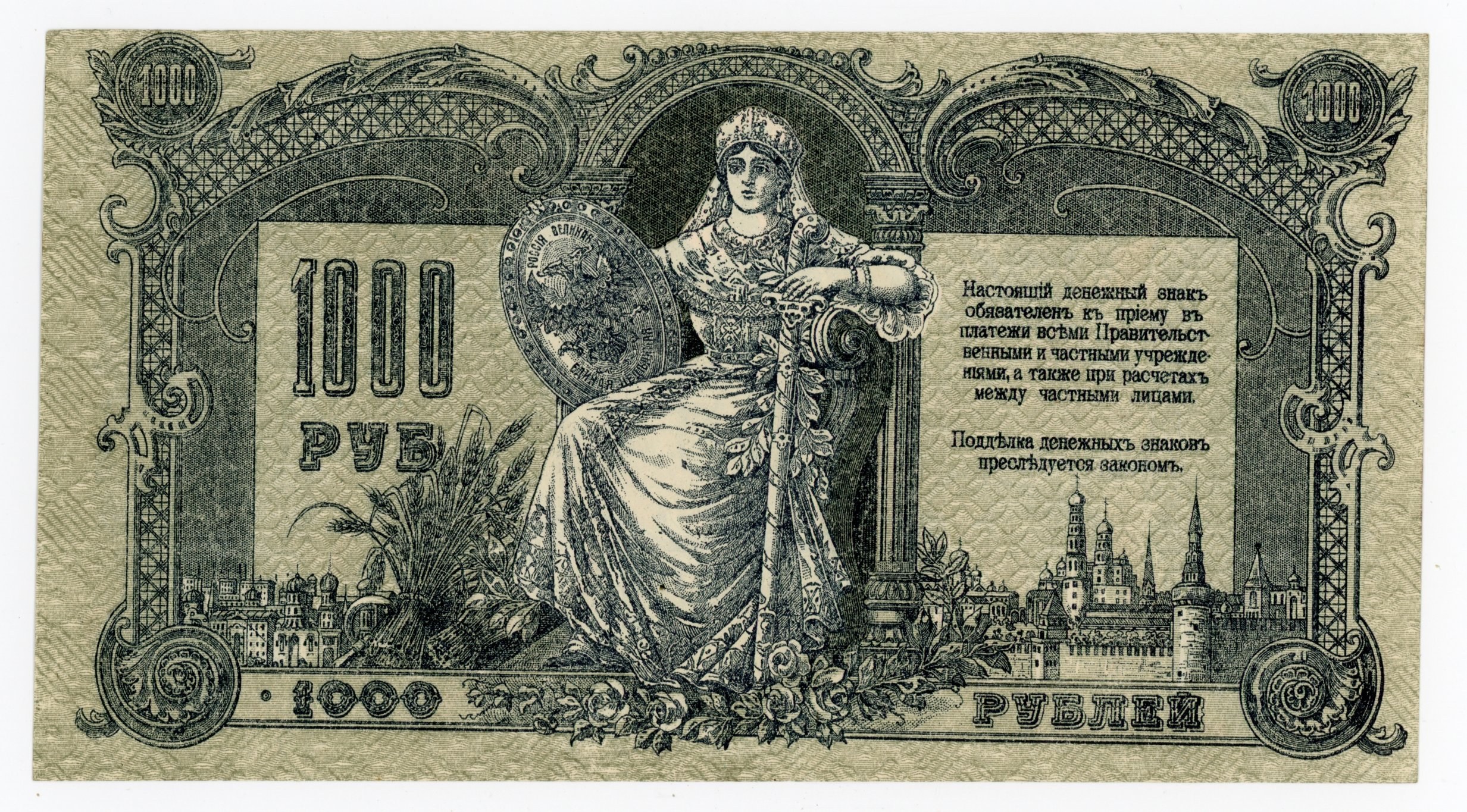 Rosja, Rosja Południowa, 1.000 rubli 1919. Stan zachowania 1/1-. Minus za przytępiony prawy górny róg. Literatura: Pick S418