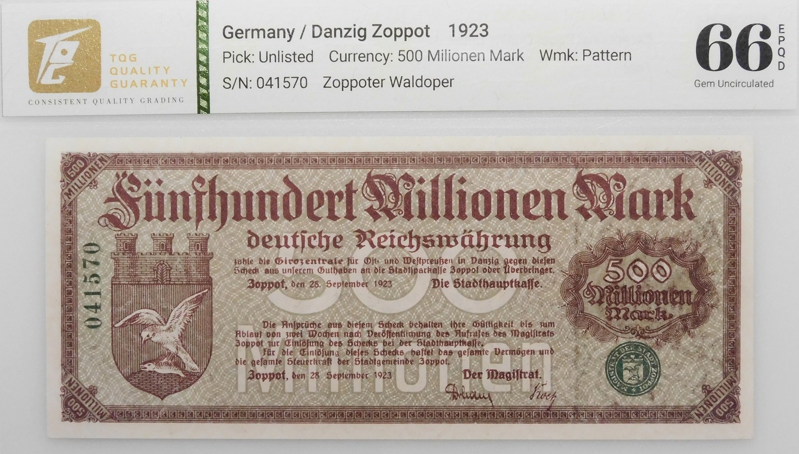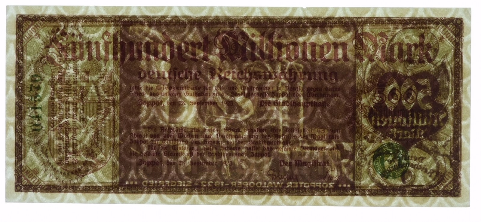 Banknot 500.000.000 marek 1923 - wydany przez Magistrat Miasta Sopot, odmiana z numeratorem bez gwiazdki.