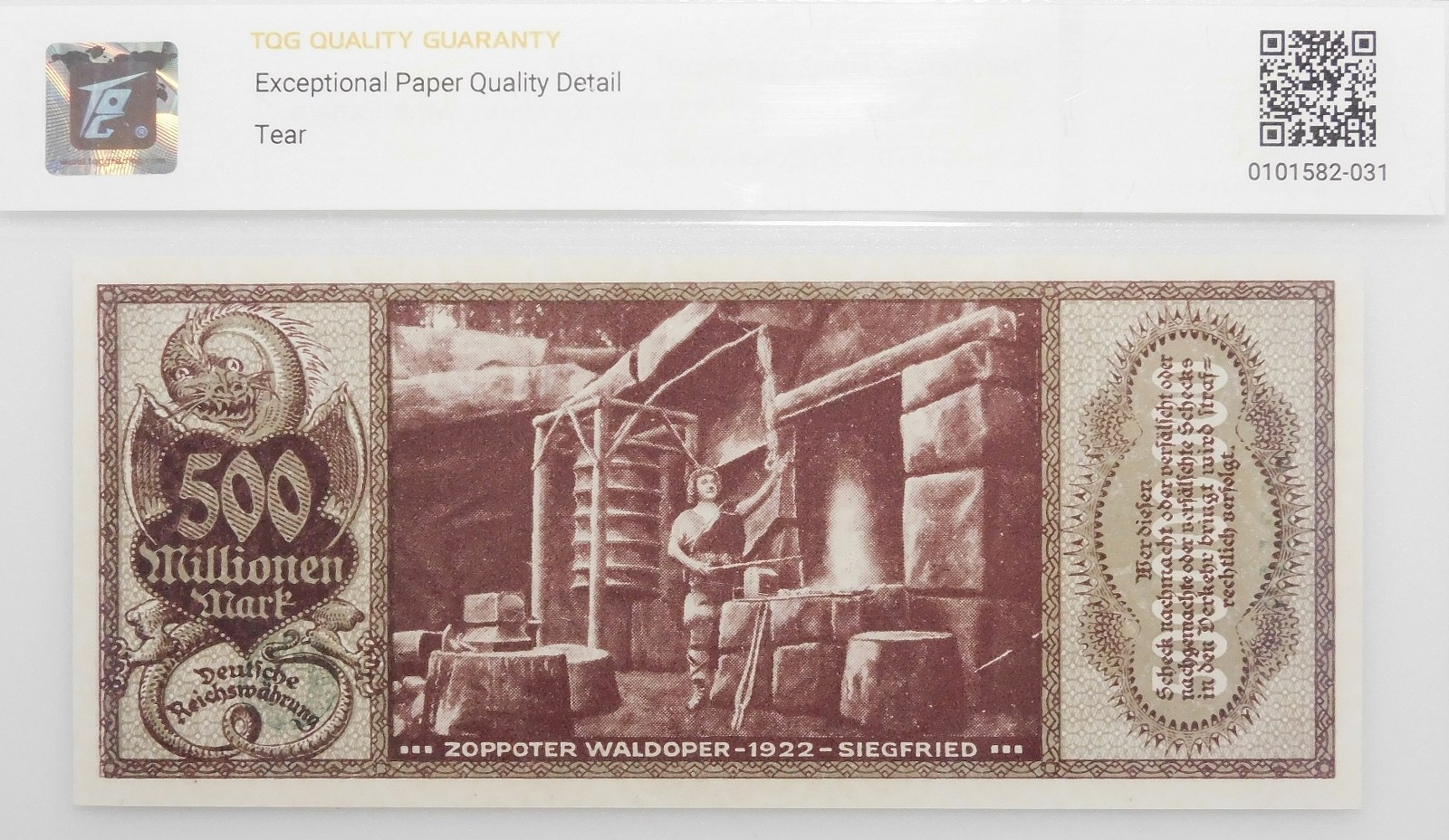 Atrakcyjny egzemplarz, potwierdzony wysoką notą gradingową TQG, z adnotacją EPQD świadczącą o wyjątkowej jakości papieru, na górnym marginesie delikatne skaleczenie samej krawędzi banknotu - co zostało odnotowanie w opisie na slabie.