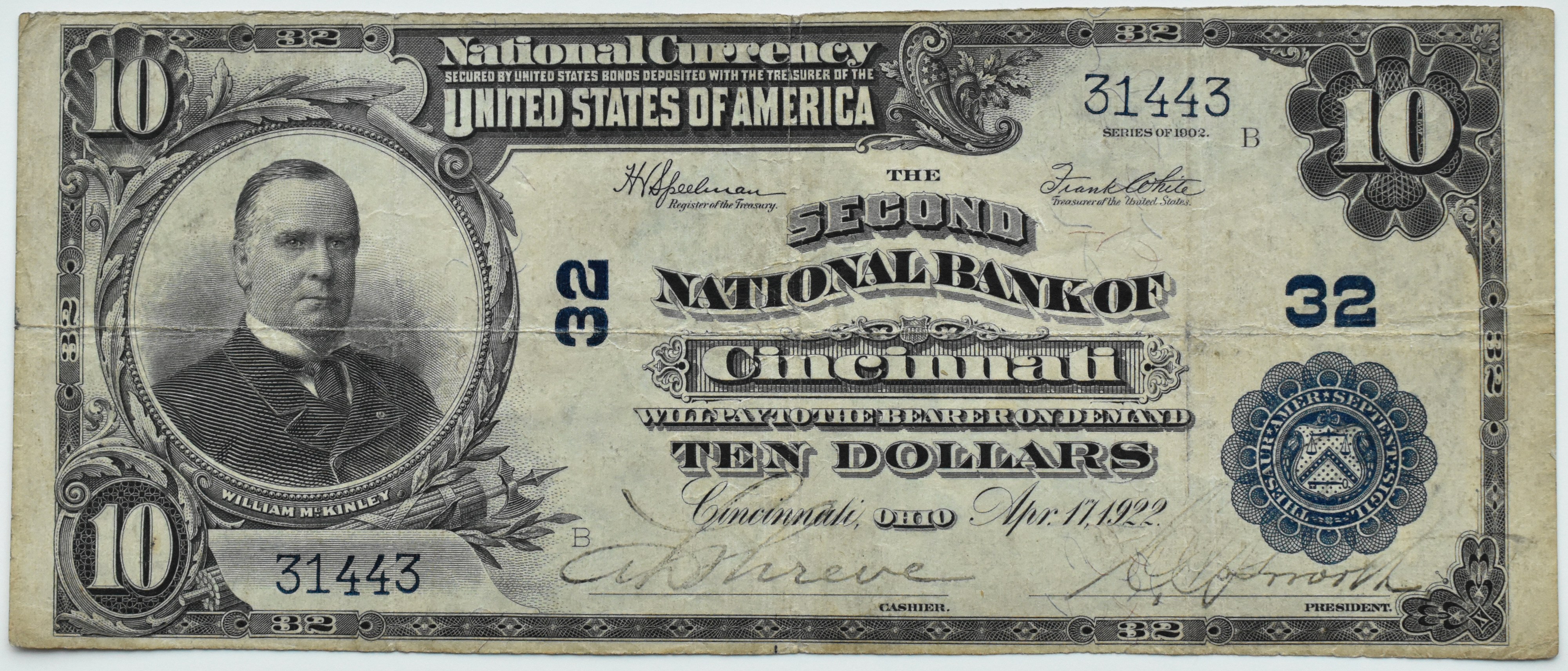 USA, BLUE SEAL, 10 dolarów 1902, UNITED STATES NATIONAL BANK of CINCINNATI, OHIO, seria B