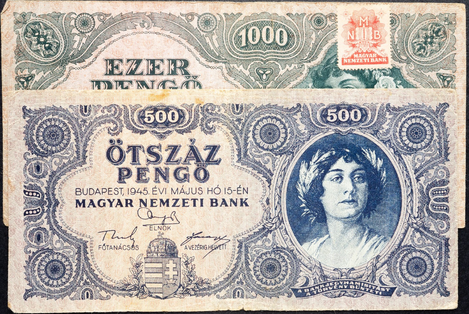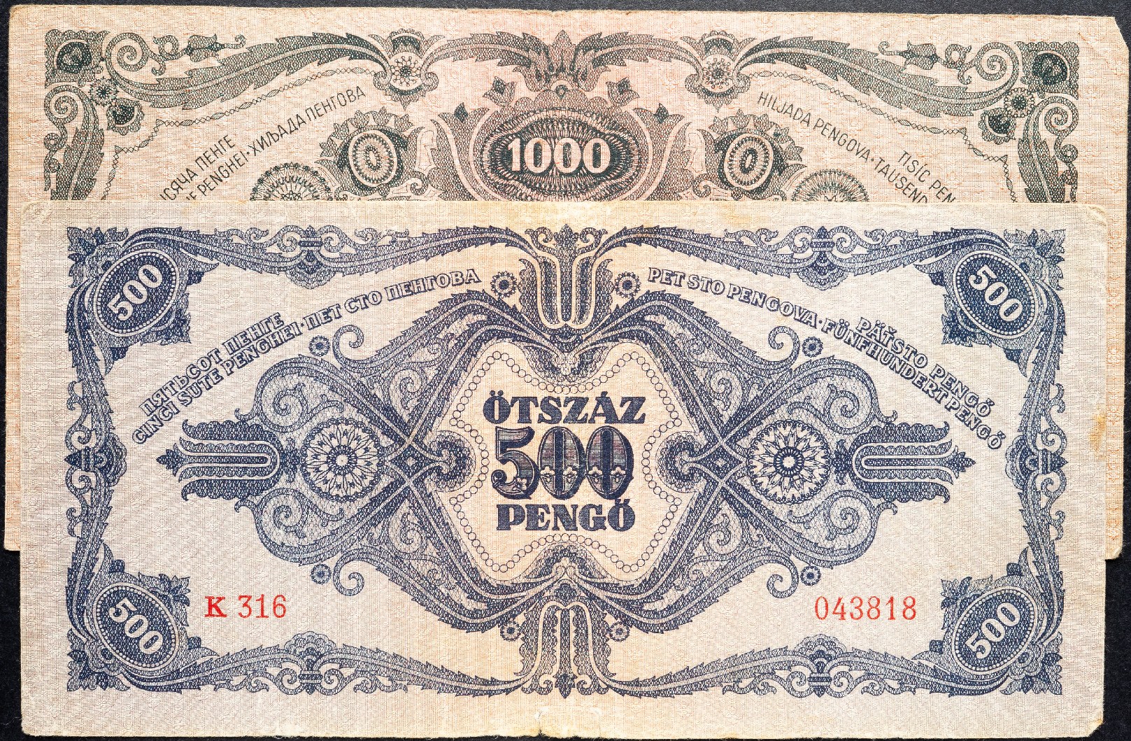 Hungary, 500, 1000 Pengő 1945, Lot of two banknotes; F