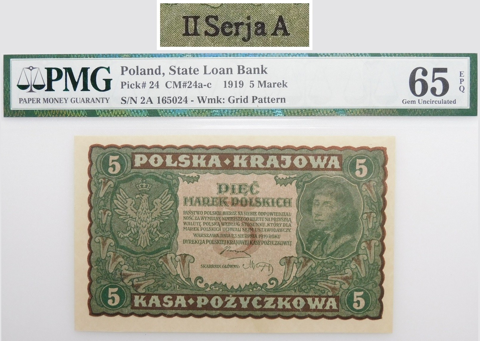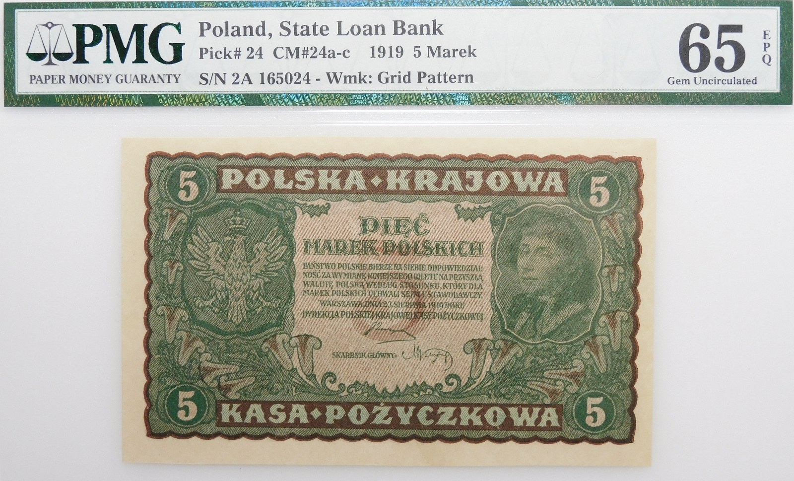 Atrakcyjny egzemplarz, potwierdzony wysoką notą gradingową PMG, z adnotacja EPQ świadcząca o wyjątkowej jakości papieru.