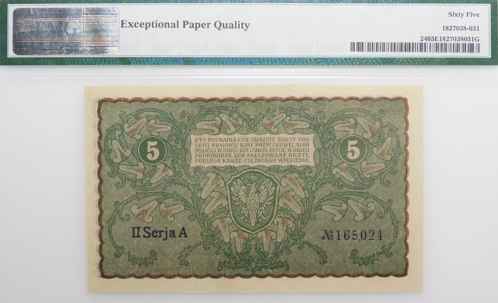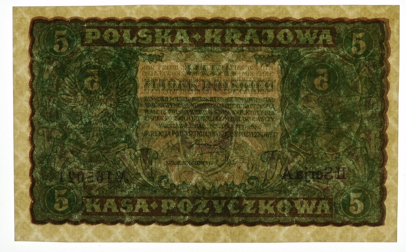 Banknot 5 marek polskich 1919, serii : II Serja A , tzw. emisji wiedeńskiej (rzadka, pierwsza odmiana tego nominału).