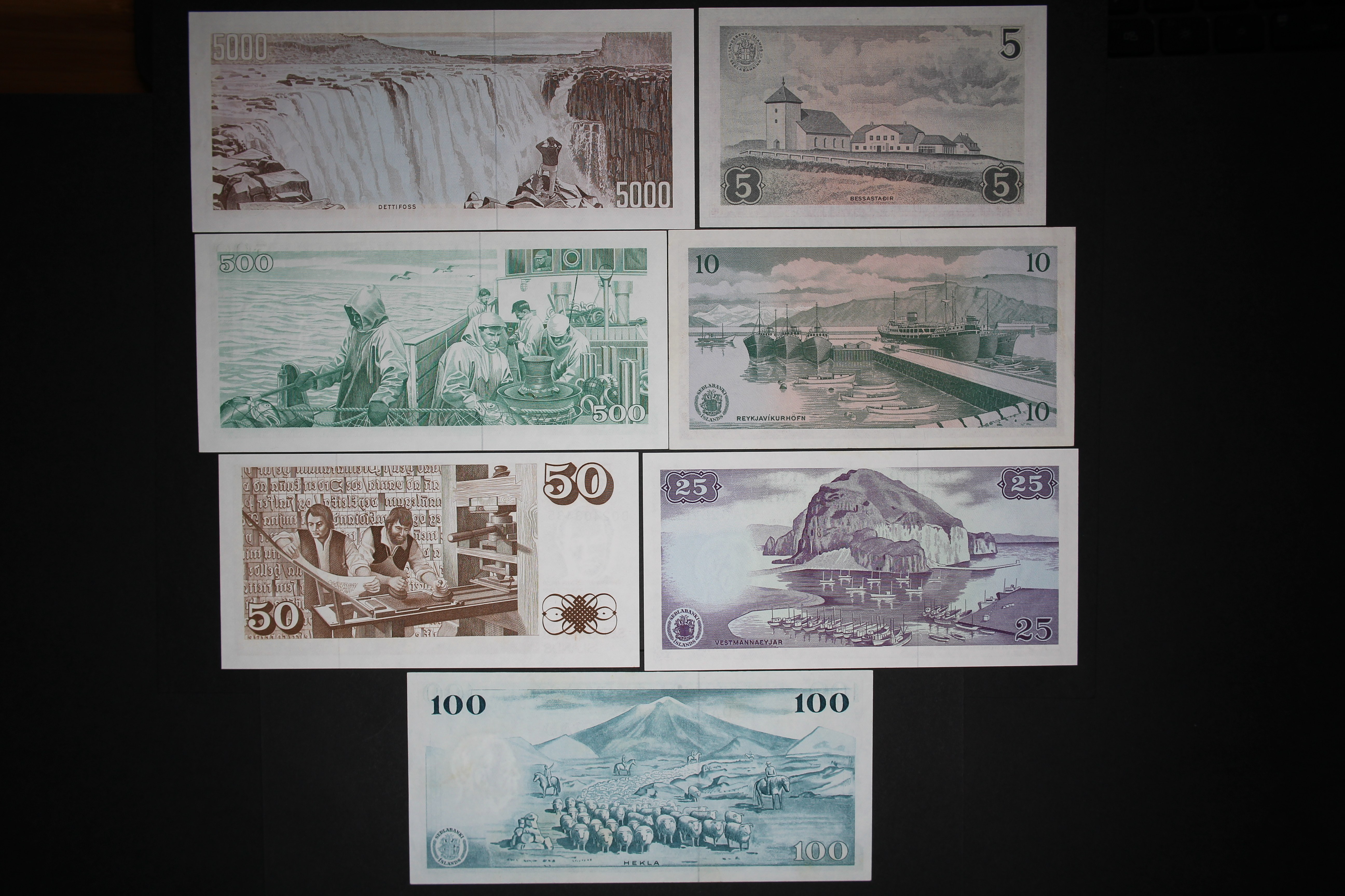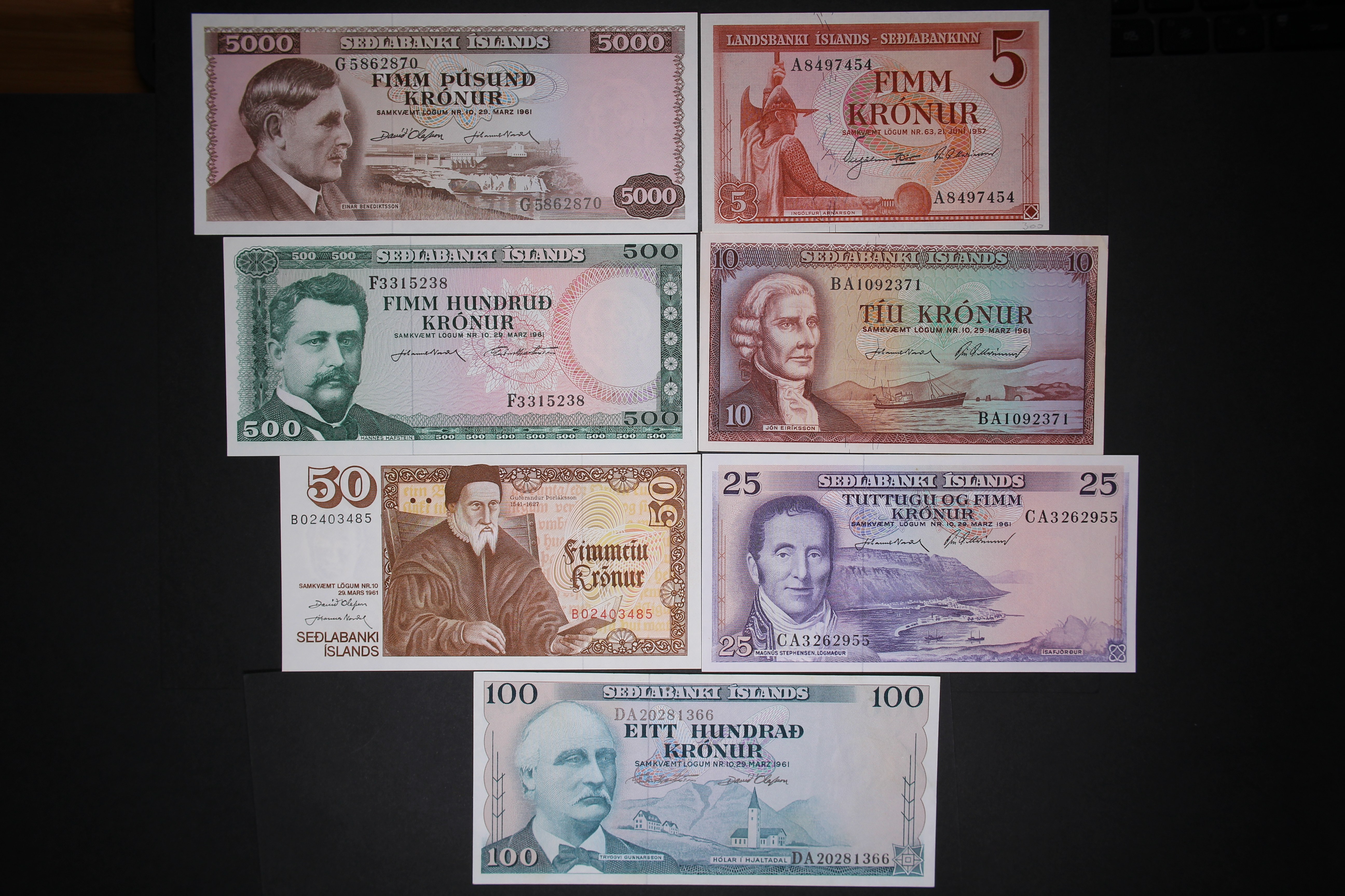 Lot of 7 Notes 1. 5 Kronur 1957-Jun-21 (1967) VÞ, JGM P#37b #A8497454 / 2. 5000 Kronur 1961 (1971-1980) DÓ, JN P#47 #G5862870 / 3. 500 Kronur 1961 (1974-1980) JN, GH P#45 #F3315238 / 4. 100 Kronur 1961 (1974-1980) GH, DÓ P#44 #DA20281366 / 5. 50 Kronur 1961-Mar-29 (1981-1986) P#49 #B02403485 / 6. 25 Kronur 1961 (1965-1972) JN, JGM P#43 #CA3262955 / 7. 10 Kronur 1961 (1966-1969) JN, JGM P#42 #BA1092371