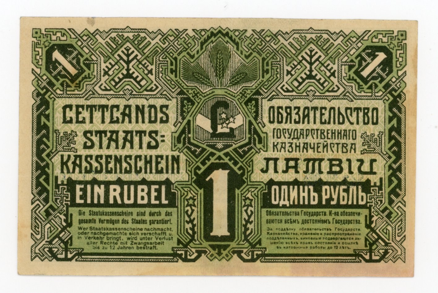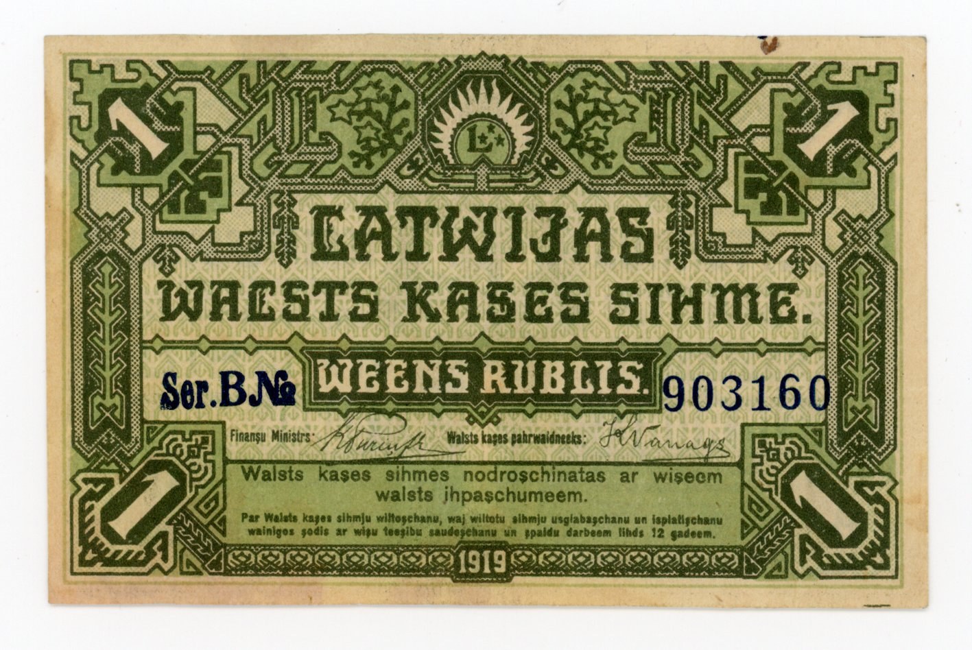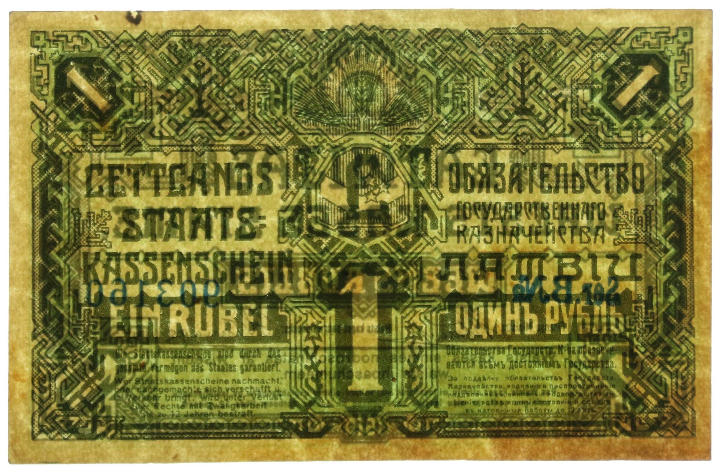 Łotwa, 1 rubel 1919 Ser. B. - zielony. Stan zachowania 2+. Bez złamań jedynie drobne mankamenty na marginesach. Literatura: Pick 2a