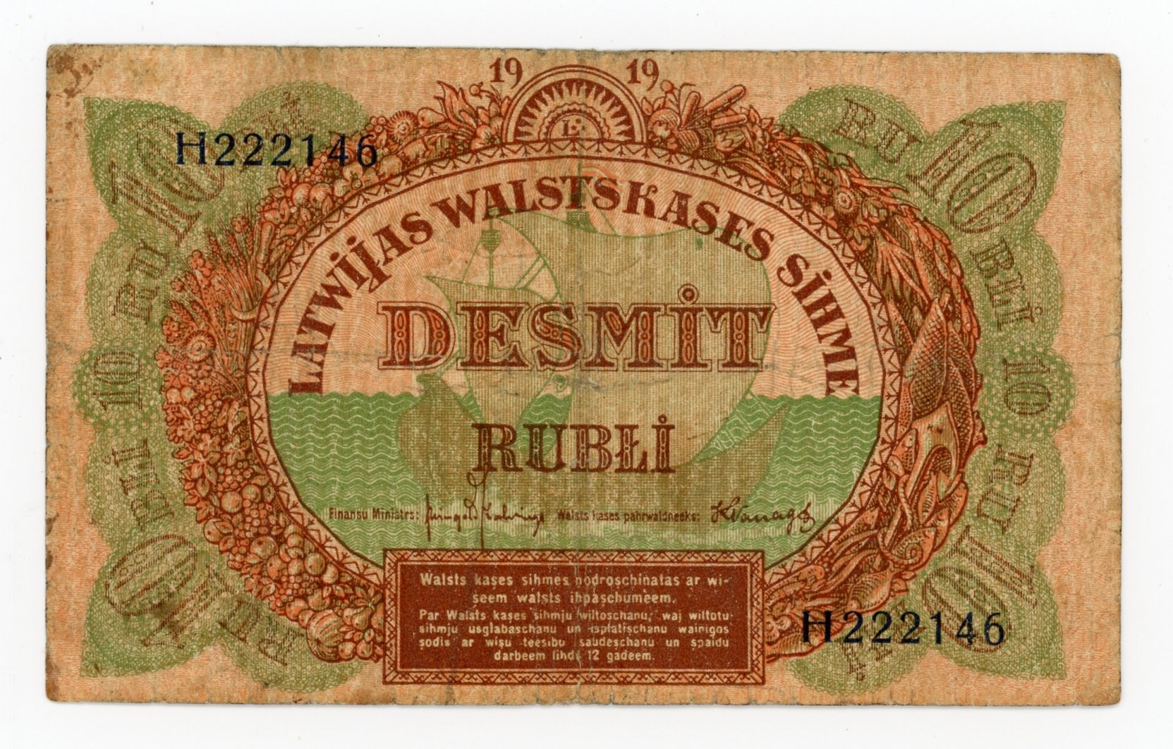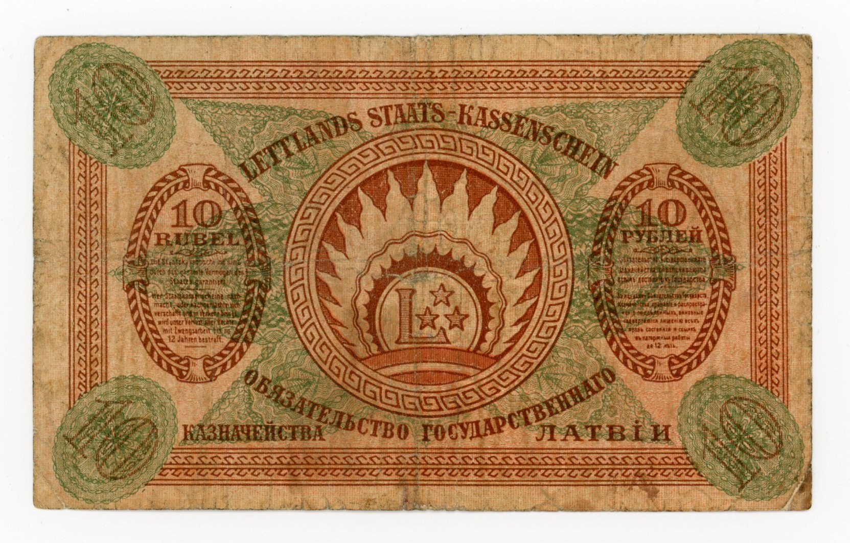 Łotwa, 10 Rubli 1919. Stan zachowania: 4+. Kilkakrotnie złamane. Literatura: Pick 4f