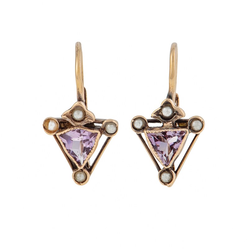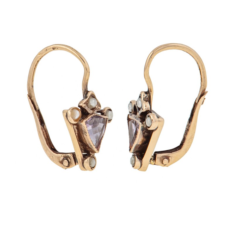 złoto pr. "4" (0,585), 2 szt. ametystów, 8 szt. półpereł, masa: 1,88 g; wym.: 1,8 x 0,8 cm;