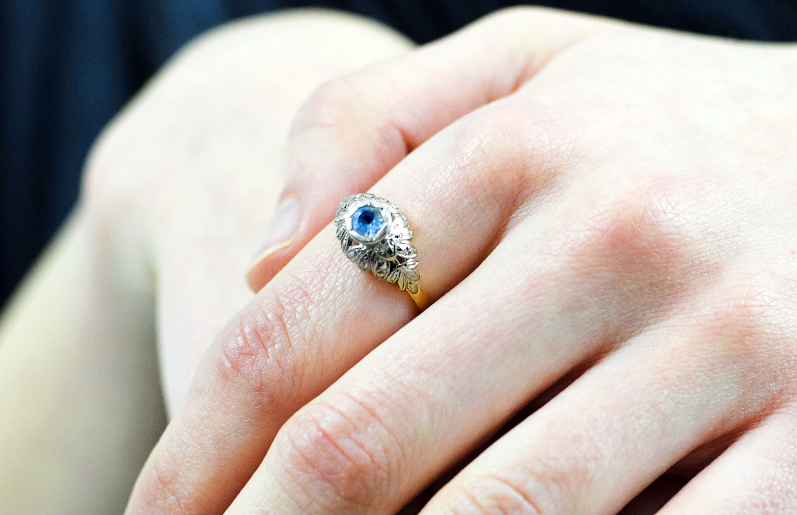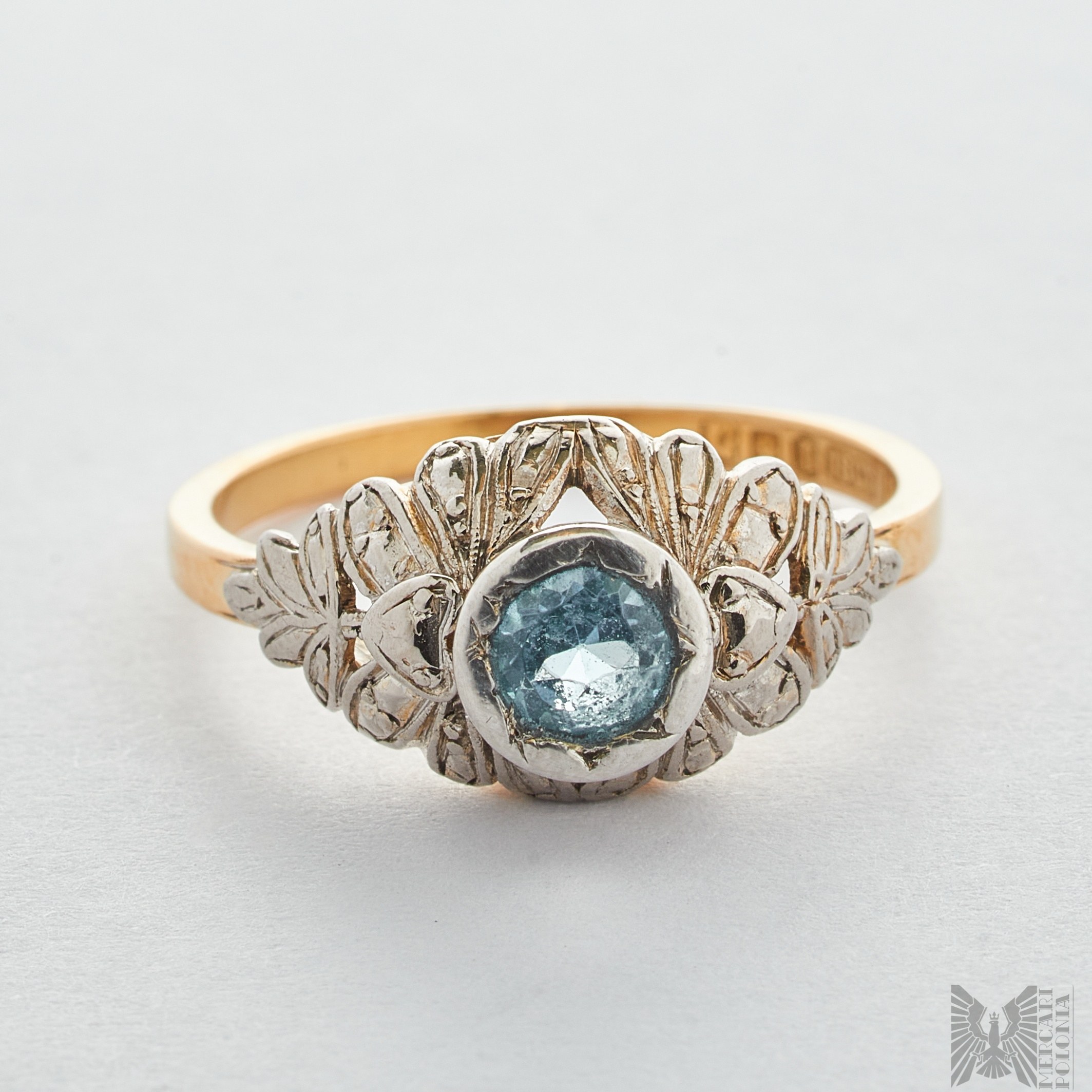 Pierścionek Art Deco z naturalnym topazem Sky Blue około 0.30 ct, Złoto 750 i Platyna, masa wyrobu - 3.48 gram, rozmiar 14