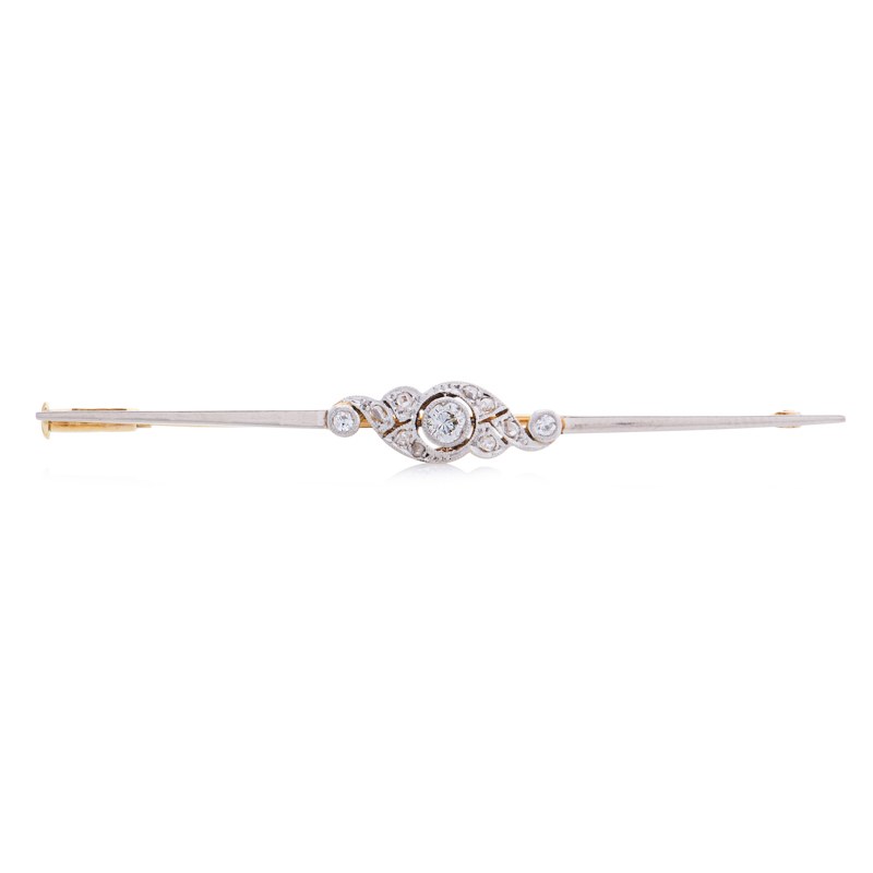 złoto pr. ~ 0,750, platyna, 1 szt. diament ~ 0,14 ct I/Si, 2 szt. diamentów ł. ~ 0,04 ct I/Si, 8 szt. rautów diamentowych, masa: 3,47 g; wym.: 6,6 x 0,7 cm