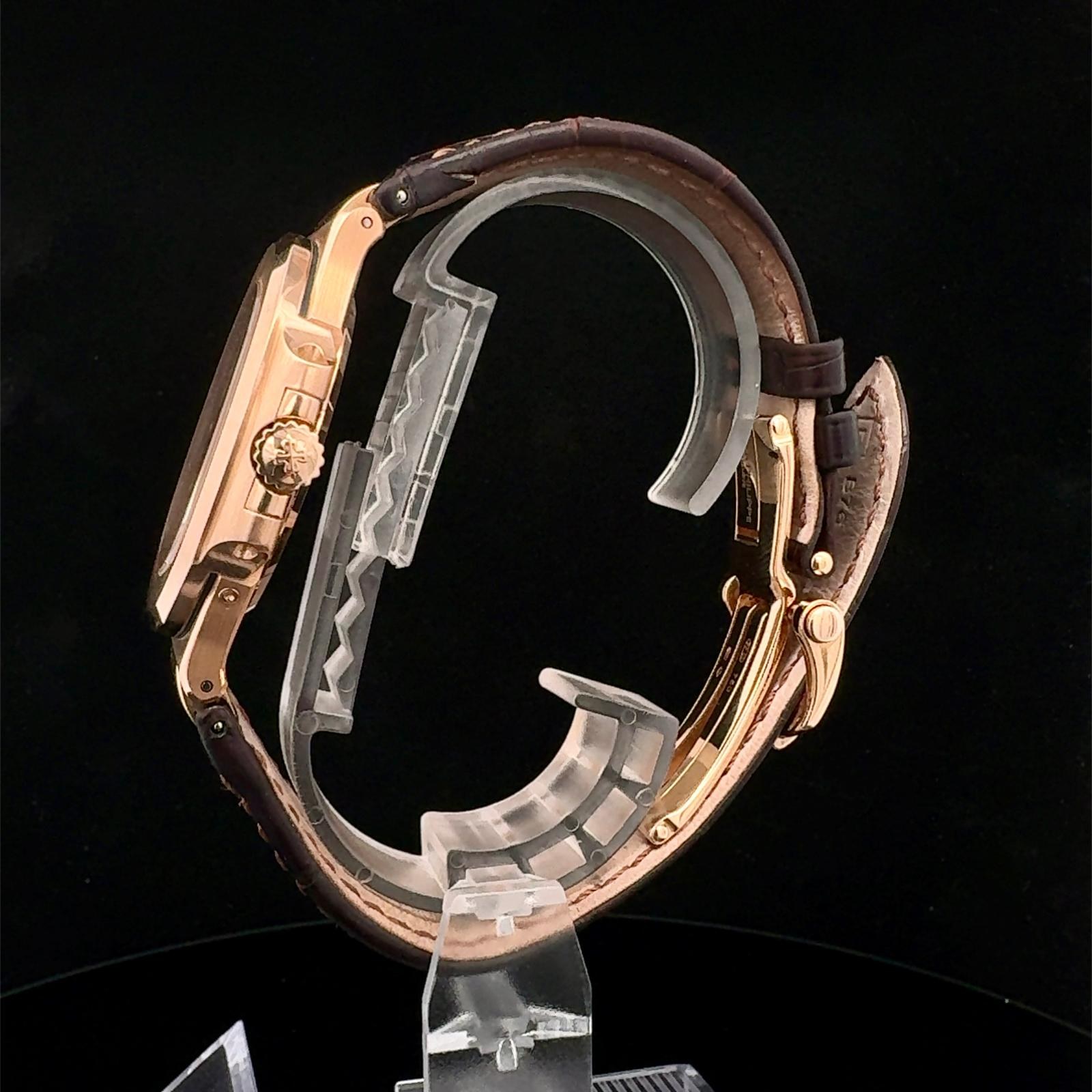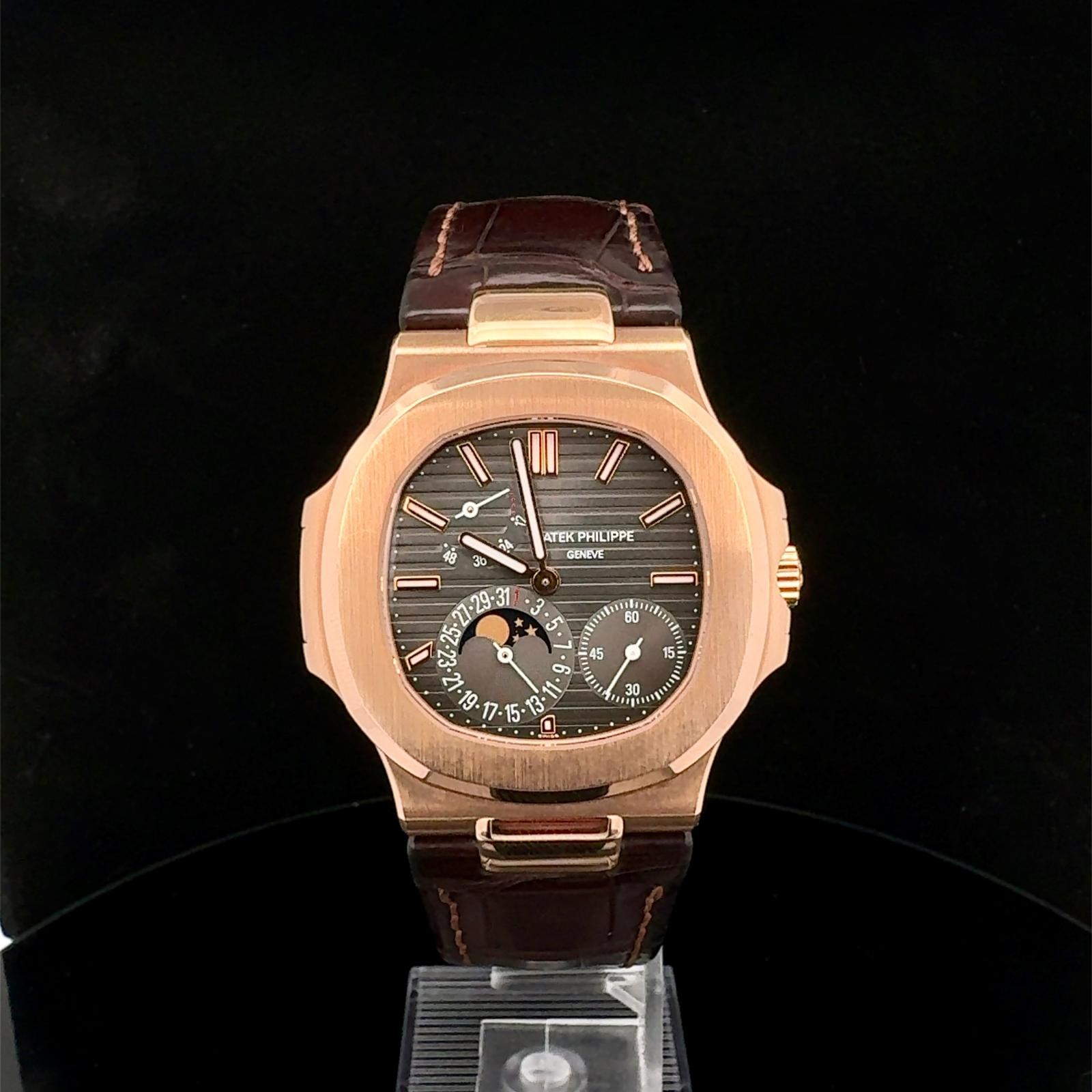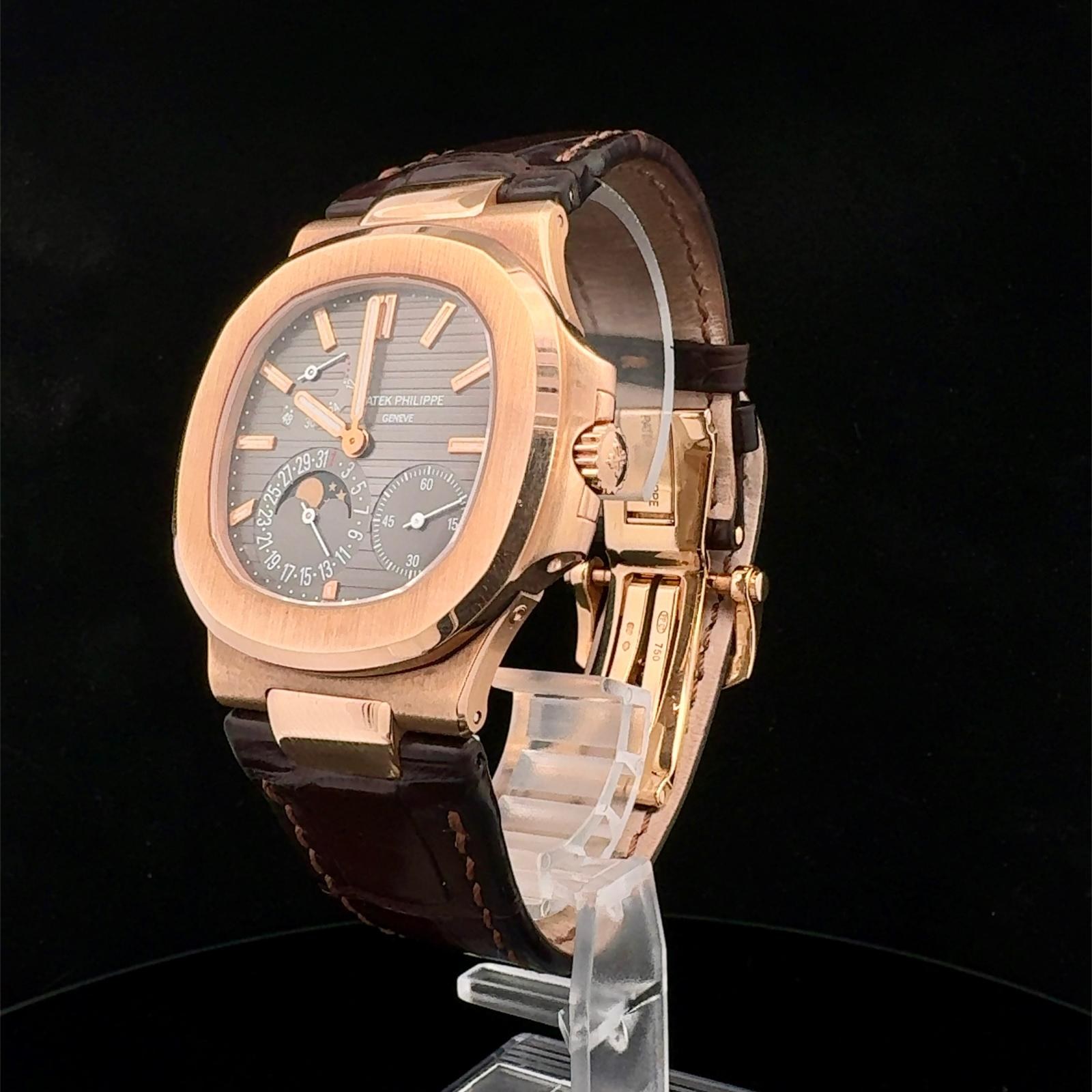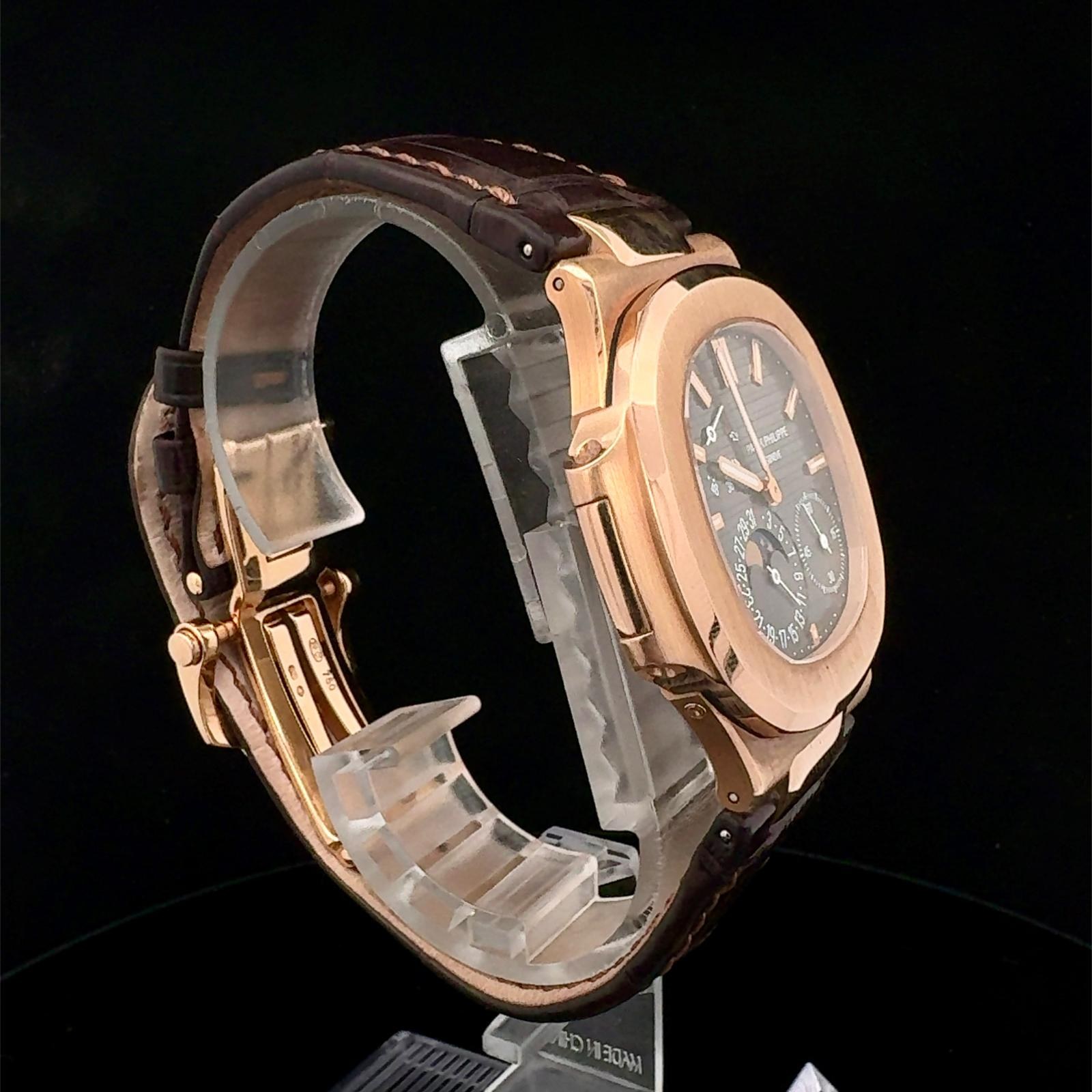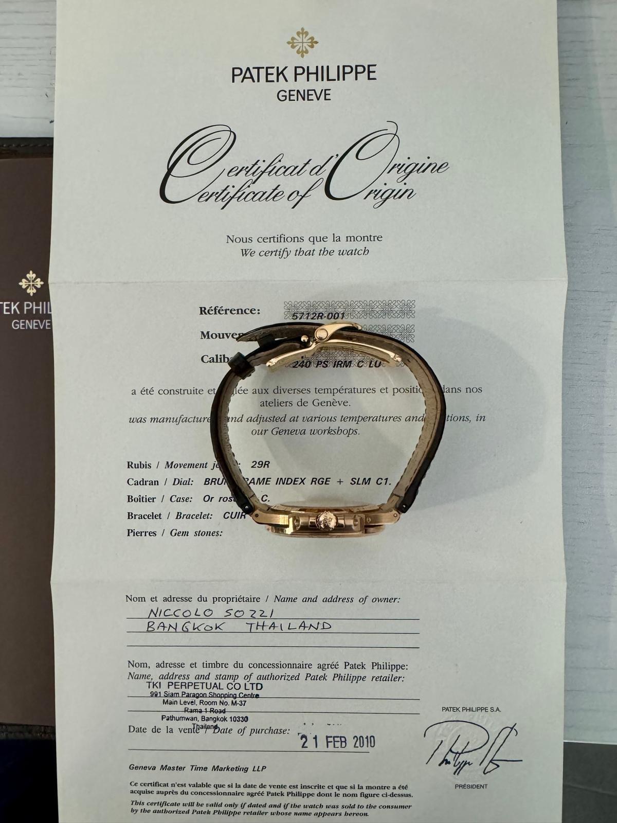BRAND PATEK PHILIPPE MODEL (WATCH) NAUTILUS REFERENCE NUMBER 5712GR-001 WINDING AUTOMATIC CASE MATERIAL ROSE GOLD STRAP MATERIAL CROCODILE LEATHER YEAR OF PRODUCTION 2010 CONDITION EXCELLENT (SECOND HAND, NO OR BARELY VISIBLE SIGNS OF WEAR) KIT WITH ORIGINAL BOX AND ORIGINAL DOCUMENTS CALIBER WINDING AUTOMATIC CASE CASE MATERIAL ROSE GOLD DIAMETER 40 X 38 MM WATERPROOF 6 ATM BEZEL MATERIAL ROSE GOLD GLASS SAPPHIRE GLASS STRAP STRAP MATERIAL CROCODILE LEATHER STRAP COLOR BROWN FOLDING CLASP CLASP MATERIAL ROSE GOLD FUNCTIONS MOON PHASES, DATE OTHER TRANSPARENT CASEBACK, SMALL SECONDS, POWER RESERVE