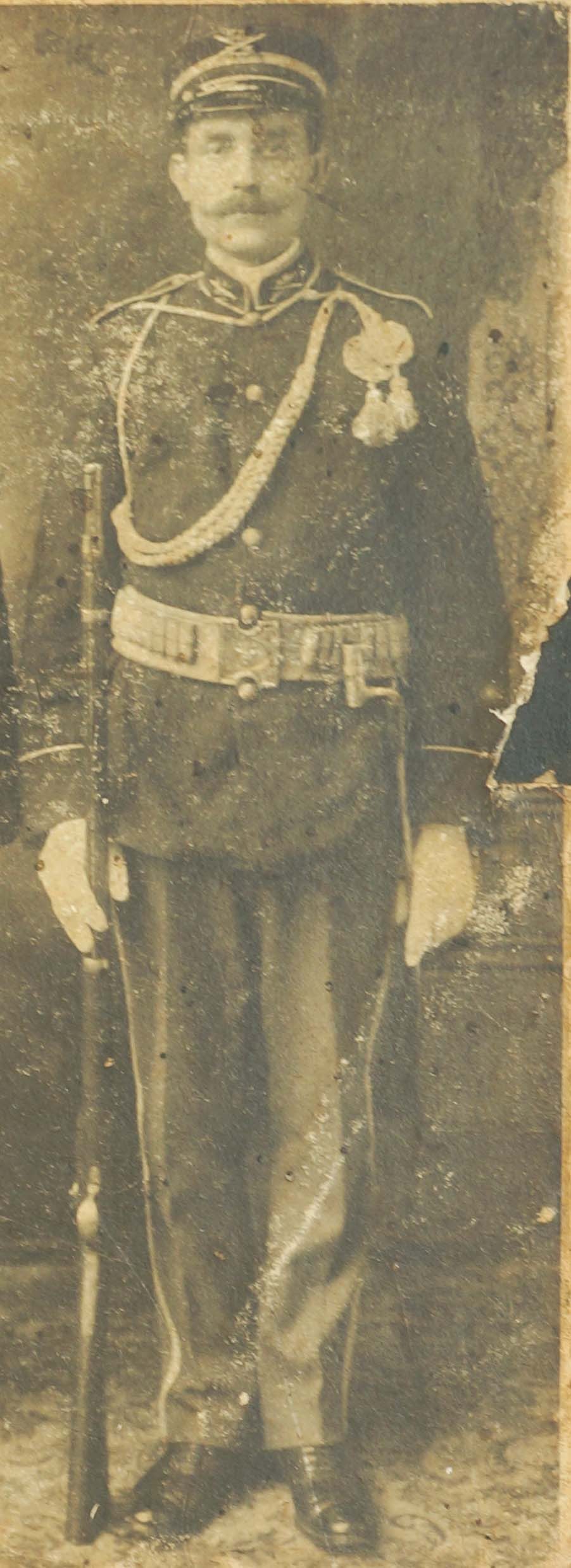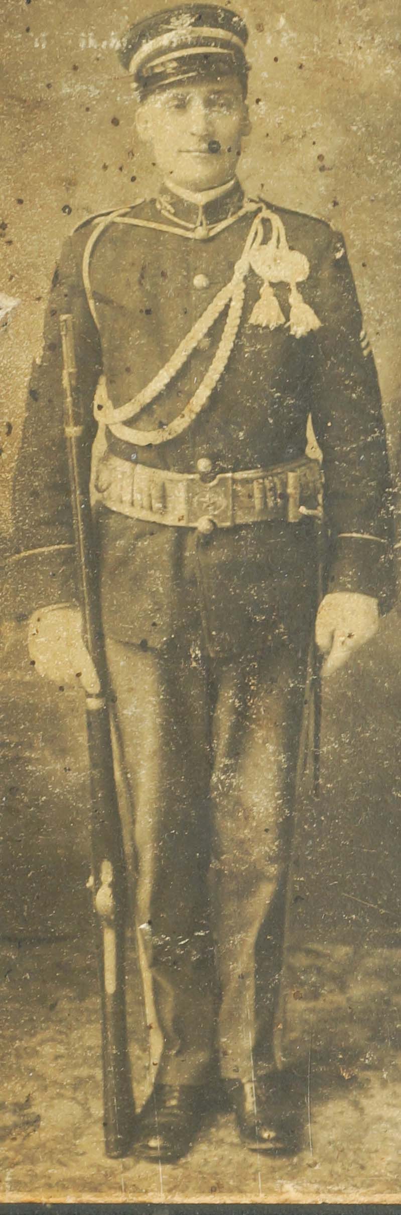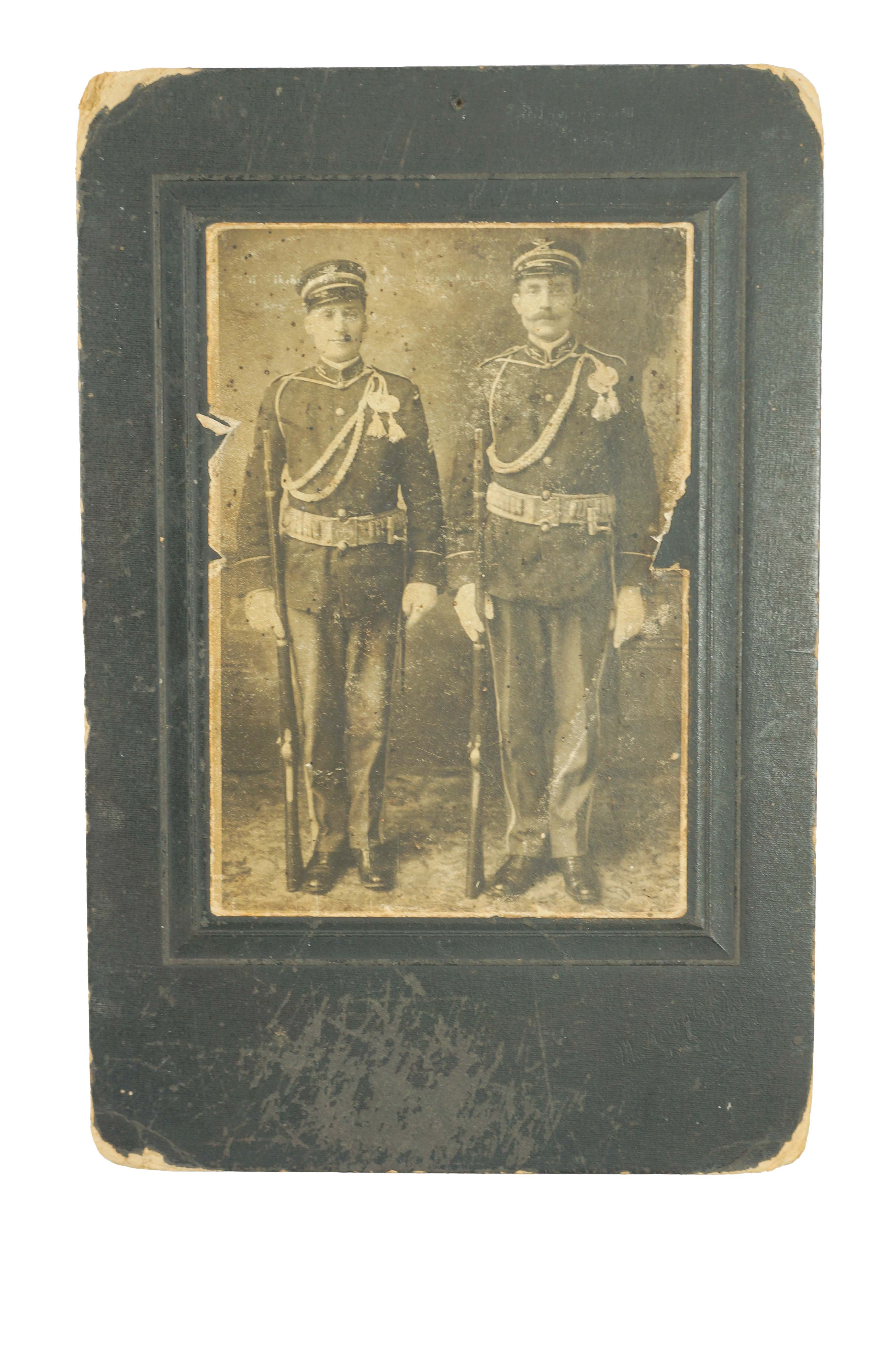 Fotografia kartonikowa, CDV , przedstawiająca dwóch polskich emigrantów w mundurach armii USA, przy boku obu panów widoczne strzelby/karabiny, f. 15x23cm [kartonik], 10x14cm [fotografia]