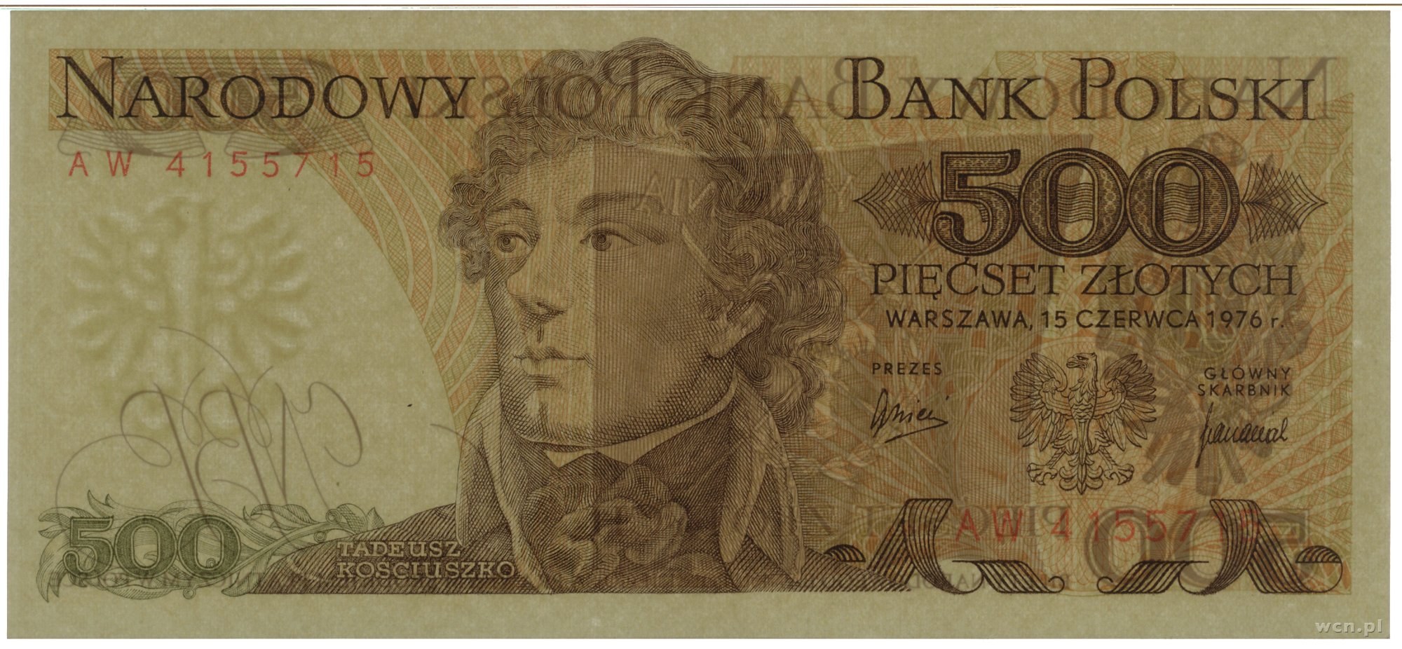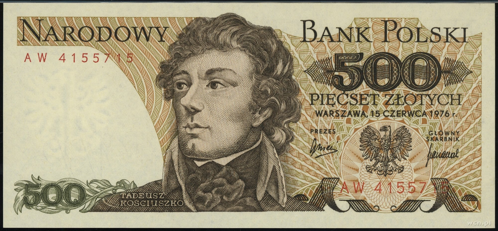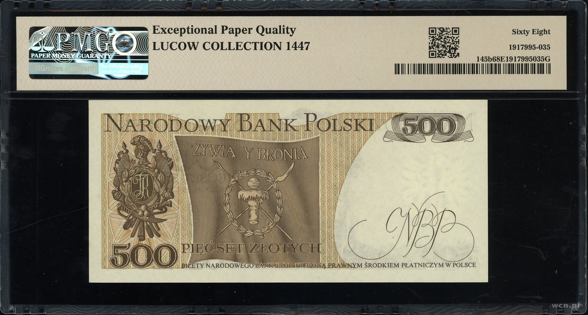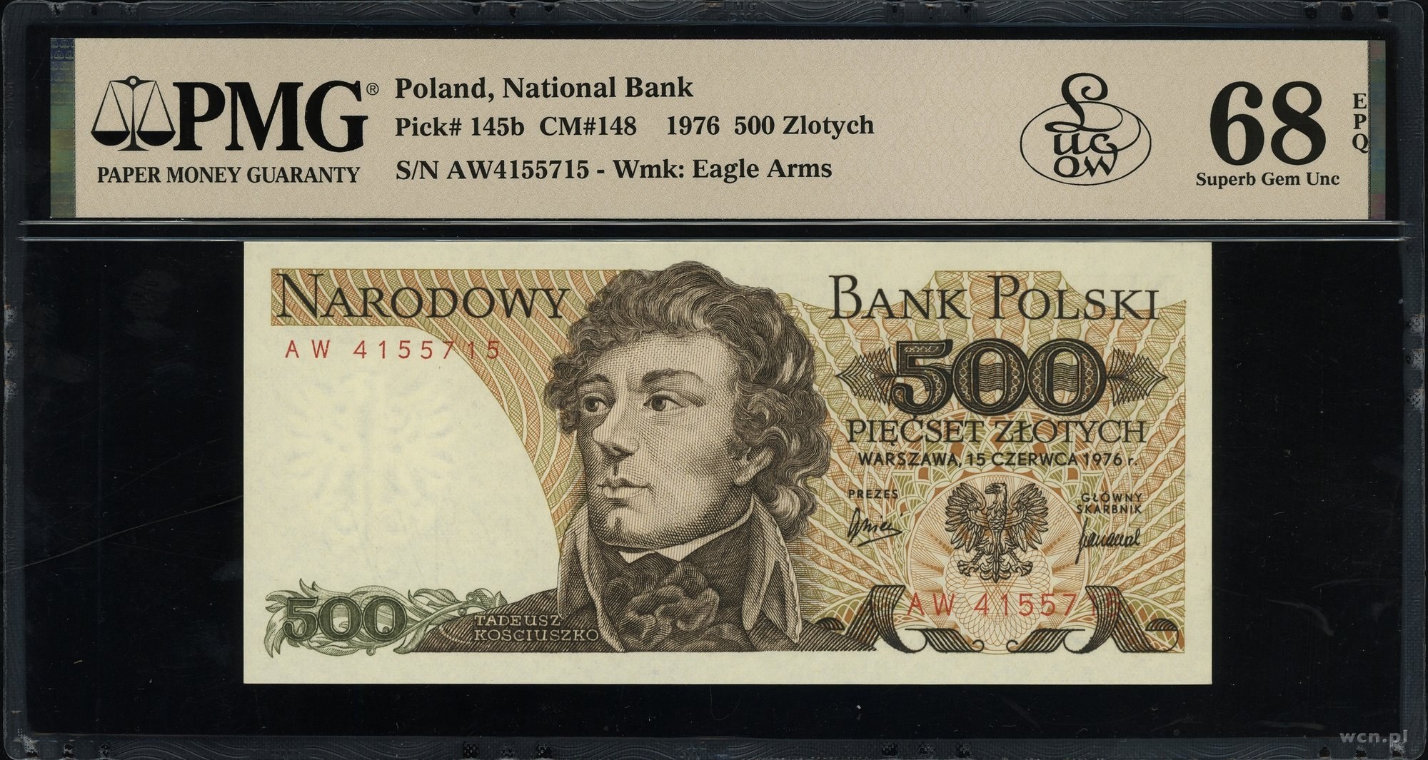 POLSKA RZECZPOSPOLITA LUDOWA (1952–1989), 500 złotych, 15.06.1976; bardzo rzadka seria AW, numeracja 4155715; Lucow 1447 (R2), Miłczak 148, Pick 145b, Szparło L7; wyśmienity egzemplarz w opakowaniu PMG 1917995-035 z bardzo wysoką oceną 68 EPQ.