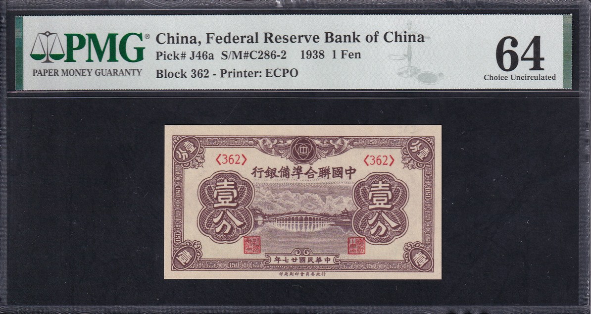 China, Federal Reserve Bank of China, 1 Fen, 1938, Choice UNC 64, Pick: J46a