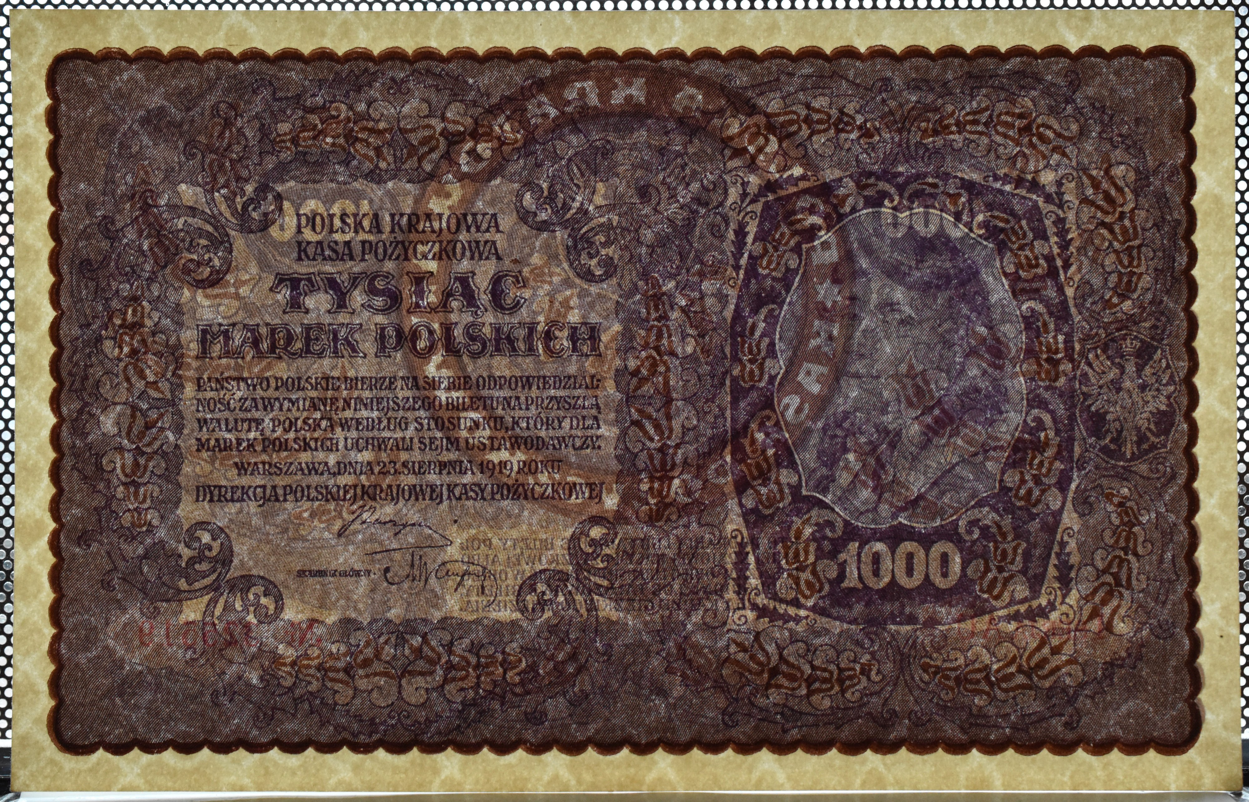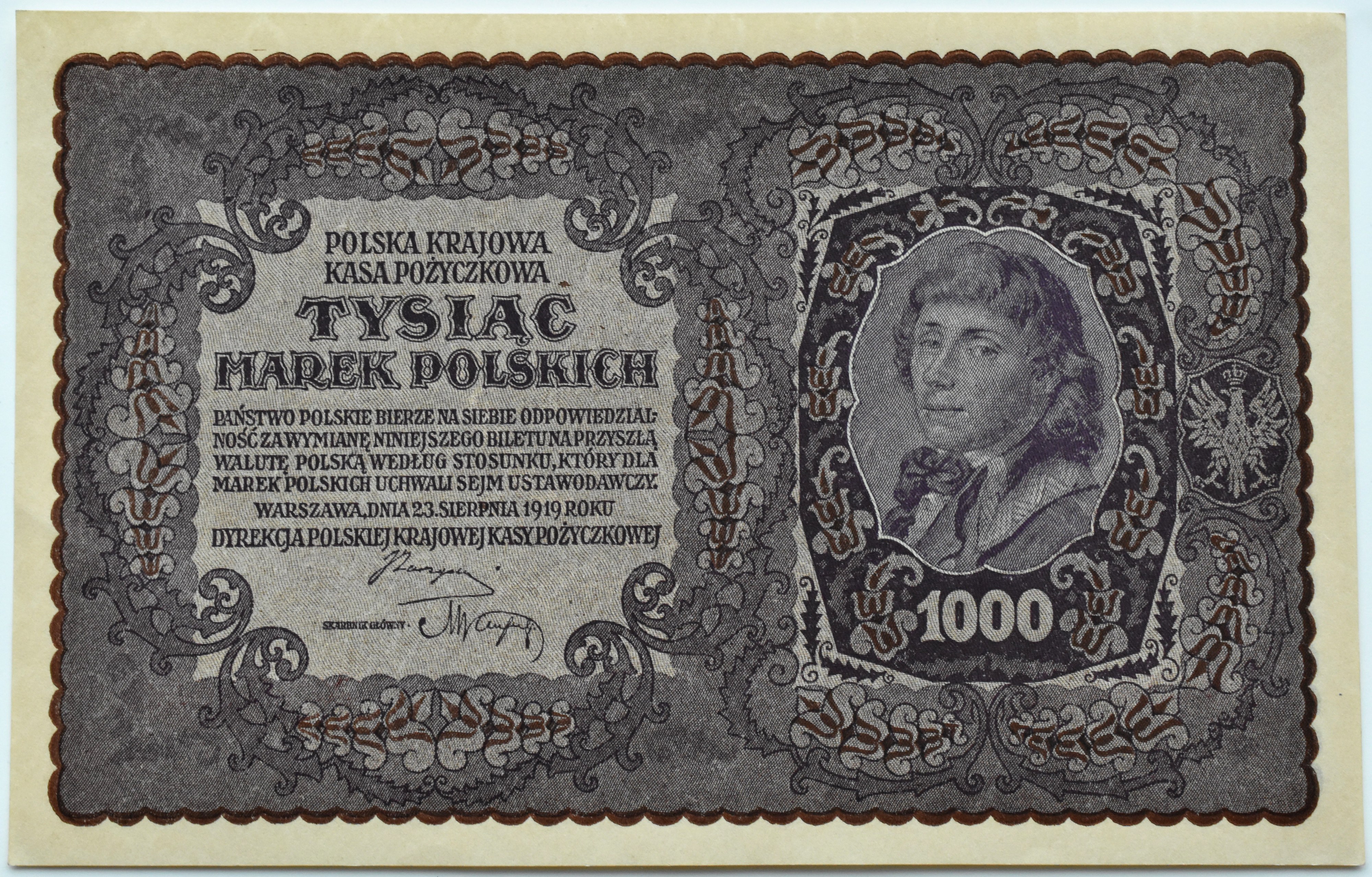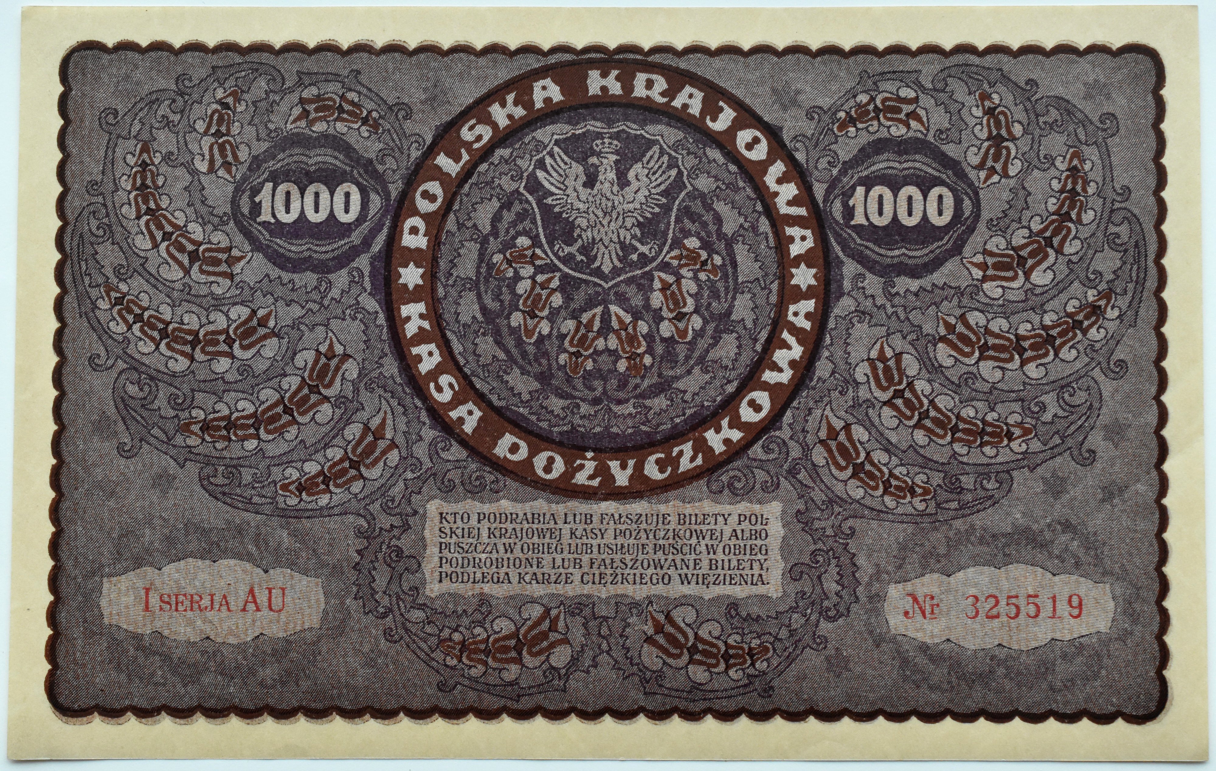 II RP, 1000 marek 1919, I serja AU typ 7, piękne!