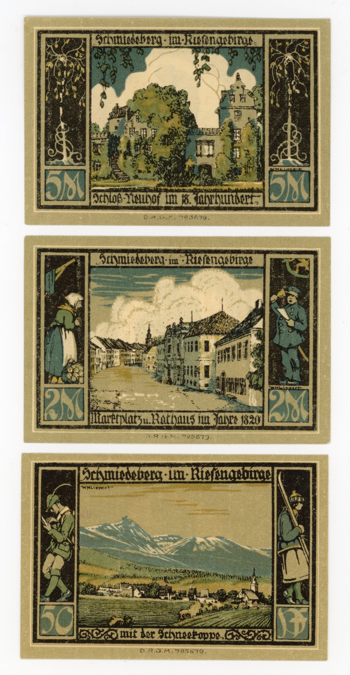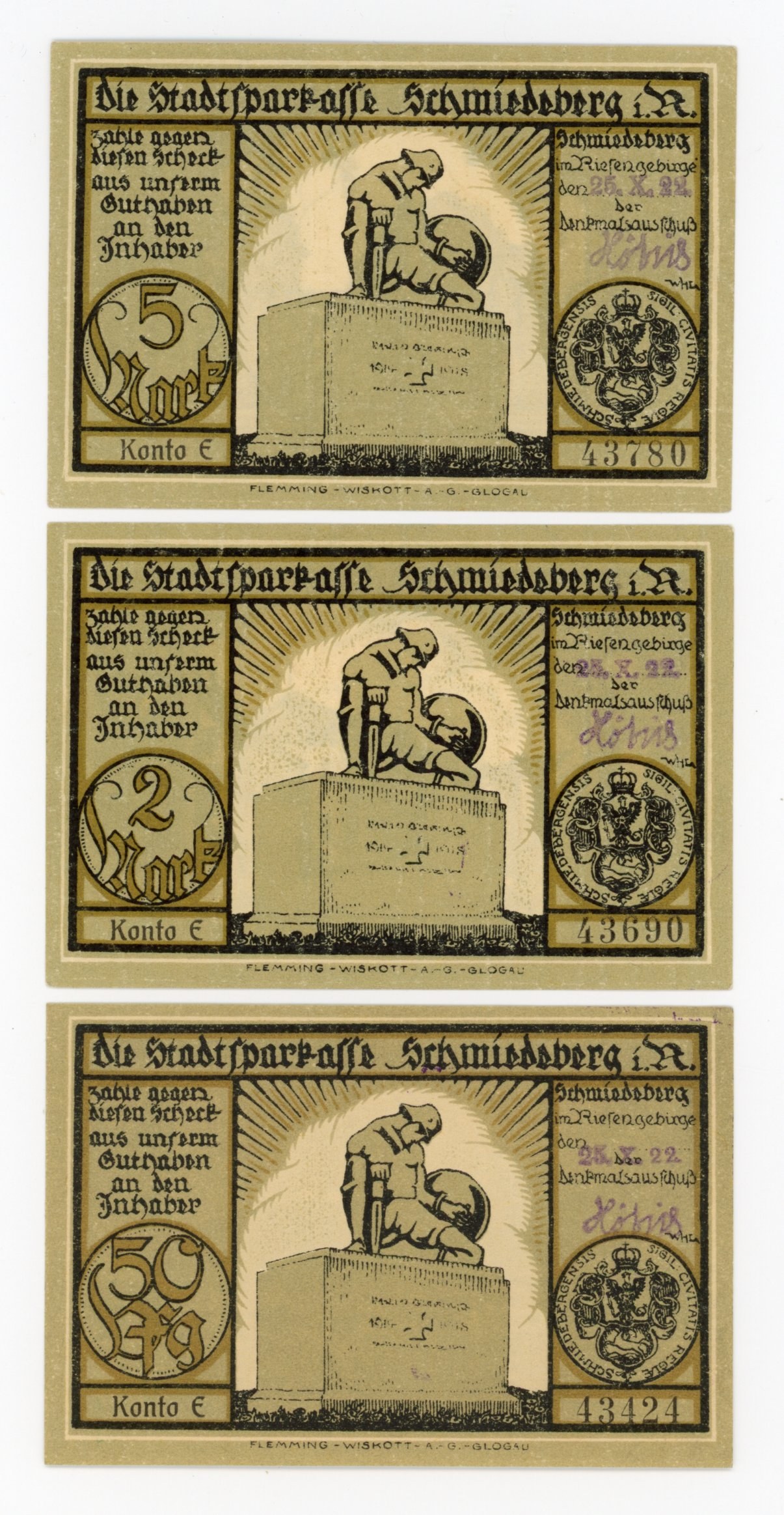 Kowary/Schmiedeberg i. R., Stadtsparkasse, 50 fenigów 2 i 5 marek 1922 - faksymile podpisu. Stan zachowania 1.