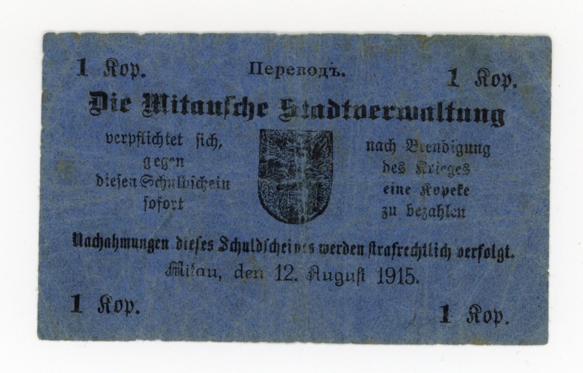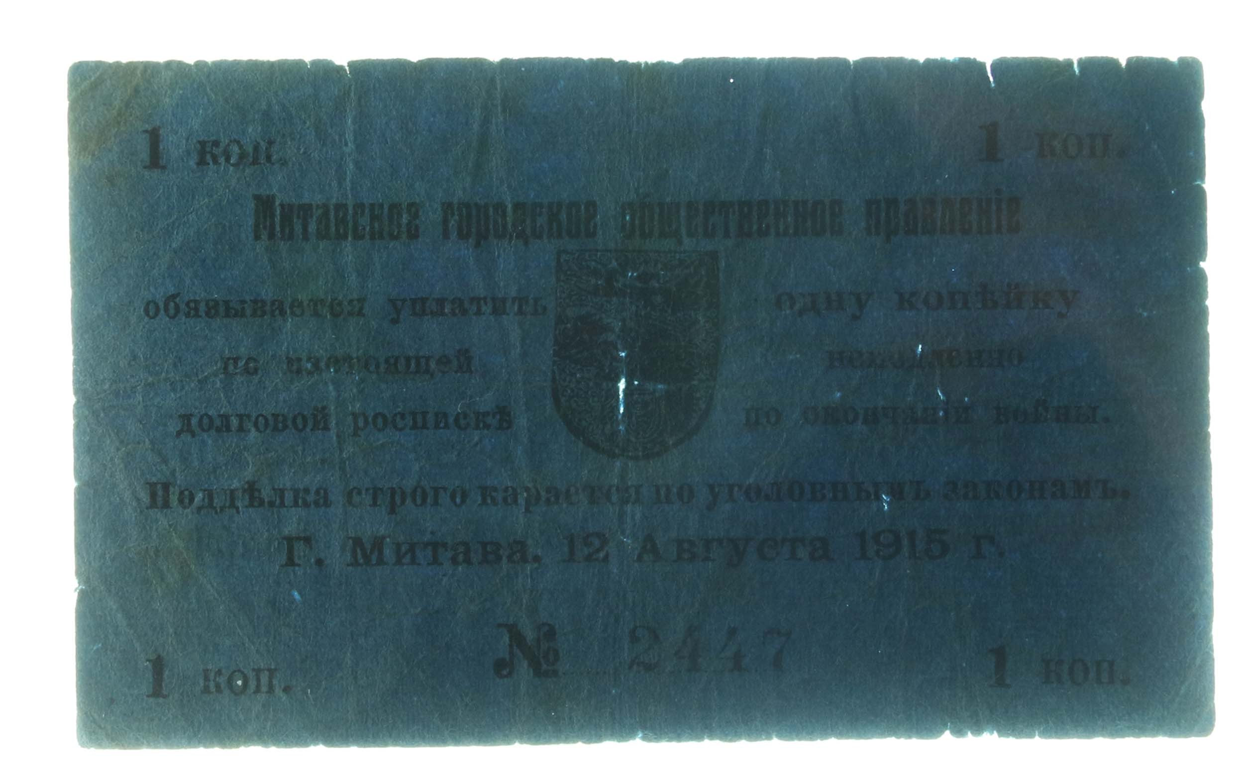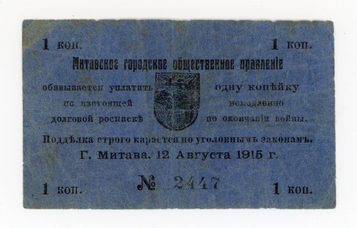 Łotwa, Mitawa [Mitau] 1 kopiejka 1915. Stan zachowania 3-. Kilkukrotnie złamane.