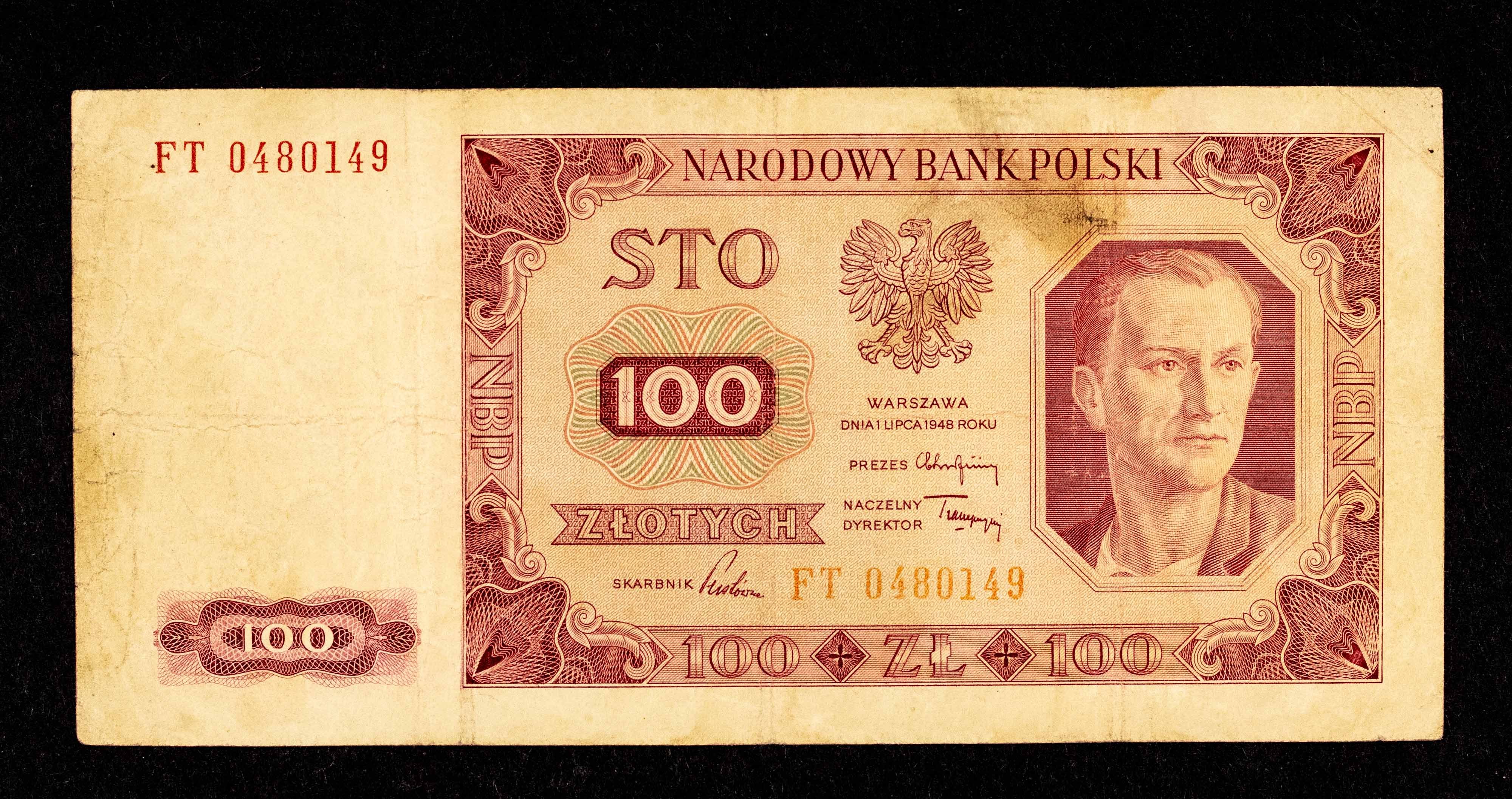 Banknot wielokrotnie złamany, papier dość sztywny. Seria FT 0480149.
