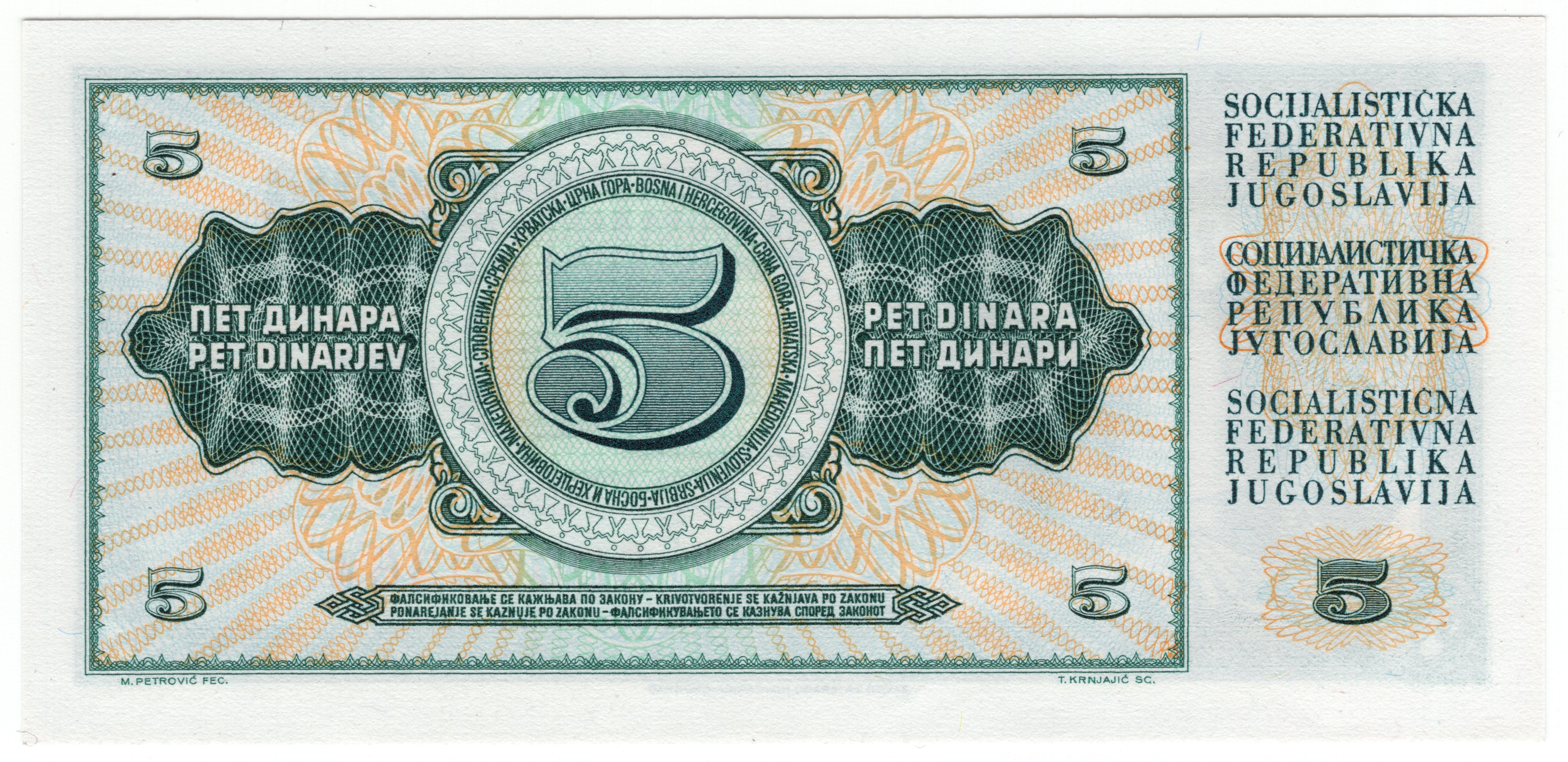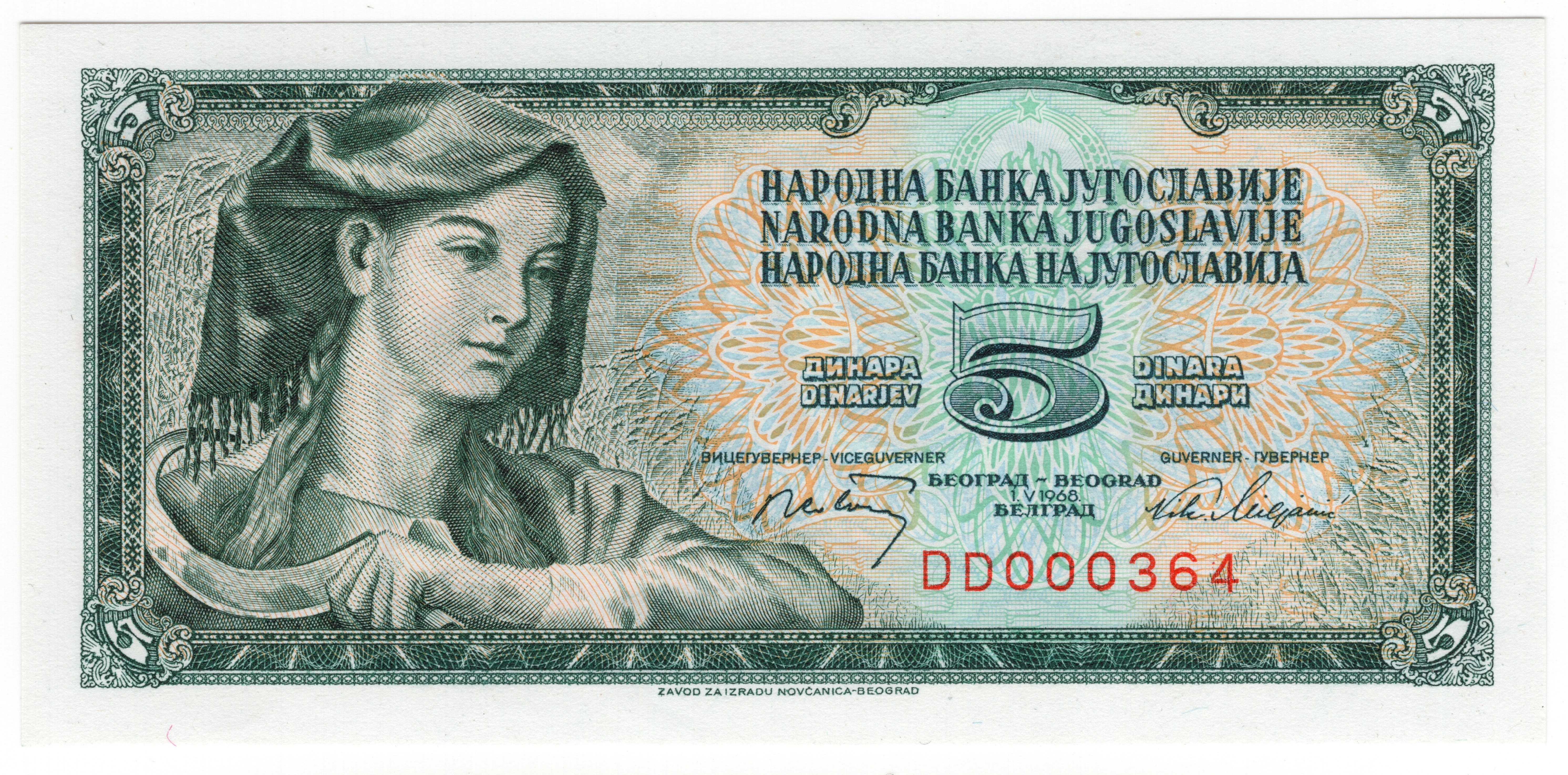 Jugosławia, 5 dinara 1968, seria DD - niski numer 000364