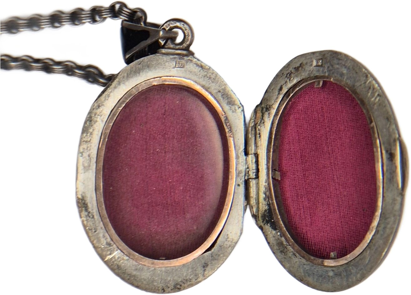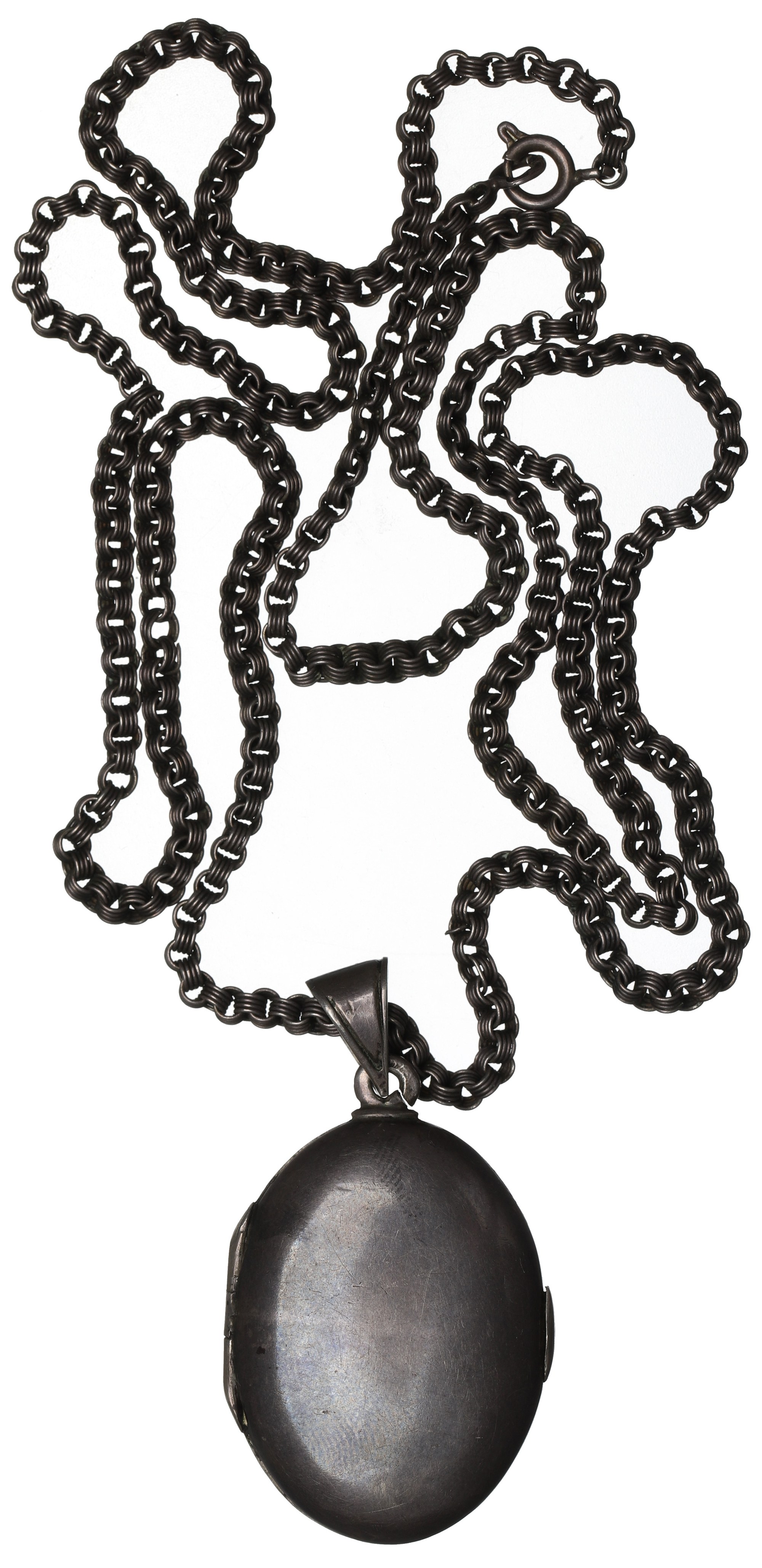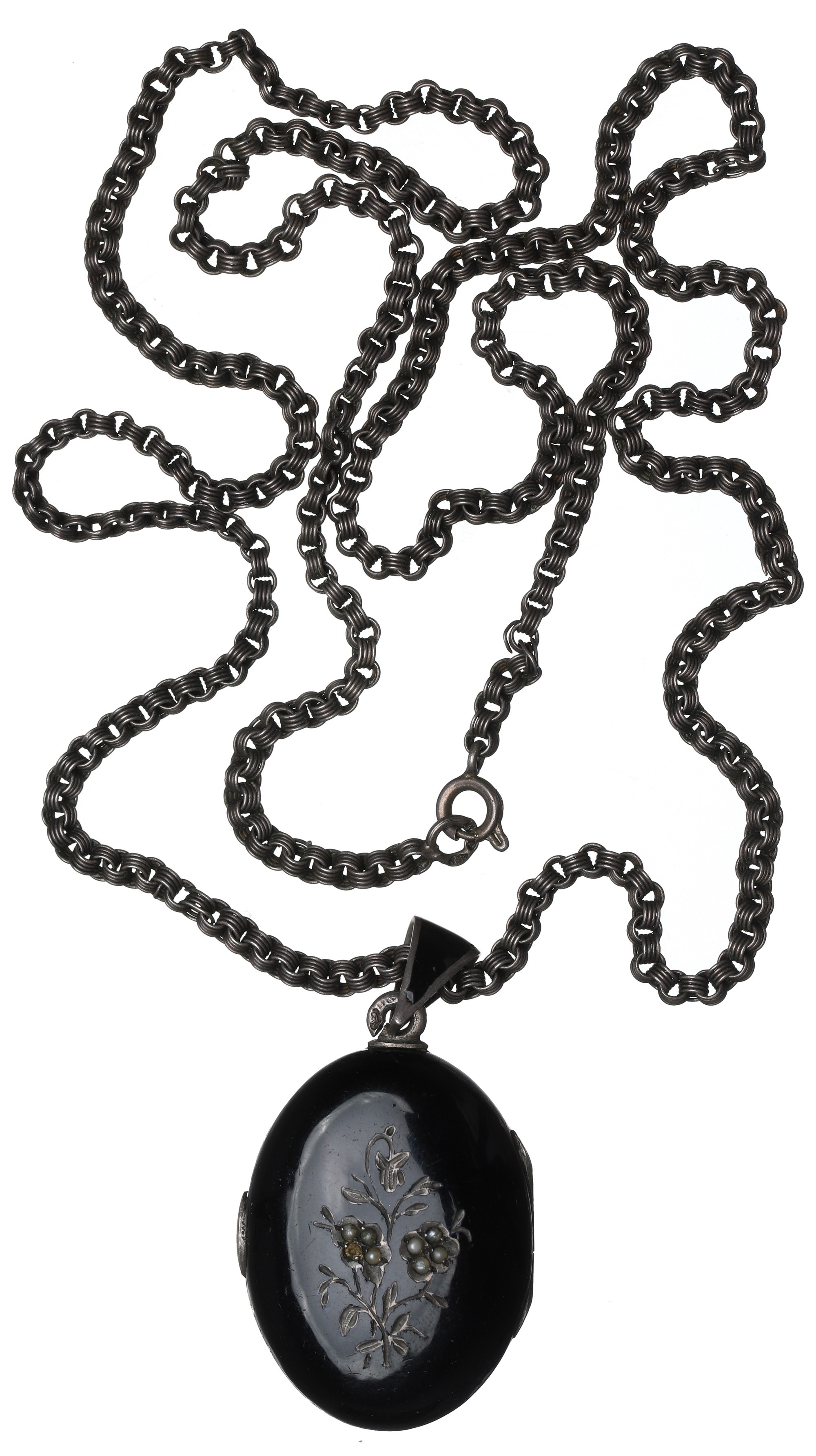 Piękny przykład biżuterii żałobnej. Wykonanie wiedeńskie okute srebrem, ze srebrnym łańcuszkiem.