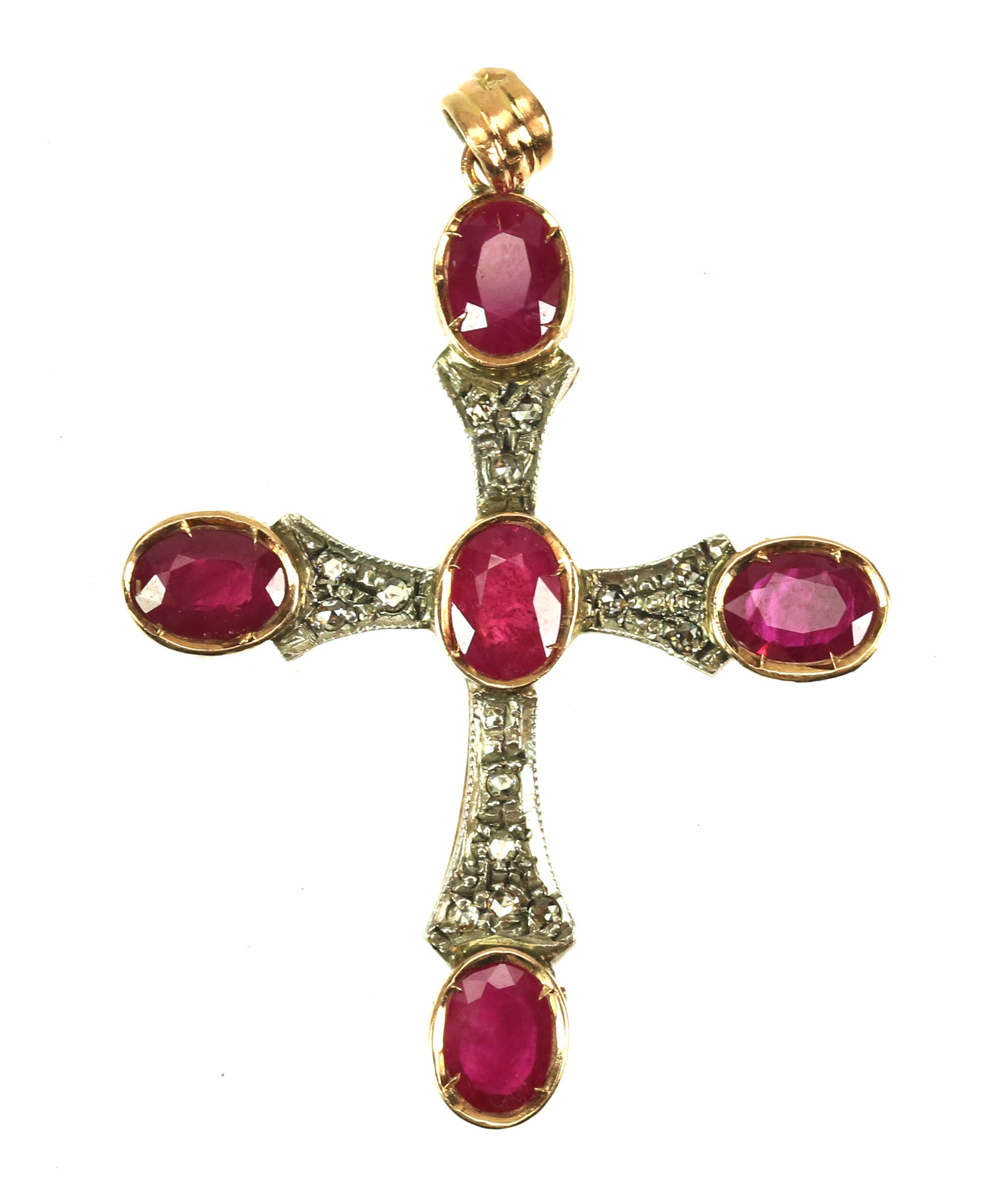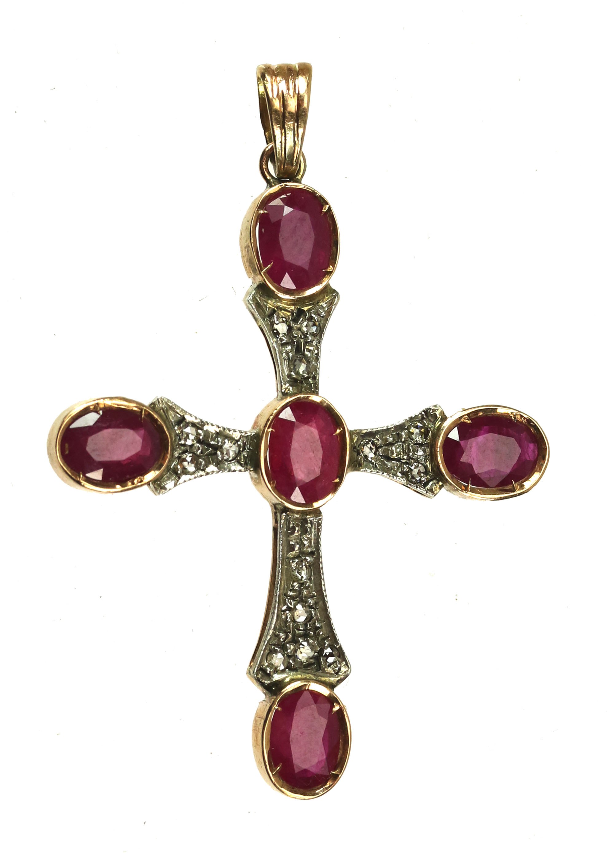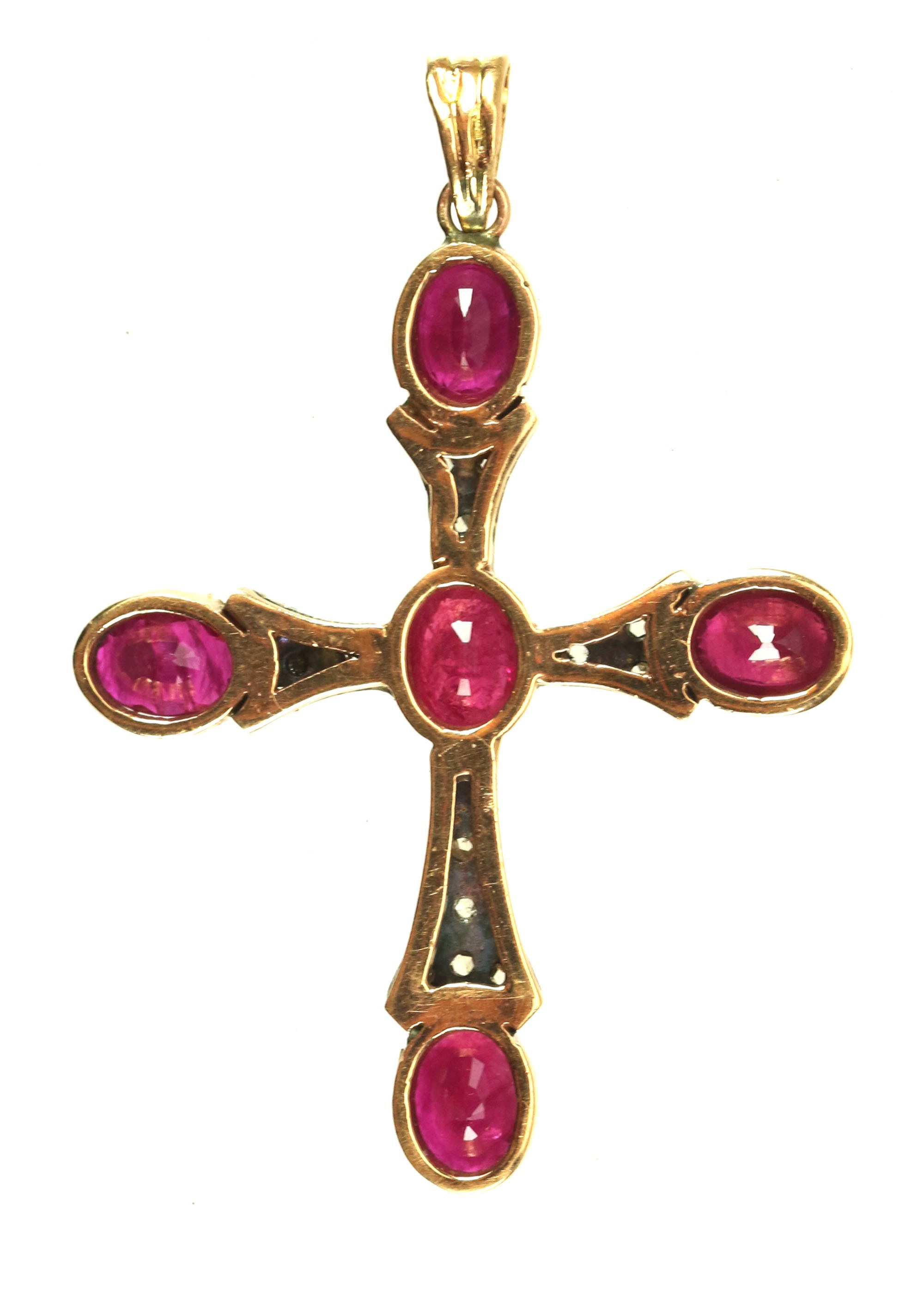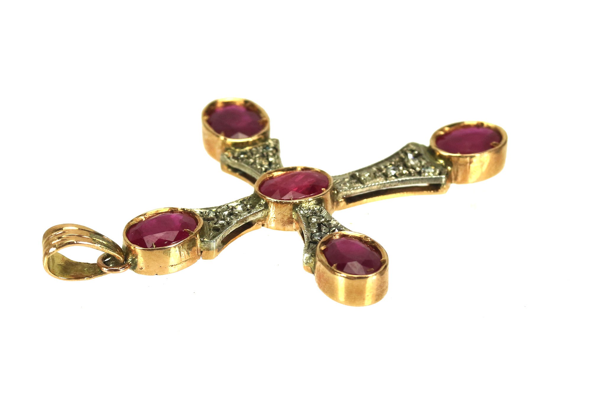 Krzyżyk złoty z rubinami oraz rautami diamentowymi