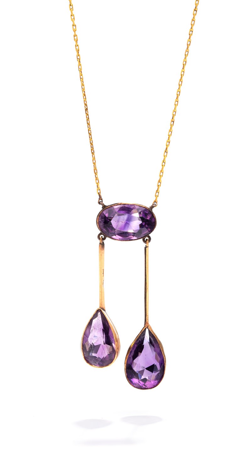 złoto pr. ~ 0,550, 3 ametysty 1 owal o wym.: 13 x 8 mm i 2 krople o wym.: 8 x 13 mm i 14 x 9 mm, masa: 5,29 g, dł. łańcuszka: 42 cm, wym. zawiesia: 4 x 1,7 cm