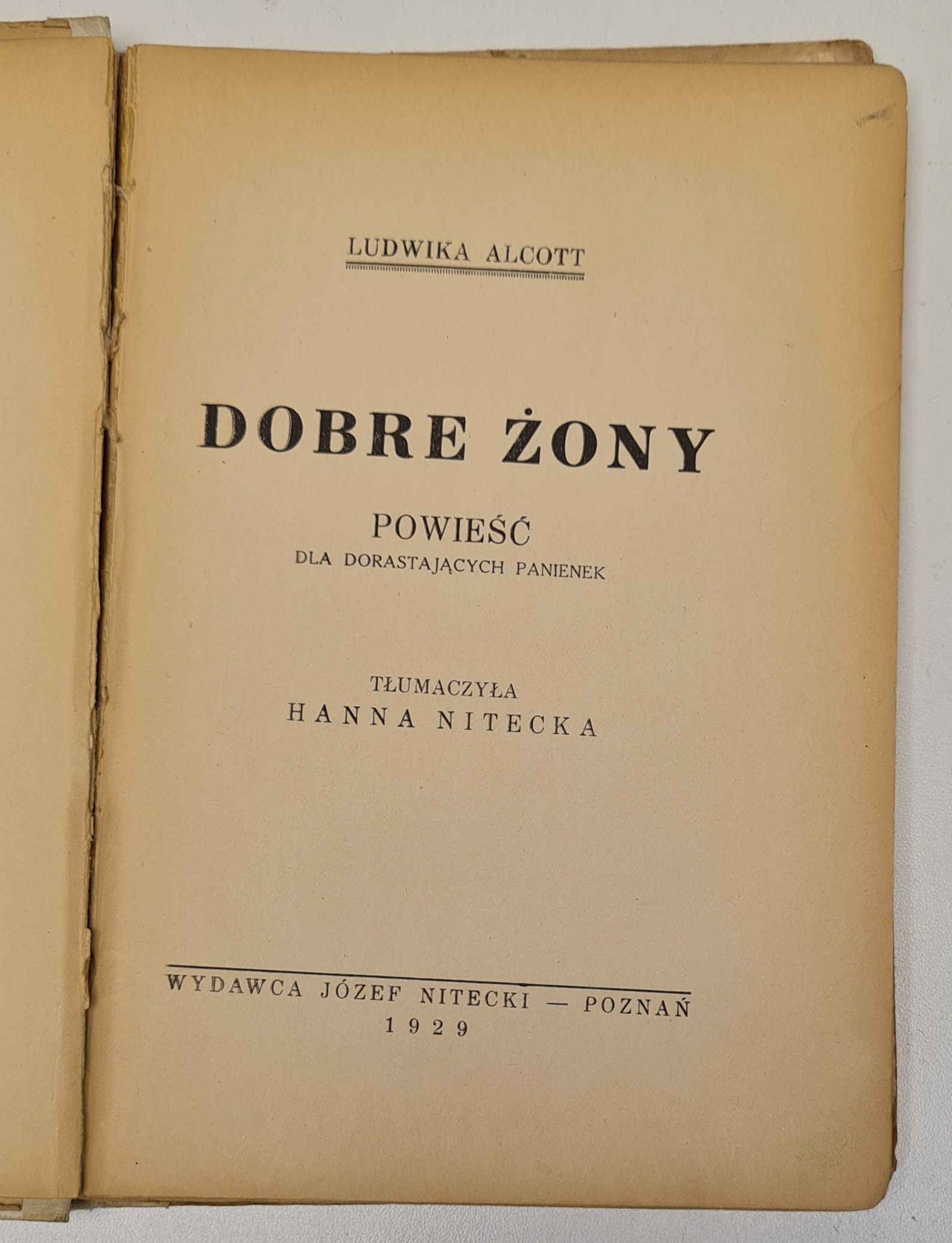 Alcott Ludwika - Dobre żony. Powieść dla dorastających panienek. Tłumaczyła Hanna Nitecka. Poznań 1929. Wydawca Józef Nitecki. Drukarnia Lotnicza. Wym. 15x21 cm. s. 155. Opr. wyd. ppłtn., barwy kremowej, na grzbiecie złocone napisy i skromne zdobienia, otarcia krawędzi. Blok nieco rozchwiany. Kontynuacją tej książki była powieść pt. „Mali mężczyźni”.