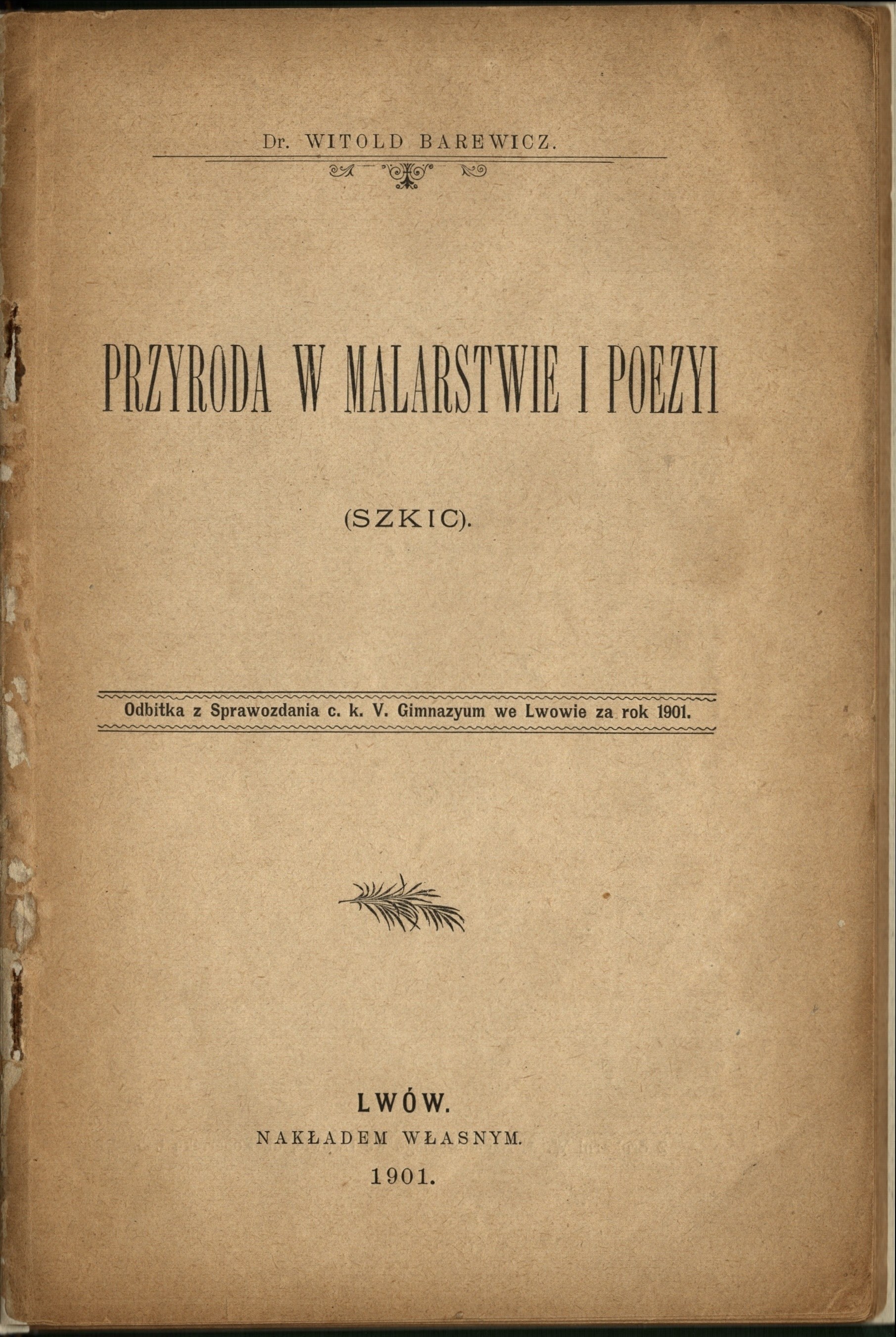 BAREWICZ Witold - Przyroda w malarstwie i poezyi (szkic). Odbitka z Sprawozdania c. k. V. Gimnazyum we Lwowie za rok 1901. Lwów 1901. Nakładem własnym. Z drukarni W. A. Szyjkowskiego we Lwowie.