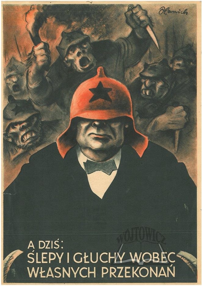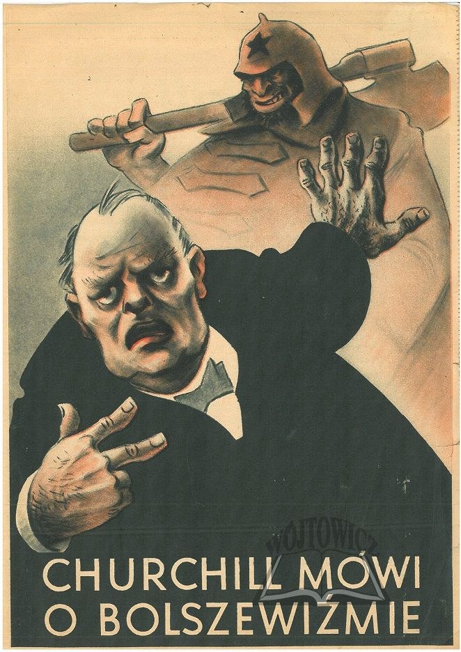 Niew. naddarcia. Stan dobry. Ulotka krytykująca premiera Anglii za stosunek do bolszewizmu. Zawiera cytaty z mów Churchilla krytykujące Bolszewików za okres 1918-1940, zaś na ostatniej stronie znacząca scena z napisem: "A dziś: ślepy i głuchy wobec własnych przekonań". 9925/28