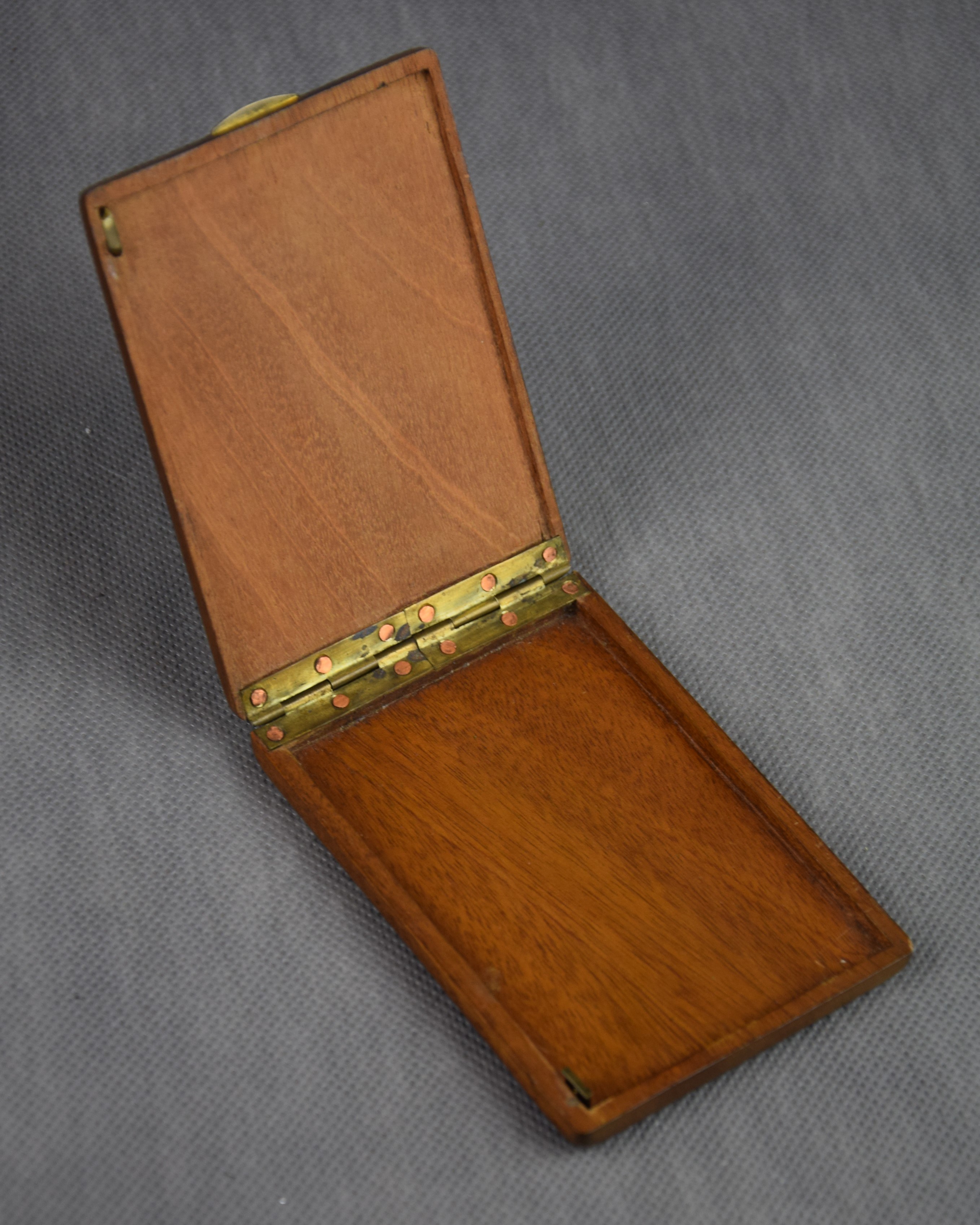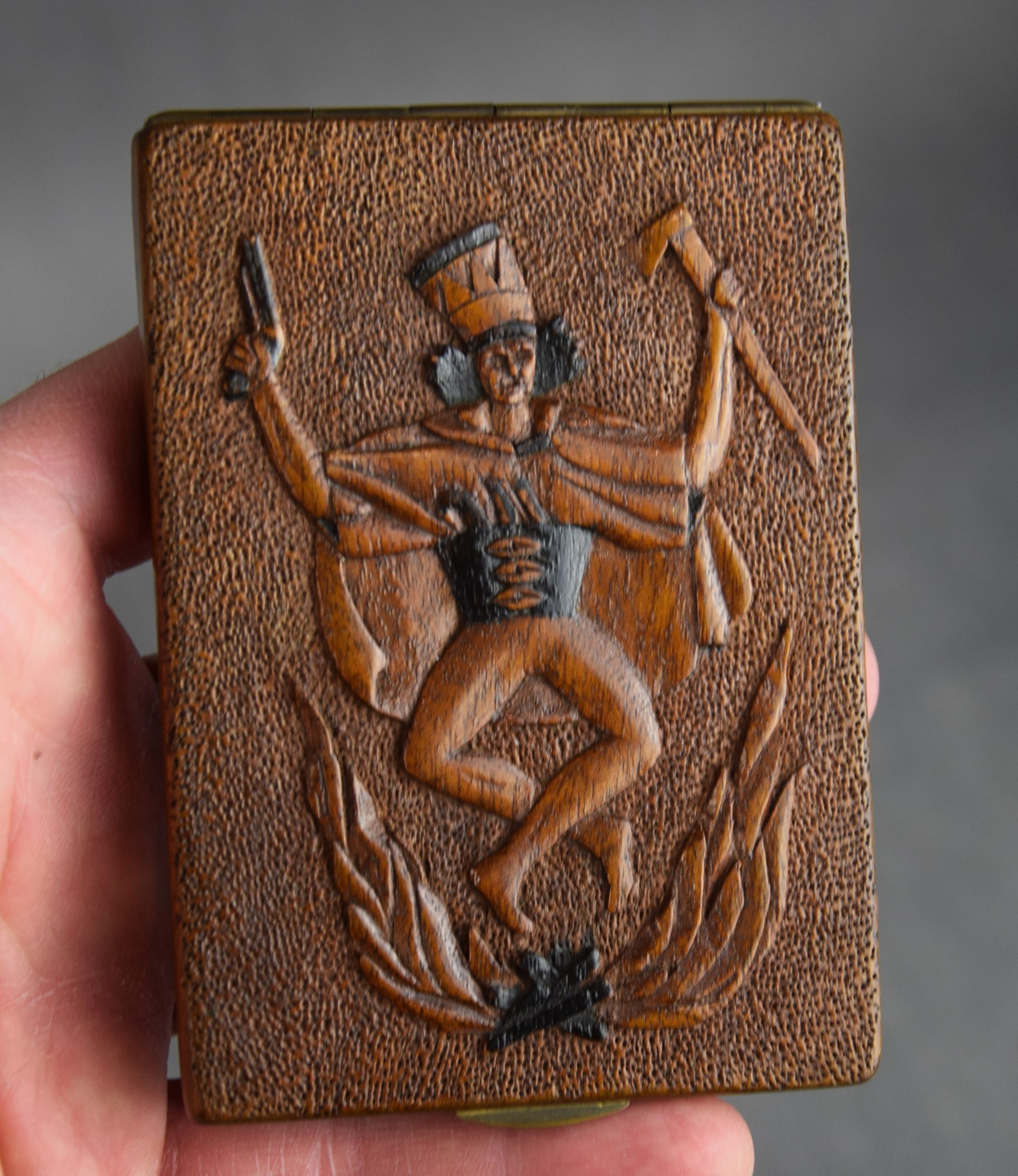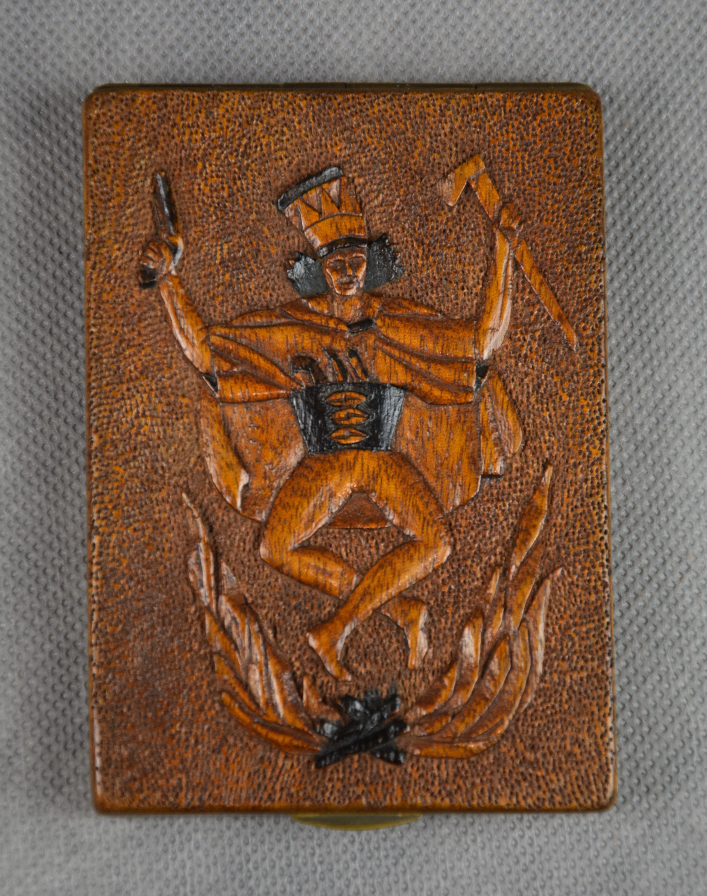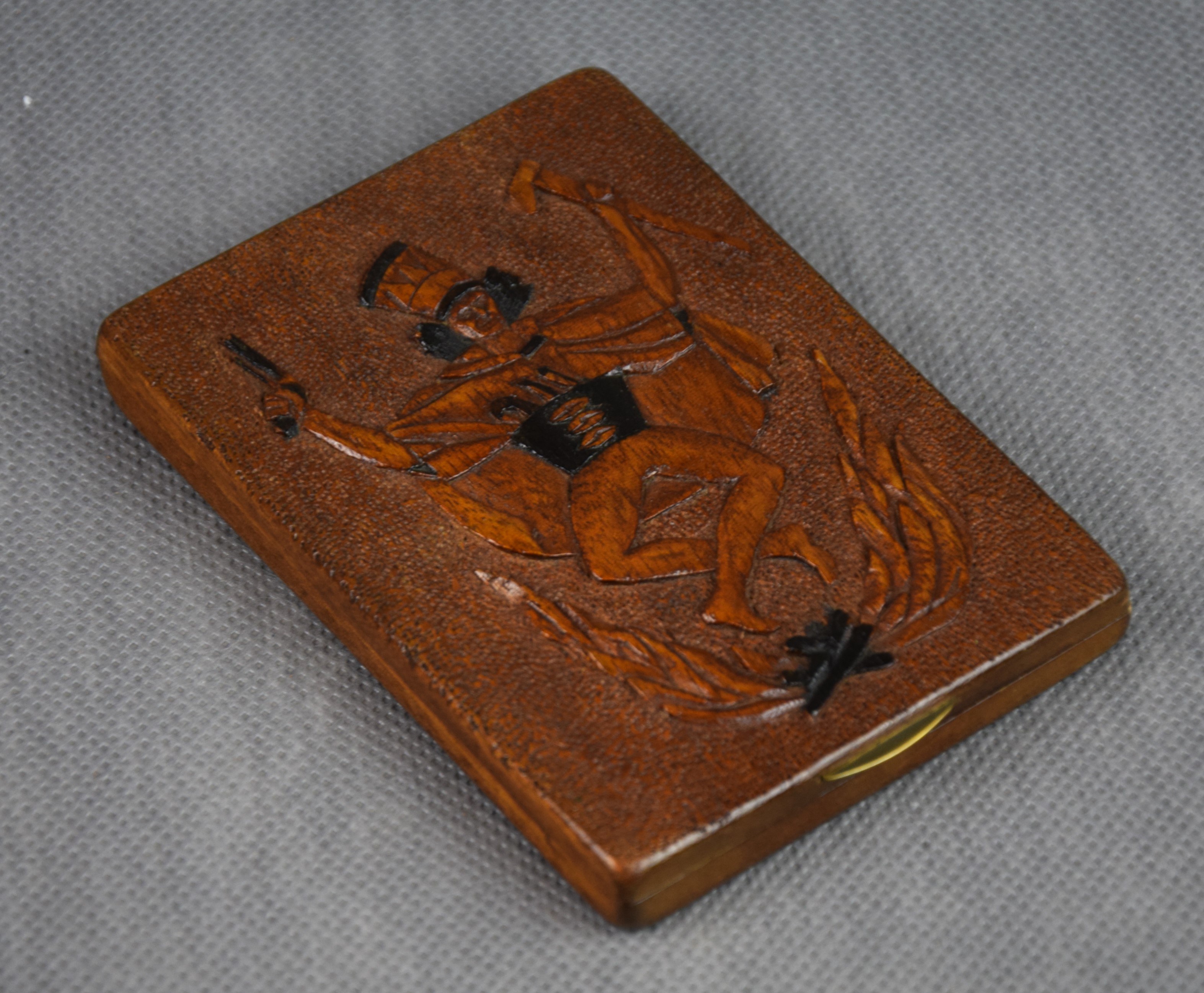 Papierośnica rzeźbiona w drewnie z reliefowo pokazanym Tańcem zbójnickim.