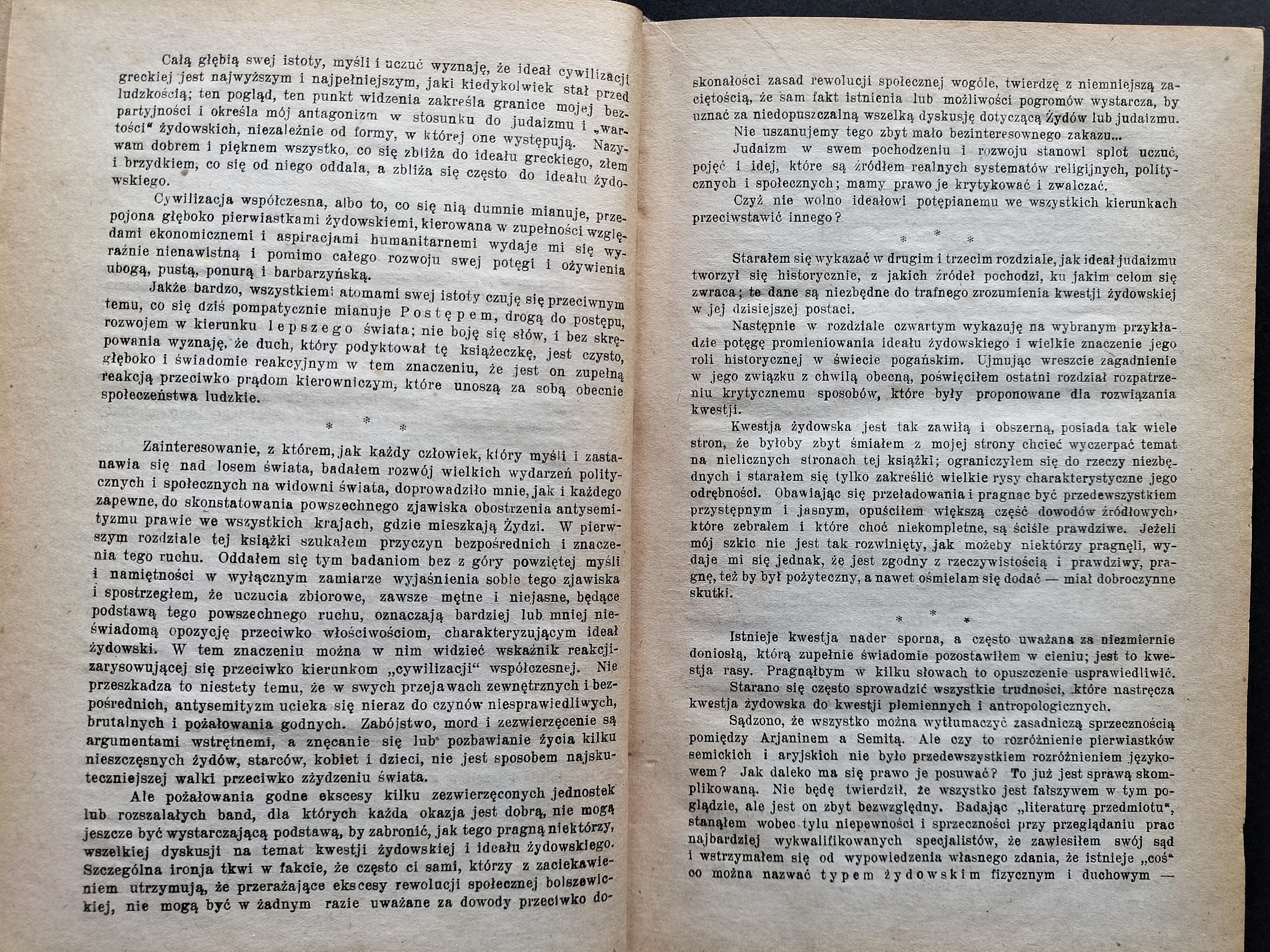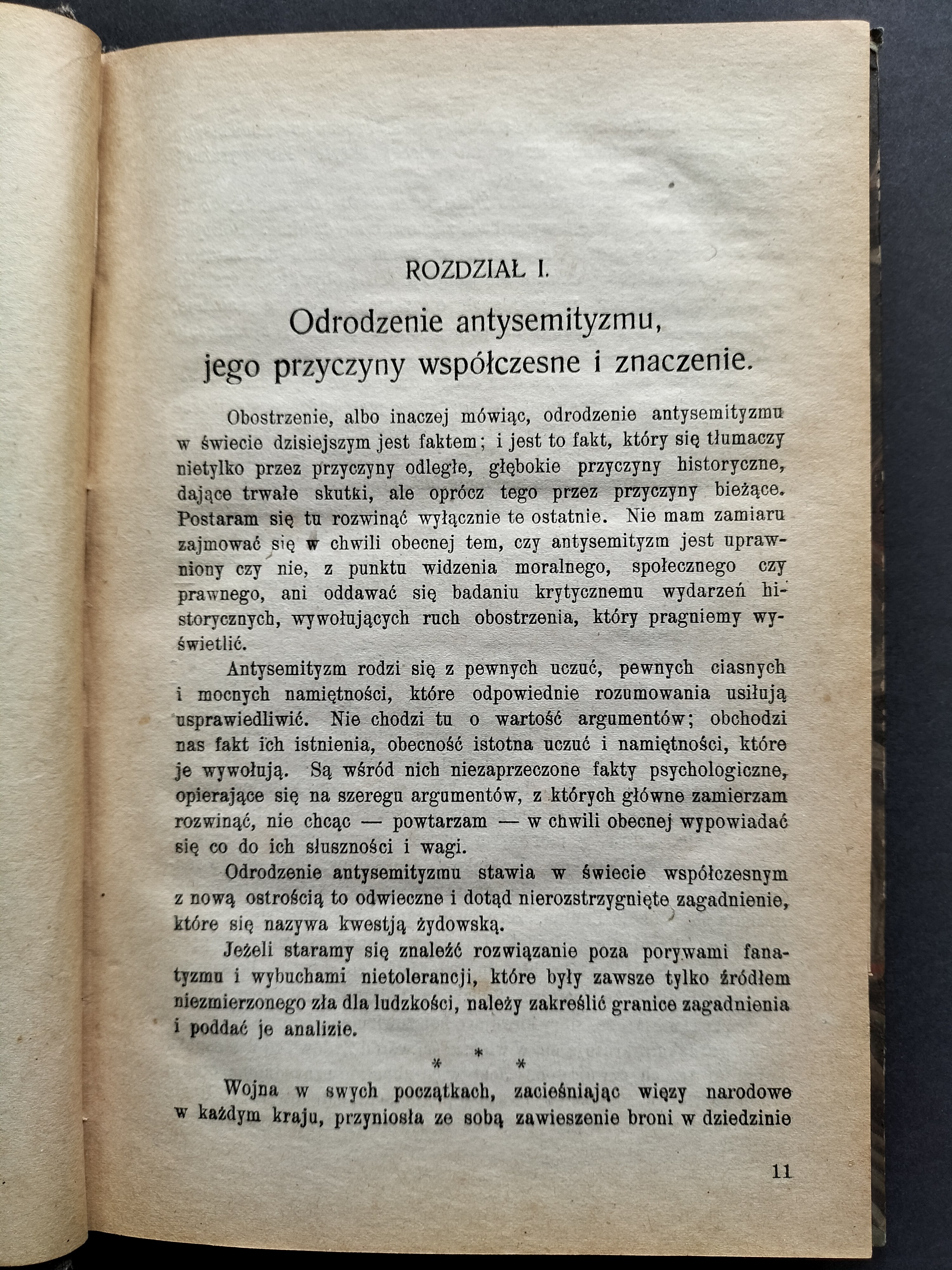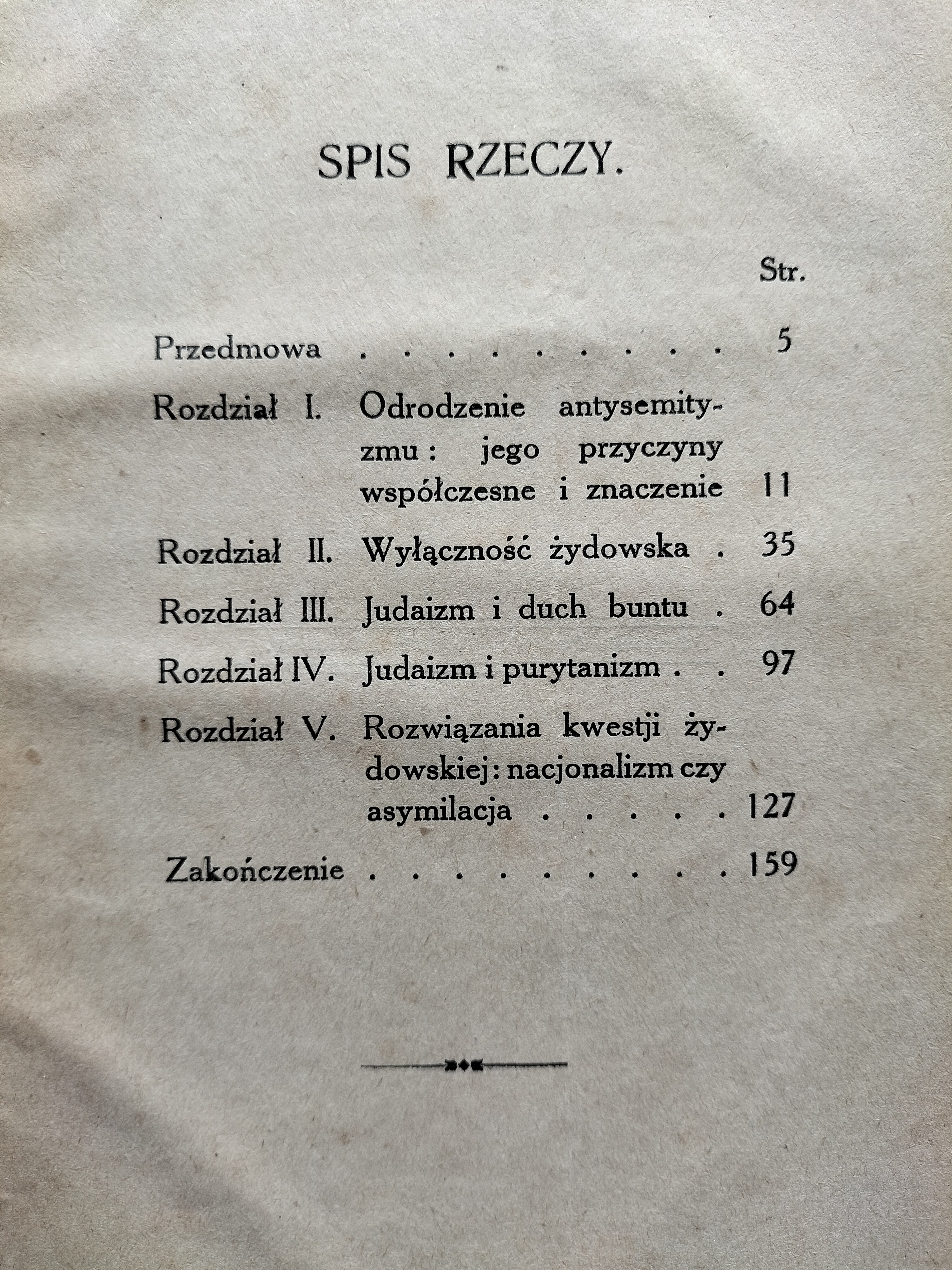 Treść: Odrodzenie antysemityzmu: jego przyczyny współczesne i znaczenie. Wyłączność żydowska. Judaizm i duch buntu. Judaizm i purytanizm. Rozwiązania kwestji żydowskiej : nacjonalizm czy asymilacja.