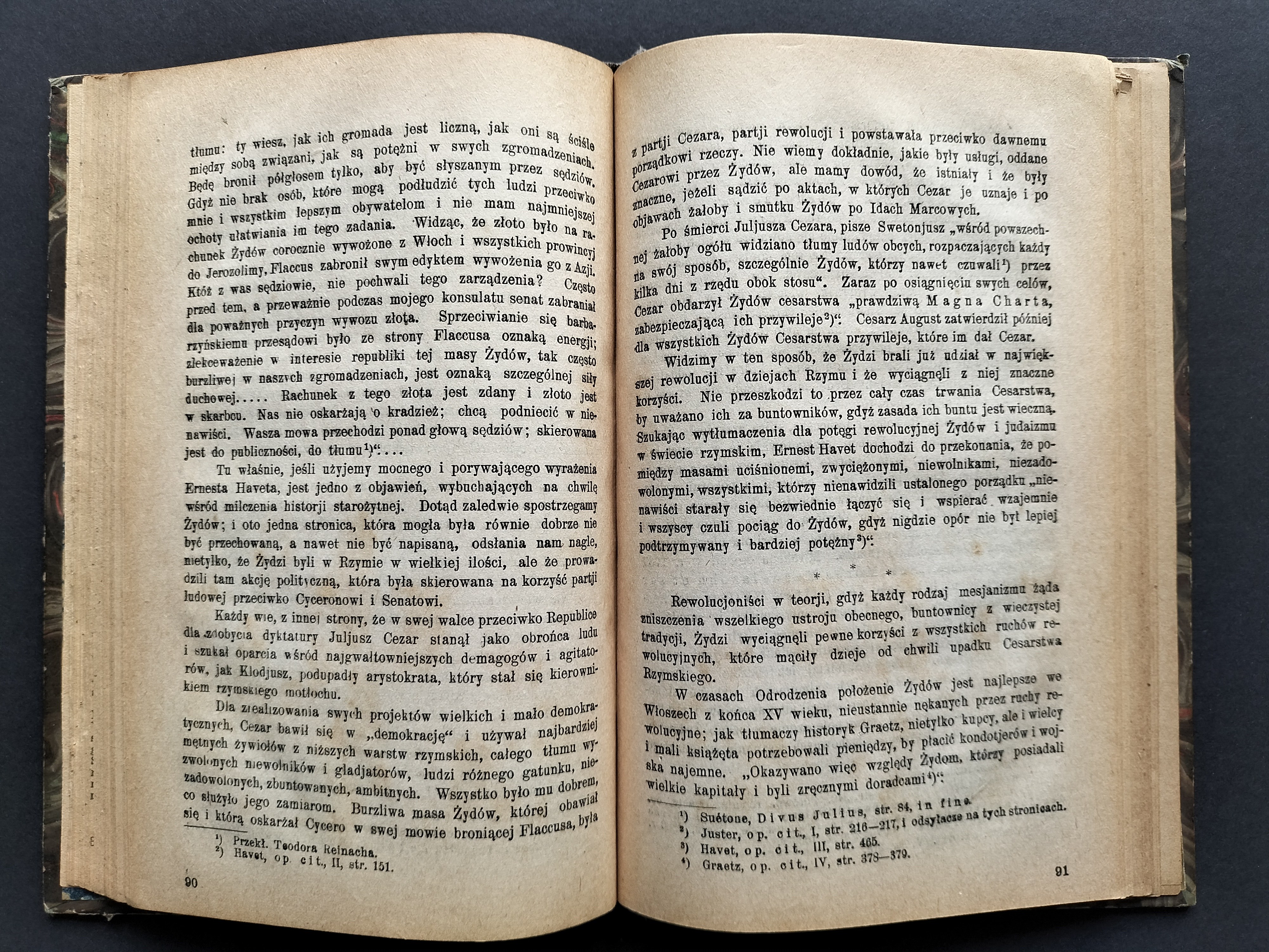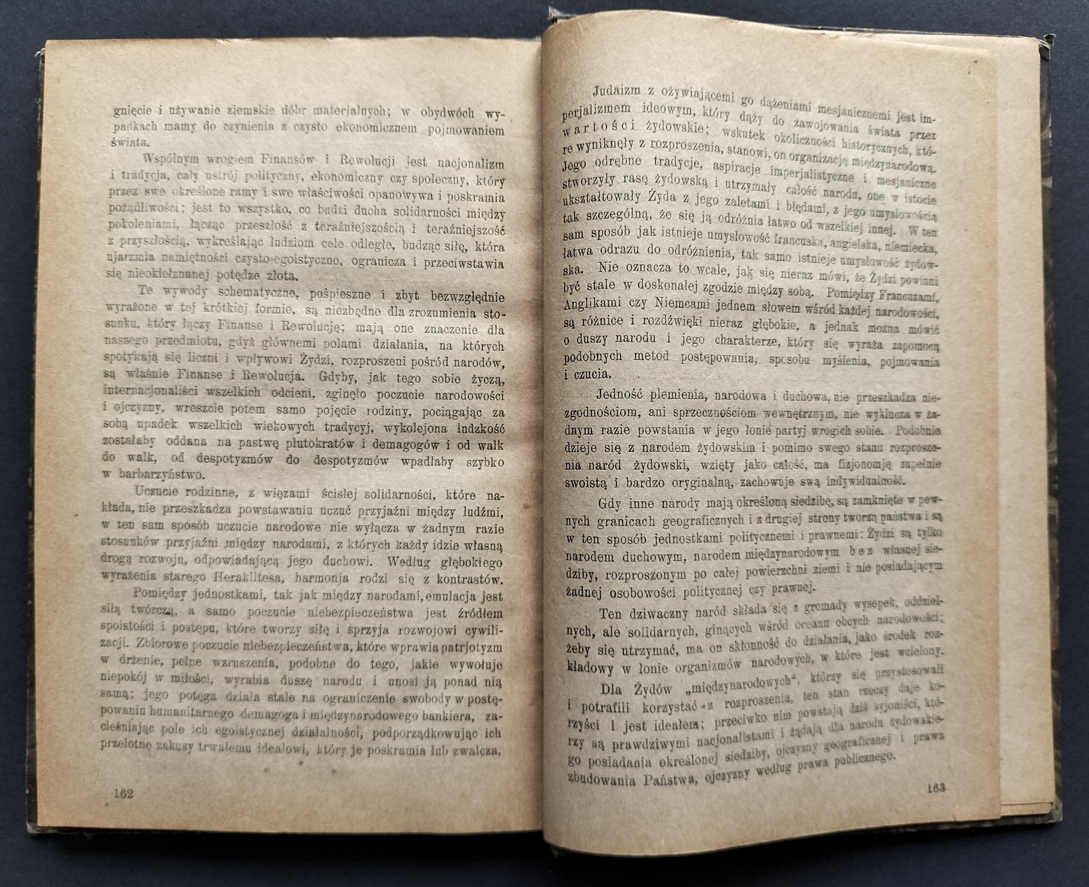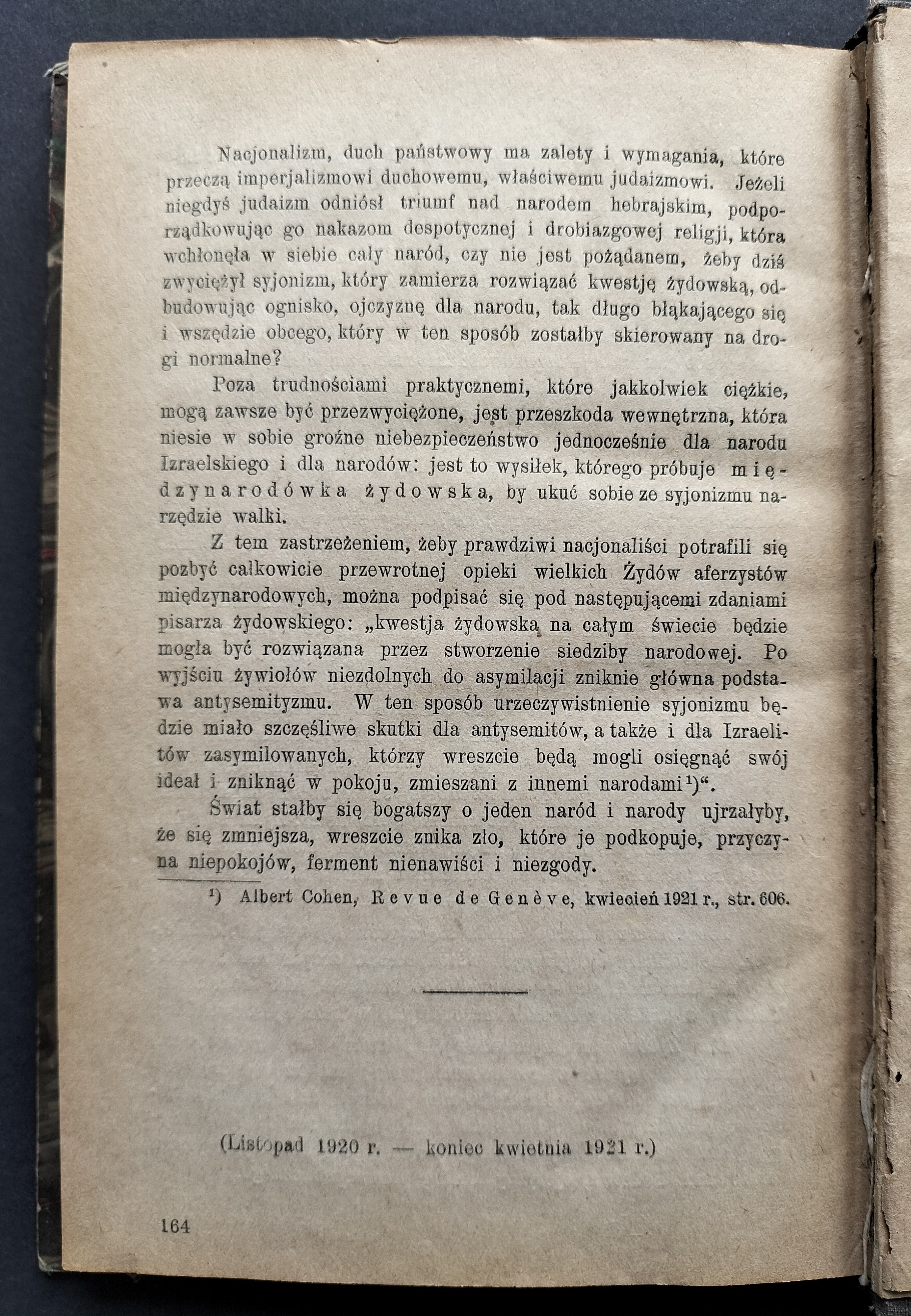 Fragment:"Nacjonalizm, duch państwowy ma zalety i wymagania, które przeczą imperjalizmowi duchowemu, właściwemu judaizmowi. Jeżeli niegdyś judaizm odniósł triumf nad narodem hebrajskim, podporządkowując go nakazom despotycznej i drobiazgowej religji, która wchłonęła w siebie cały naród, czy nie jest pożądanem, żeby dziś zwyciężył syjonizm, który zamierza rozwiązać kwestję żydowską, odbudowując ognisko, ojczyznę dla narodu, tak długo błąkającego się i wszędzie obcego, który w ten sposób zostałby skierowany na dro-gi normalne? Poza trudnościami praktycznemi, które jakkolwiek ciężkie, mogą zawsze być przezwyciężone, jest przeszkoda wewnętrzna, która niesie w sobie groźne niebezpieczeństwo jednocześnie dla narodu Izraelskiego i dla narodów: jest to wysiłek, którego próbuje międzynarodówka żydowska, by ukuć sobie ze syjonizmu narzędzie walki. Z tem zastrzeżeniem, żeby prawdziwi nacjonaliści potrafili się pozbyć całkowicie przewrotnej opieki wielkich Żydów aferzystów międzynarodowych, można podpisać się pod następującemi zdaniami pisarza żydowskiego: „kwestja żydowska na całym świecie będzie mogła być rozwiązana przez stworzenie siedziby narodowej. Po wyjściu żywiołów niezdolnych do asymilacji zniknie główna podstawa antysemityzmu. W ten sposób urzeczywistnienie syjonizmu będzie miało szczęśliwe skutki dla antysemitów, a także i dla Izraelitów zasymilowanych, którzy wreszcie będą mogli osięgnąć swój ideał i zniknąć w pokoju, zmieszani z innemi narodami". Świat stałby się bogatszy o jeden naród i narody ujrzałyby, że się zmniejsza, wreszcie znika zło, które je podkopuje, przyczy-na niepokojów, ferment nienawiści i niezgody.".