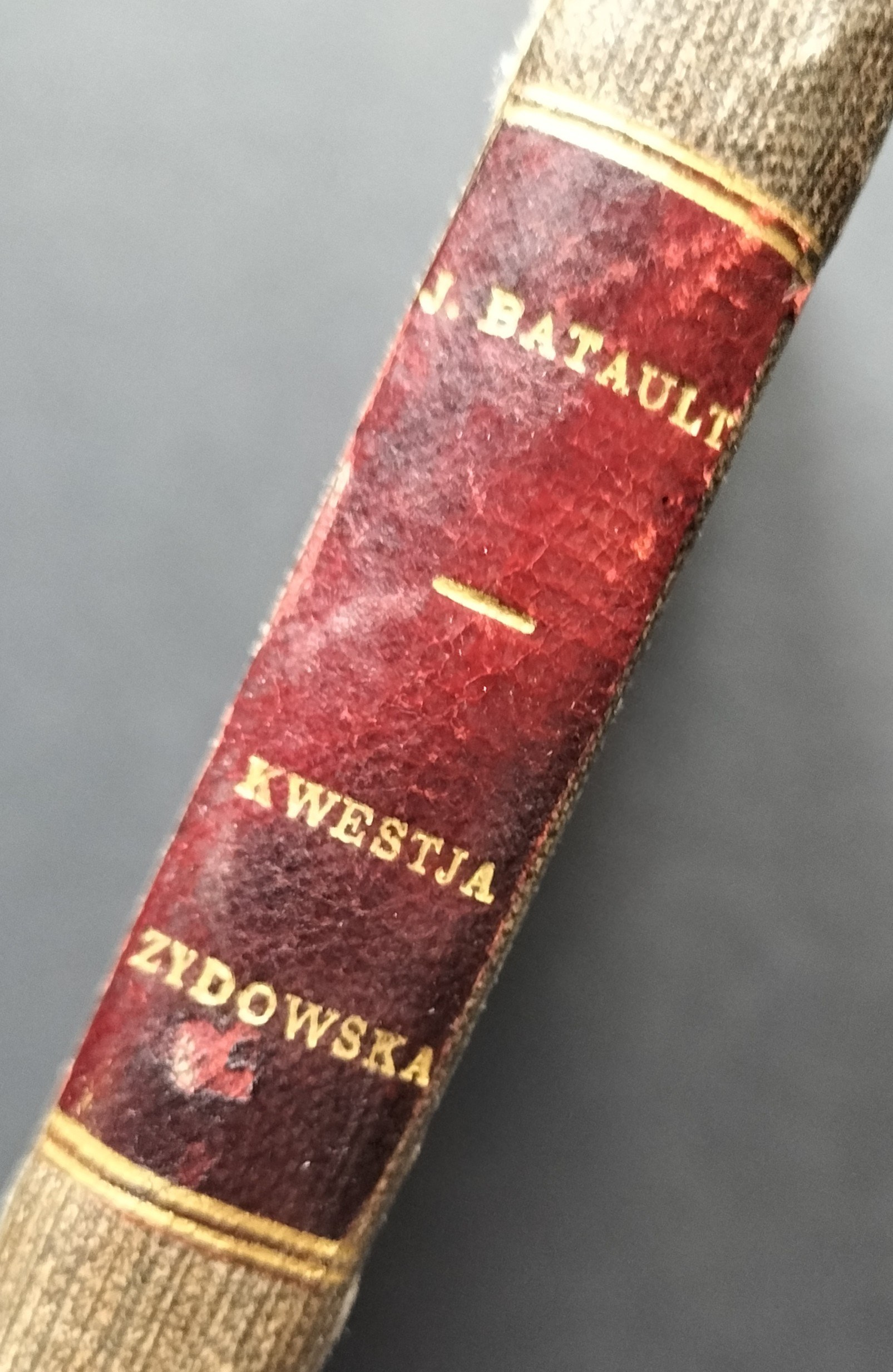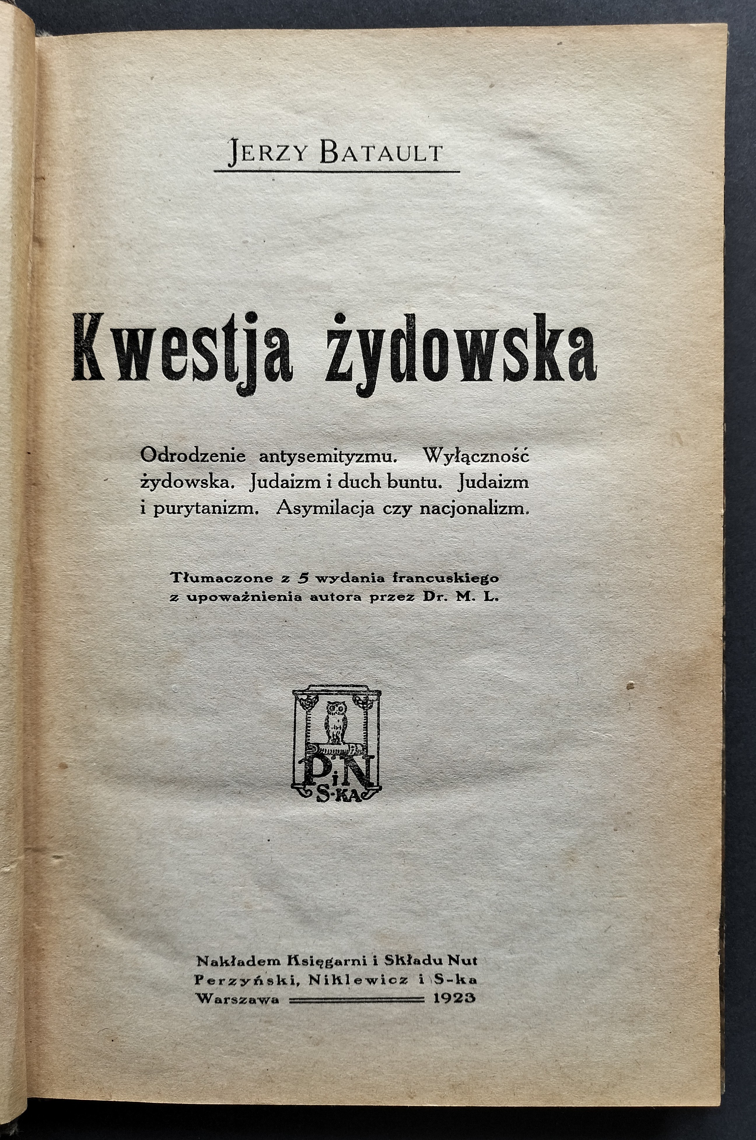 BATAULT Jerzy – Kwestja żydowska. Odrodzenie antysemityzmu. Wyłączność żydowska. Judaizm i duch buntu. Judaizm i purytanizm. Asymilacja czy nacjonalizm. Tłumaczono z 5 wydania francuskiego z upoważnienia autora przez Dr. M. L. Warszawa 1923. Nakładem Księgarni i Składu Nut Perzyński, Niklewicz i S-ka. Drukarnia Pomorska Tow. Akc. Grudziądz.